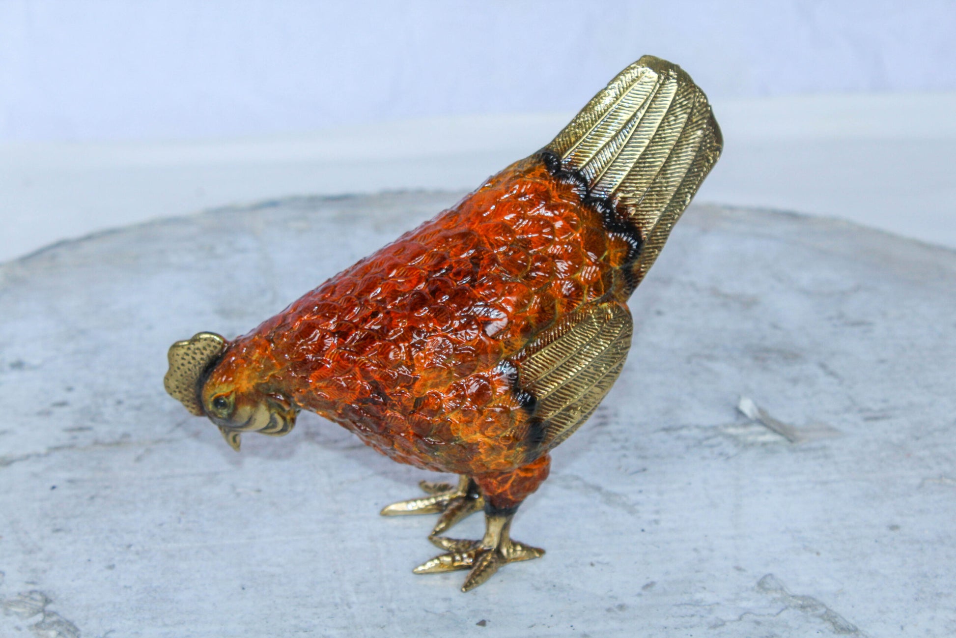 This elegant bronze chicken figurine features a rich red enamel body with gold-toned wings and tail for a detailed lifelike look. Compact in size but full of character, it makes a charming addition to any farmhouse or kitchen decor. A beautifully crafted piece made using the lost wax process and finished with colorful enamel to create a collectible heirloom-quality sculpture. Size: 8"L x 4"W x 7"H. Weight: 2Lb