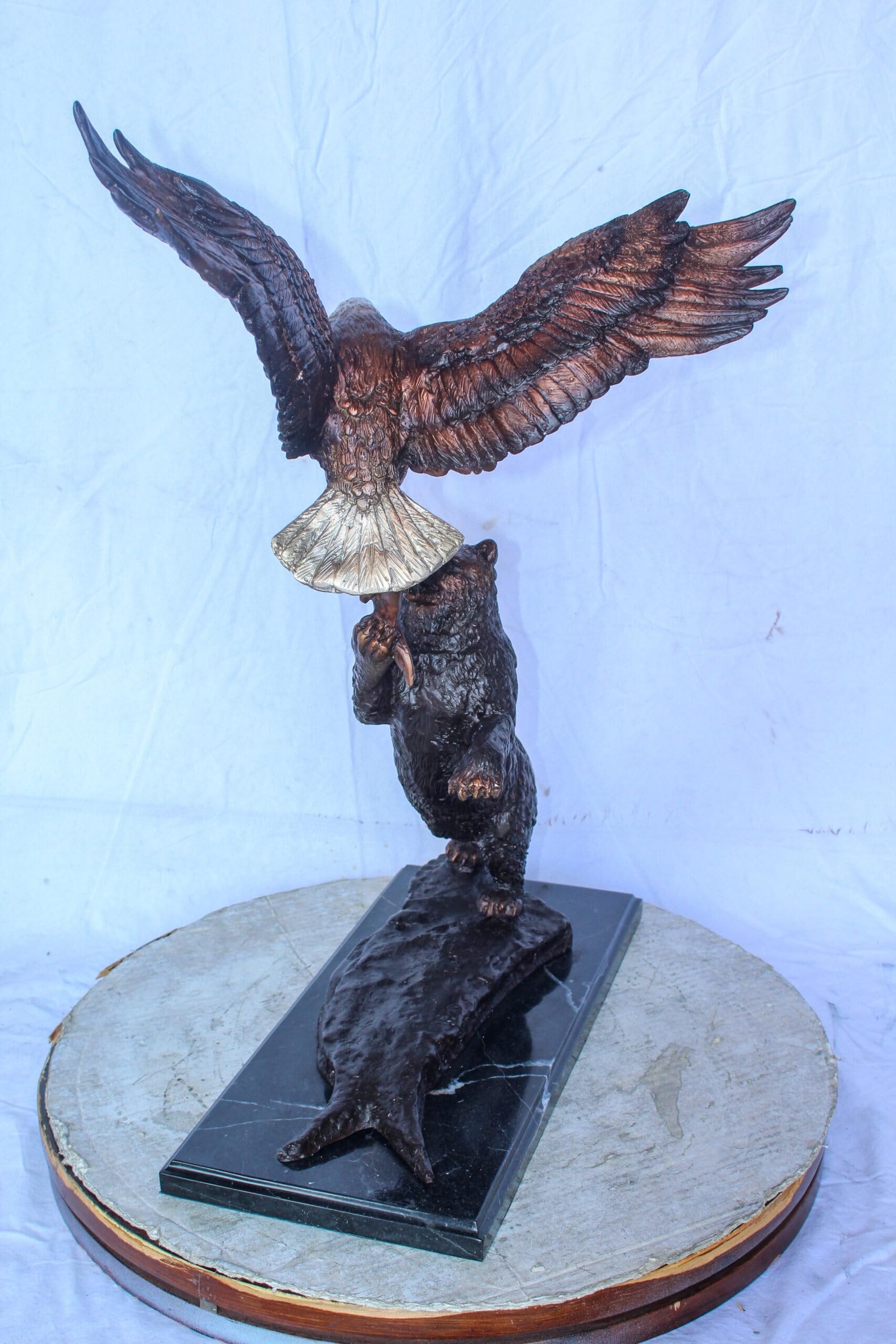 Bronze statue of an eagle and bear fighting for fish prey, handcrafted and casted using traditional lost wax method. This sculpture depicts a powerful and dynamic struggle between two iconic creatures of the wild, capturing the intensity and raw beauty of nature. Ideal for collectors and wildlife enthusiasts seeking a dramatic and symbolic piece of art. Size: 24"L x 9"W x 28"H. Weight: 37Lb