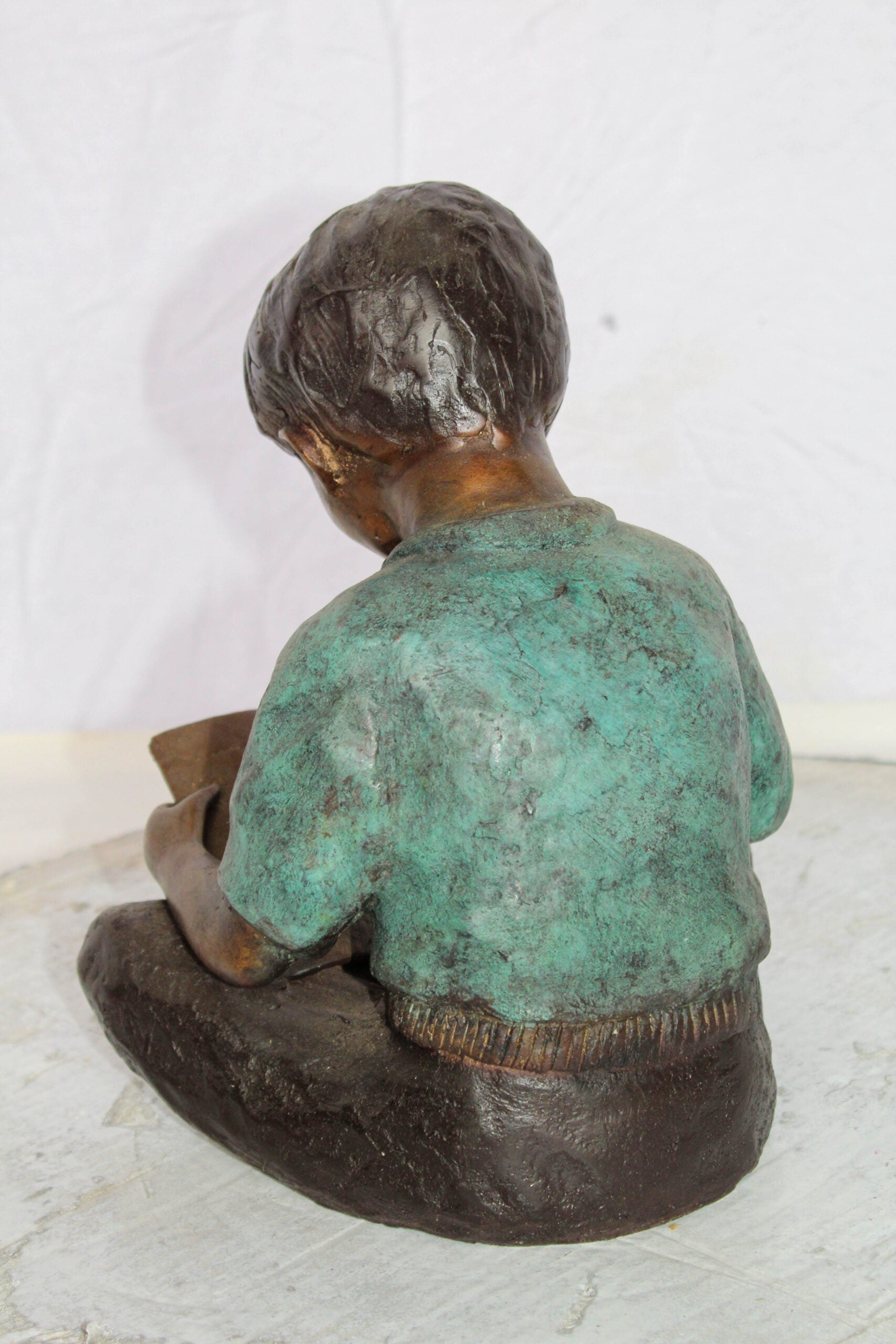 This charming bronze statue depicts a young boy reading, captured in a quiet, thoughtful pose. Made using the traditional lost wax method and finished with a hand-applied patina. Compact in size, as shown next to a soda can for scale, it’s ideal for bookshelves, desks, or educational settings. A heartfelt piece celebrating learning and childhood. Size: 9"L x 8"W x 11"H. Weight: 10Lb