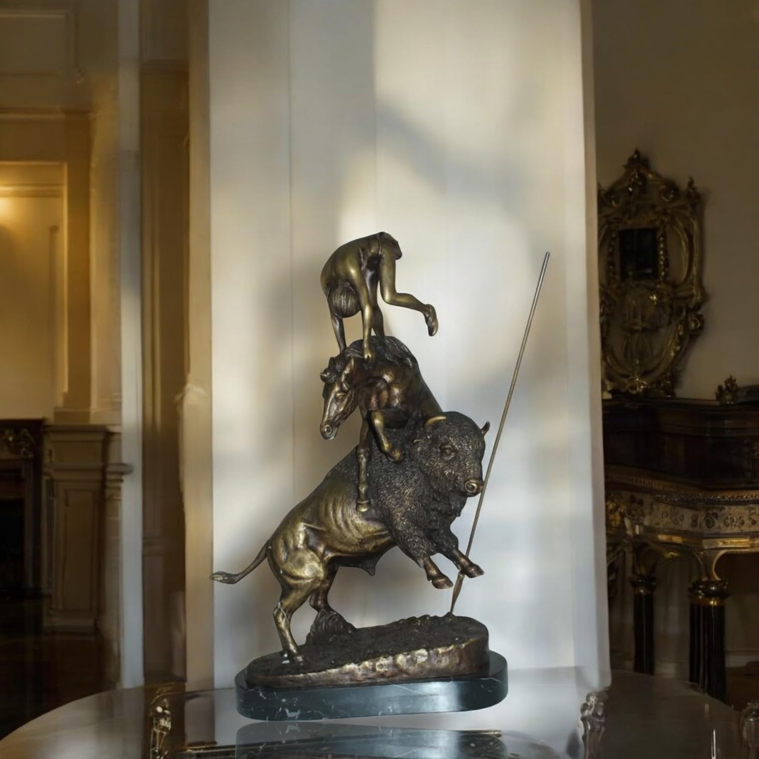𝗣𝗥𝗘𝗠𝗜𝗨𝗠 𝗕𝗥𝗢𝗡𝗭𝗘 𝗖𝗥𝗔𝗙𝗧𝗦𝗠𝗔𝗡𝗦𝗛𝗜𝗣: The Buffalo Horse by Remington Bronze Statue is crafted from high-quality bronze using the lost-wax casting technique. This ensures exceptional durability and precise detailing, making it a timeless piece of art for collectors and enthusiasts alike.𝗜𝗡𝗧𝗥𝗜𝗖𝗔𝗧𝗘 𝗗𝗘𝗧𝗔𝗜𝗟𝗜𝗡𝗚 𝗔𝗡𝗗 𝗧𝗘𝗫𝗧𝗨𝗥𝗘𝗦: Our product captures the intricate textures of the buffalo’s fur and the horse’s flowing mane. The fine craftsmanship brings out every detail, highlighting the raw power and beauty of these iconic animals, making the sculpture truly lifelike.𝗦𝗧𝗥𝗜𝗞𝗜𝗡𝗚 𝗦𝗜𝗭𝗘 𝗔𝗡𝗗 𝗣𝗥𝗘𝗦𝗘𝗡𝗖𝗘: This product stands at 20" tall, with a length of 14" and width of 6". The substantial size and weight ensure the sculpture makes a bold statement in any space, whether it’s part of an art collection, displayed in a living room, or showcased in a gallery.𝗜𝗖𝗢𝗡𝗜𝗖 𝗪𝗘𝗦𝗧𝗘𝗥𝗡 𝗔𝗥𝗧 𝗦𝗖𝗘𝗡𝗘: The Buffalo Horse by Remington Bronze Statue is a tribute to the spirit of the American frontier. It captures the powerful connection between the buffalo and horse, making it an ideal piece for anyone passionate about western history and wildlife art.𝗩𝗘𝗥𝗦𝗔𝗧𝗜𝗟𝗘 𝗗𝗘𝗖𝗢𝗥 𝗔𝗡𝗗 𝗚𝗜𝗙𝗧 𝗢𝗣𝗧𝗜𝗢𝗡: This product is an ideal addition to any home, office, or gallery space. Its timeless design and historical significance make it a perfect gift for collectors, art lovers, or anyone who appreciates fine western art and sculpture.