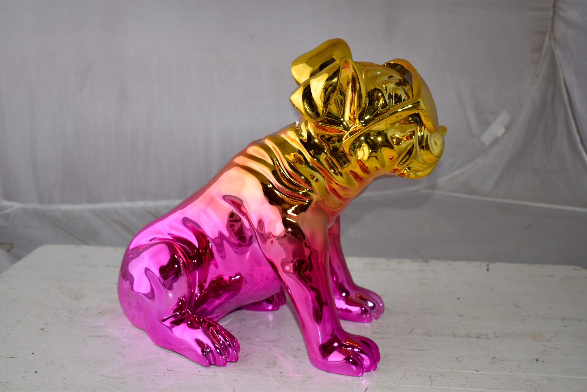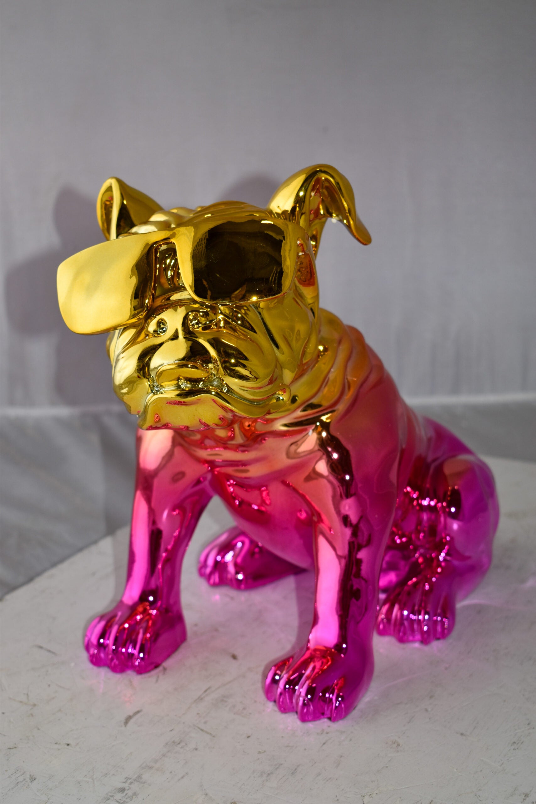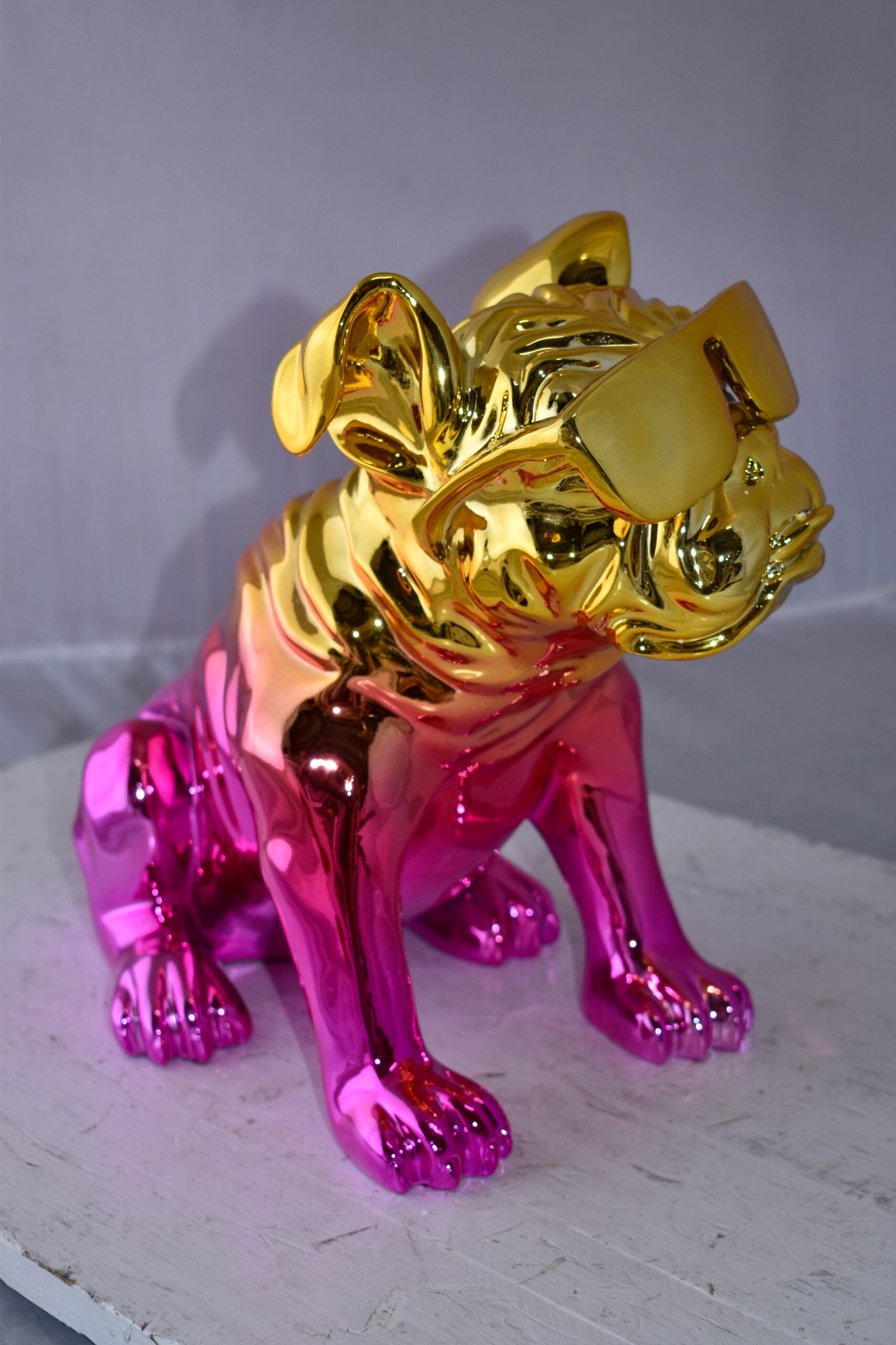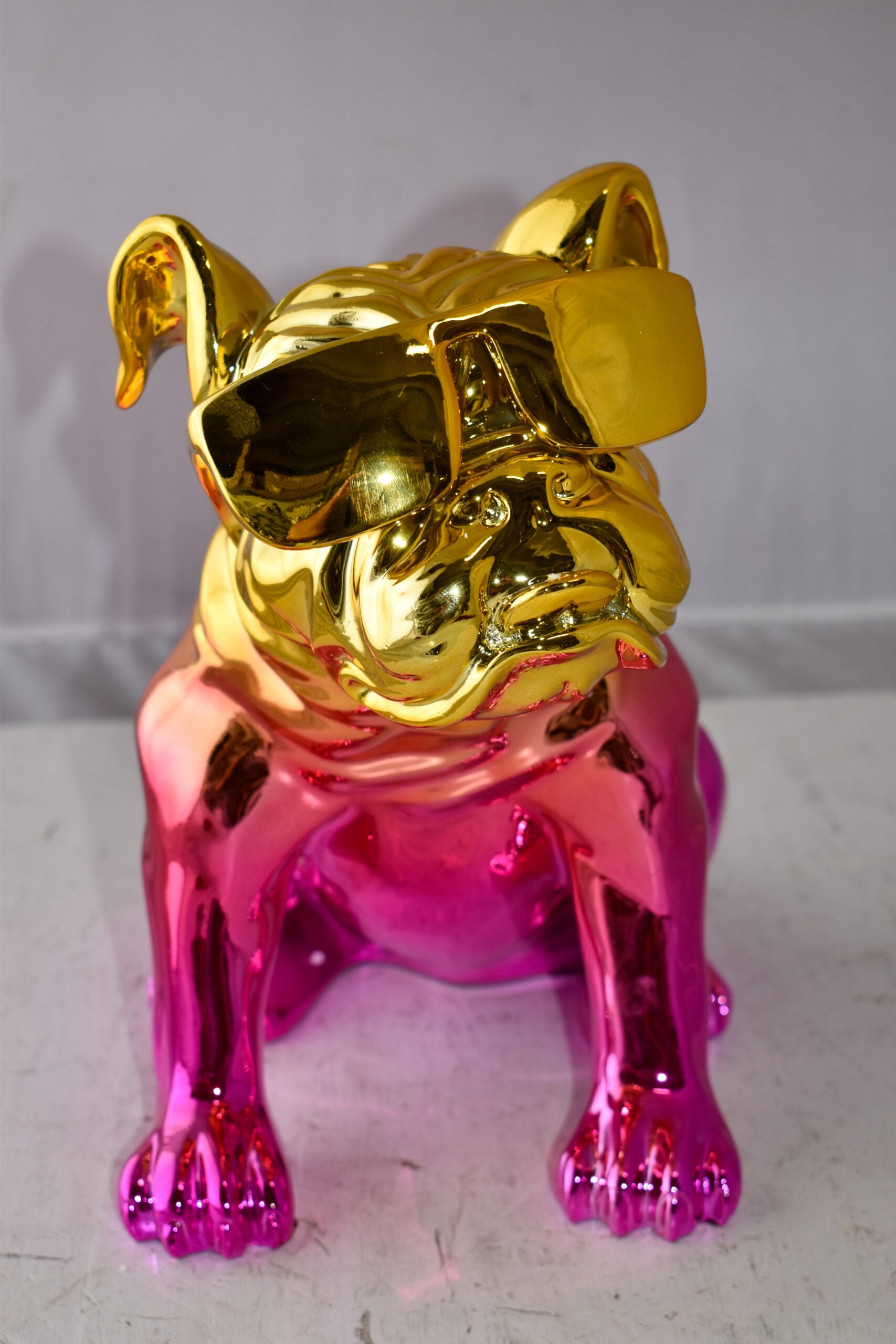 Bulldog With Sunglasses Colored Pink and Gold Resin Statue Size: 17" x 9" x 13"H