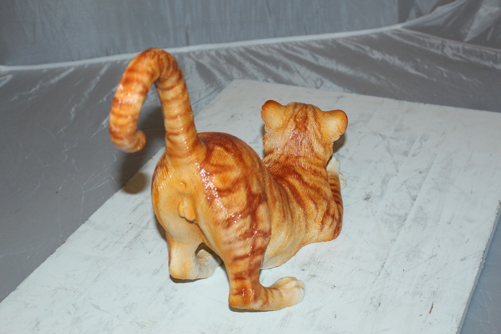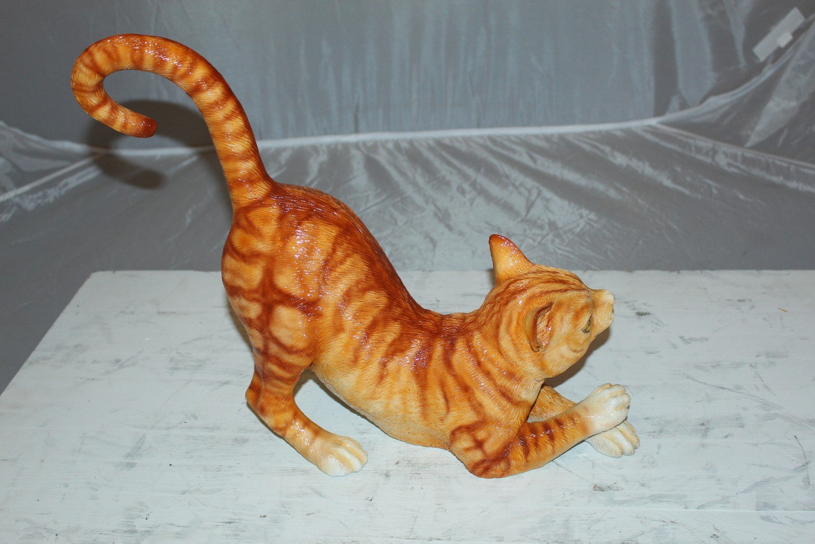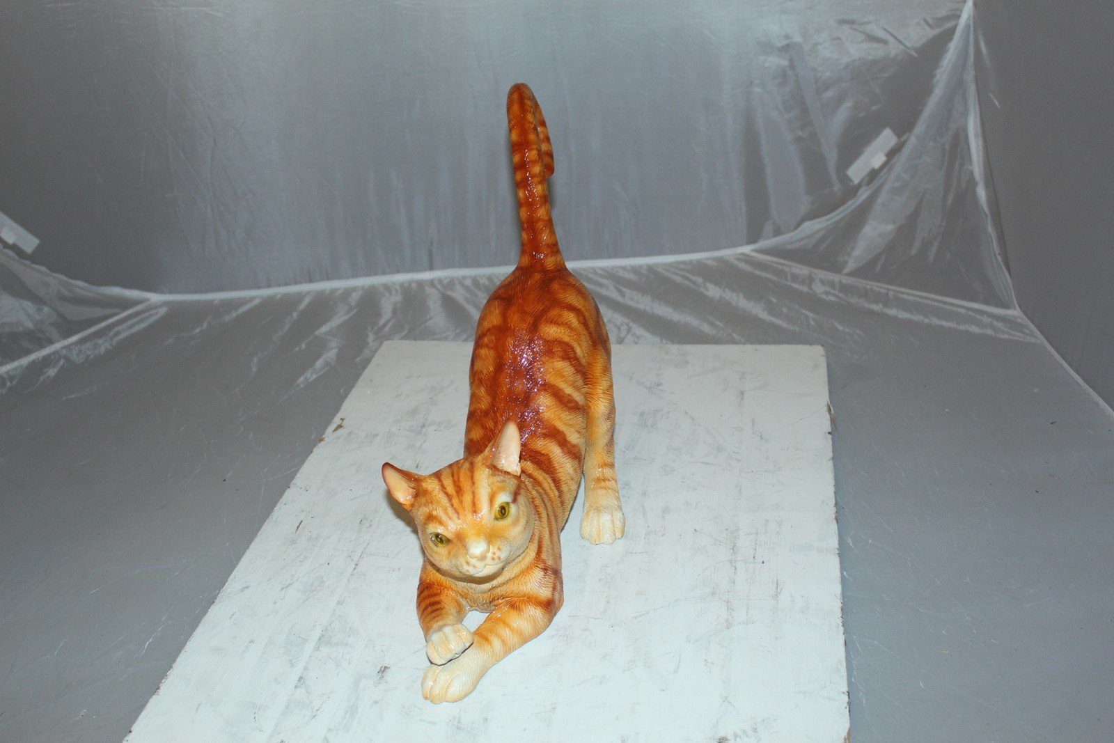 This squatting cat sculpture would fit perfectly in the home of any cat and/or animal lover! The cat is ready to pounce towards the sky, as if there's a ball or a loving owner waiting for him. This piece can fit great in the home, lawn, patio, or anywhere else. Size: 16"L x 6"W x 14"H. Weight is: 6Lb