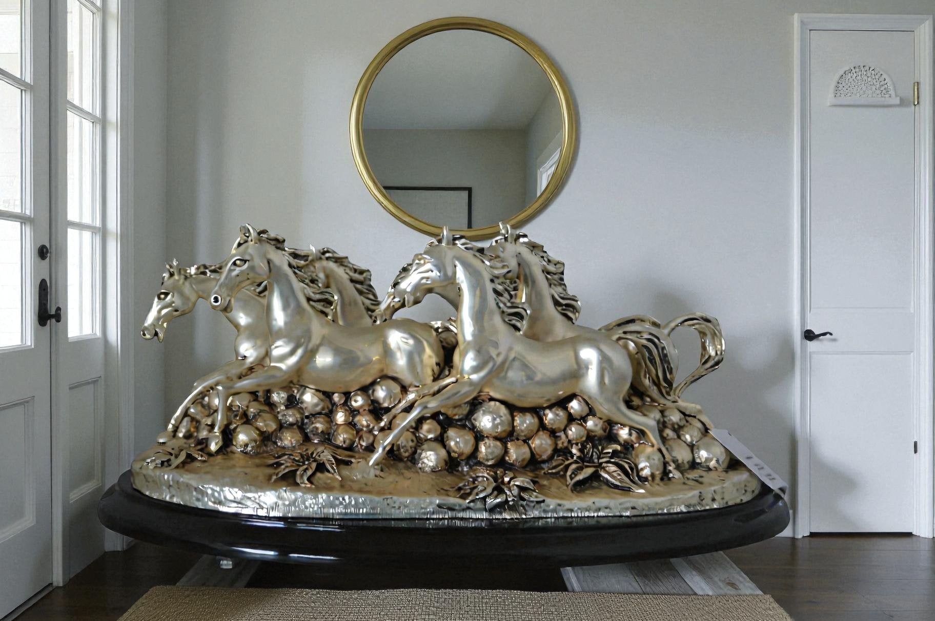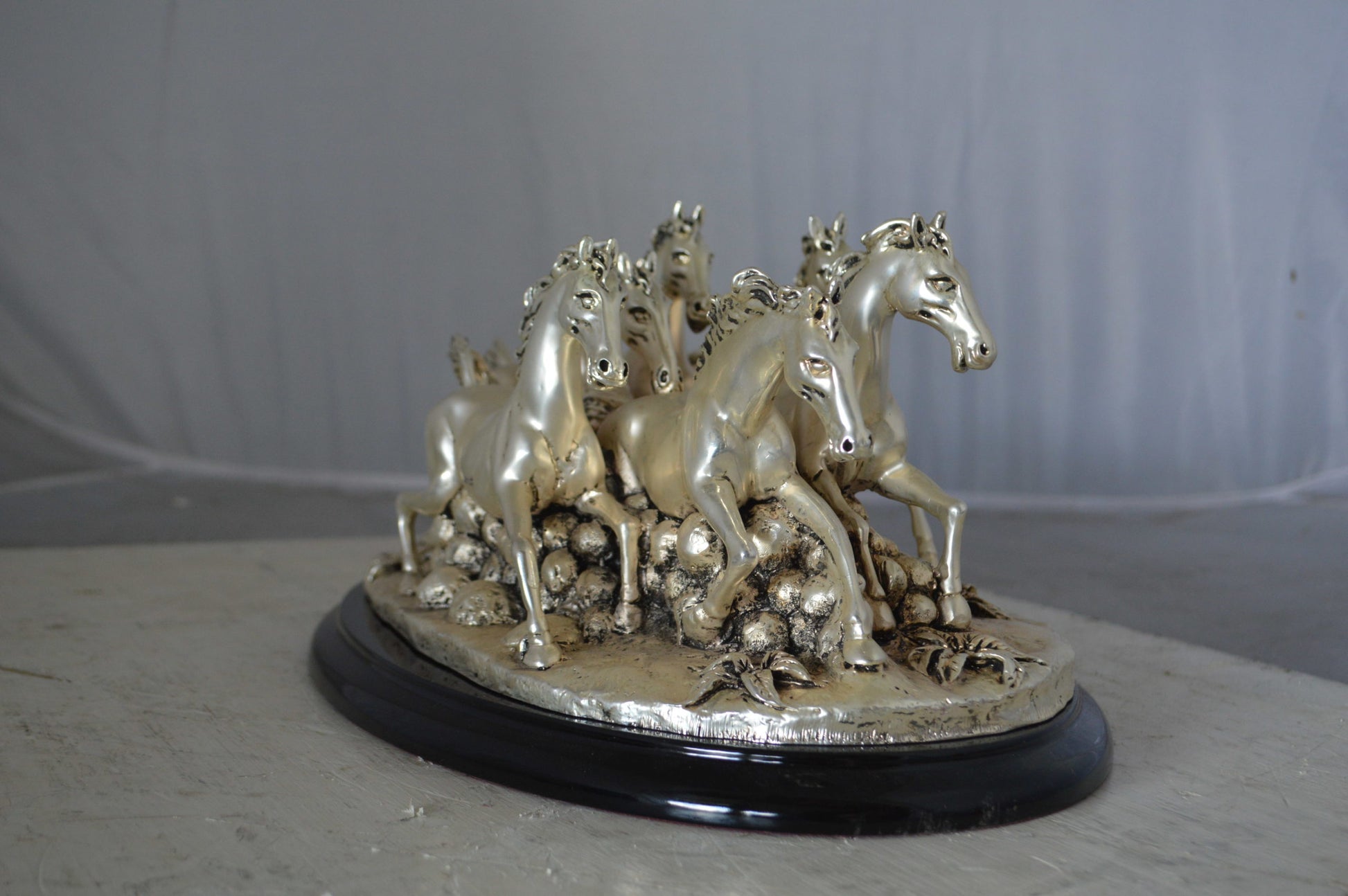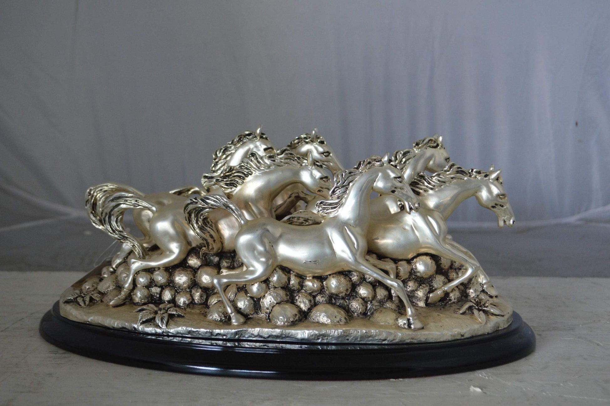 This resin statue is placed on a classy wooden base and uses a silver finish to display six mighty horses charging forward in stride. The craftwork in this piece makes it a powerful and eloquent addition to any room Size: 17"L x 10"W x 5"H. Weight is: 7Lb