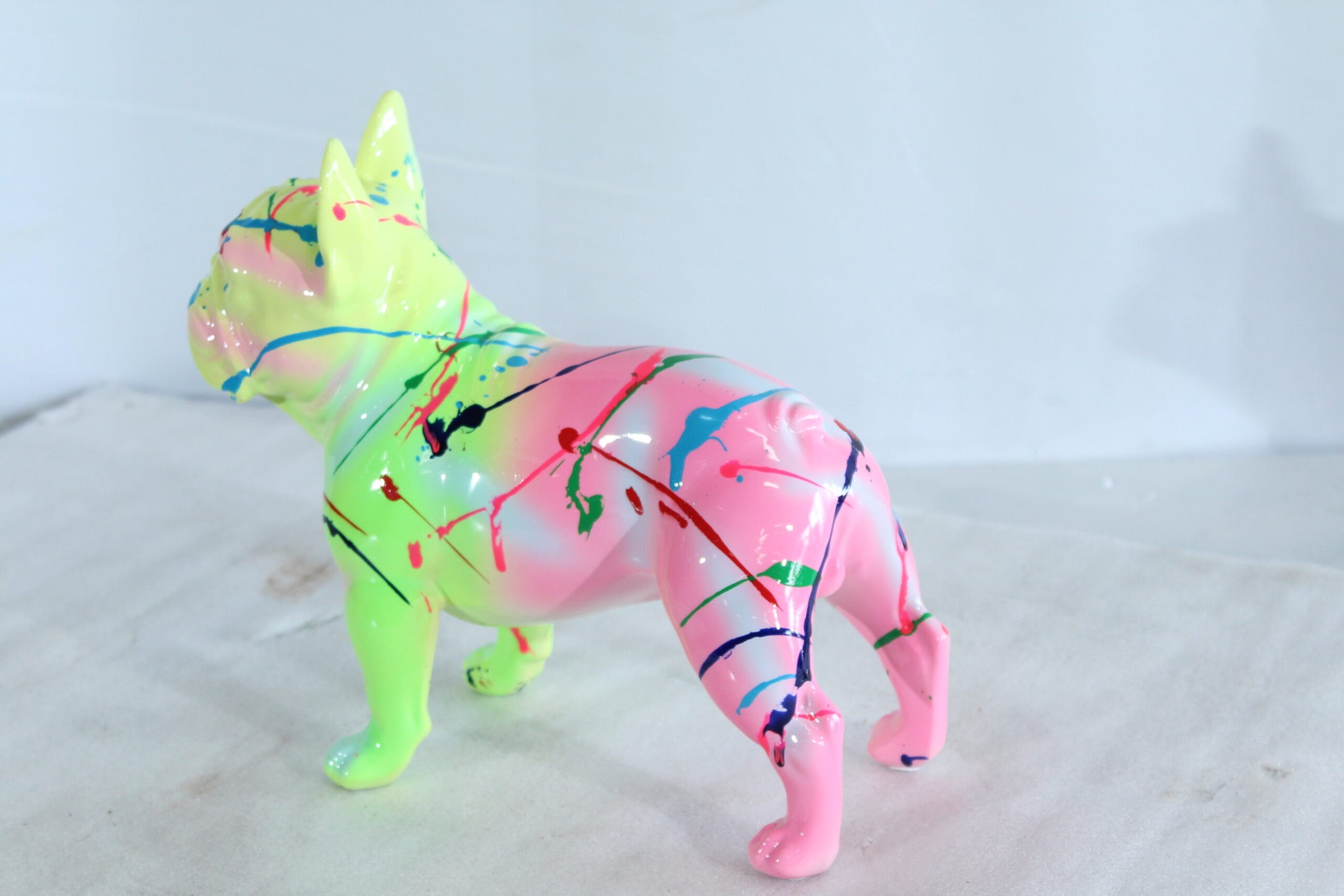 This vibrant resin bulldog statue adds a bold splash of personality to any space. Featuring a mix of pink, green, and neon tones with abstract paint splatters, it's a perfect fusion of modern art and playful decor. Ideal for collectors, dog lovers, or anyone seeking a standout conversation piece. Hand-finished in a glossy, high-impact style. Size: 15"L x 7"W x 14"H. Weight: 4Lb