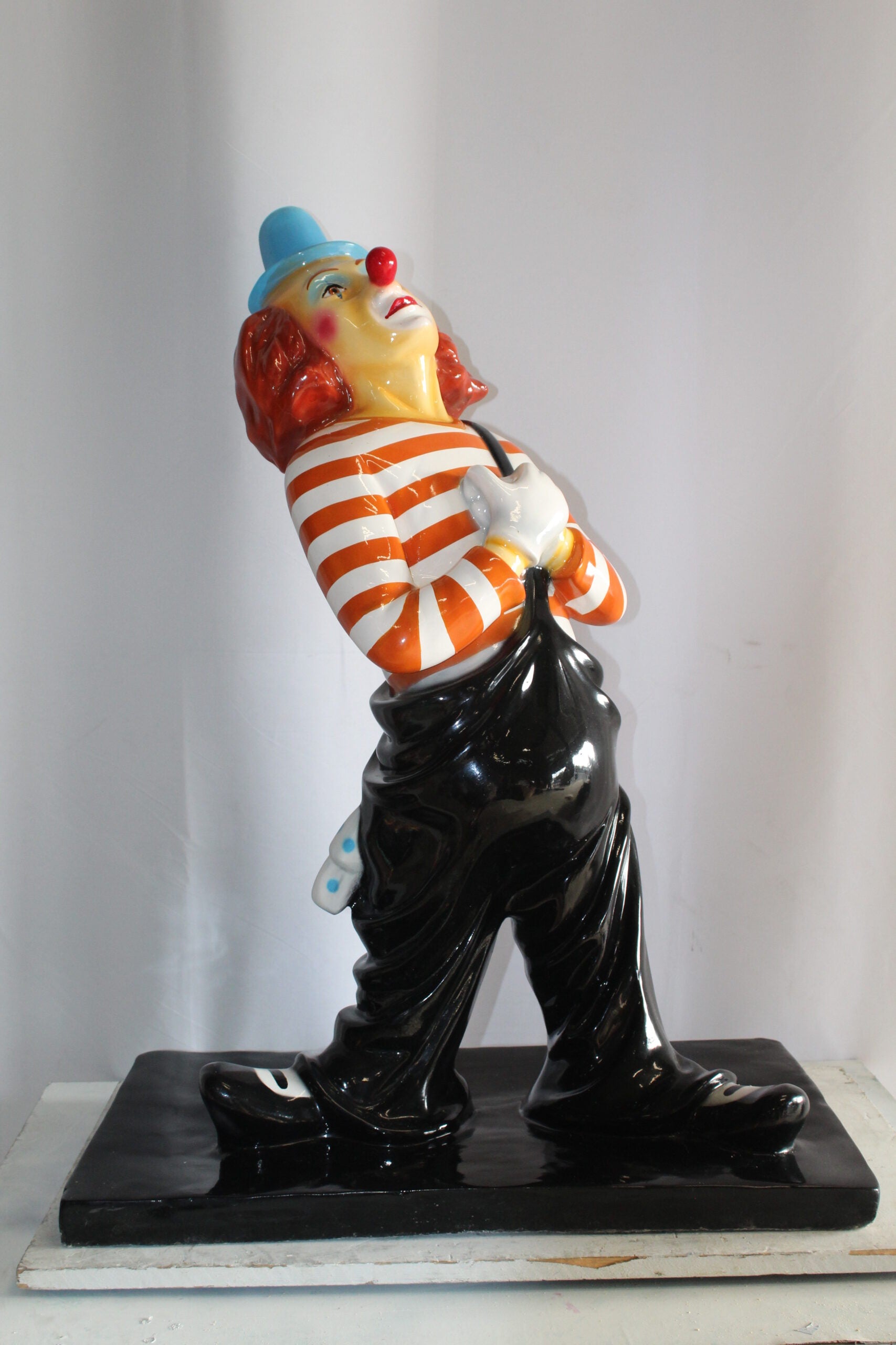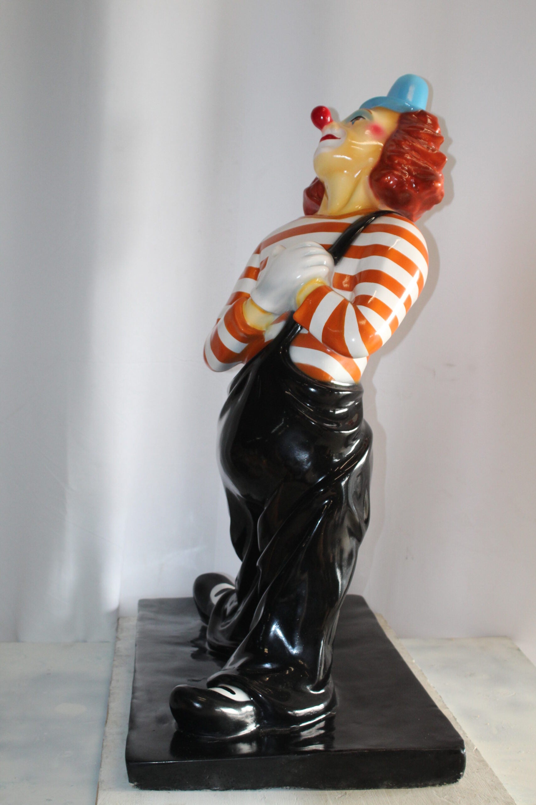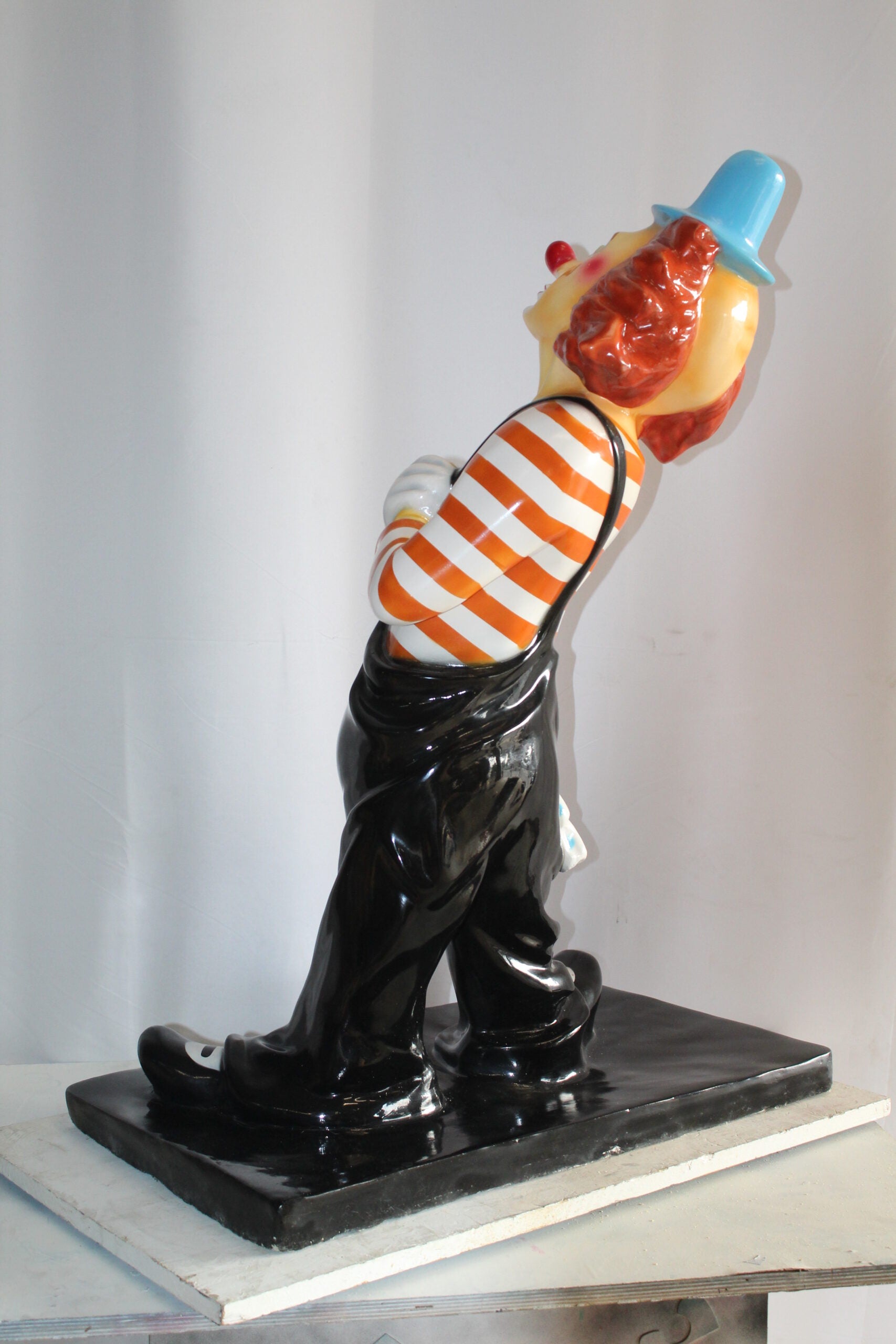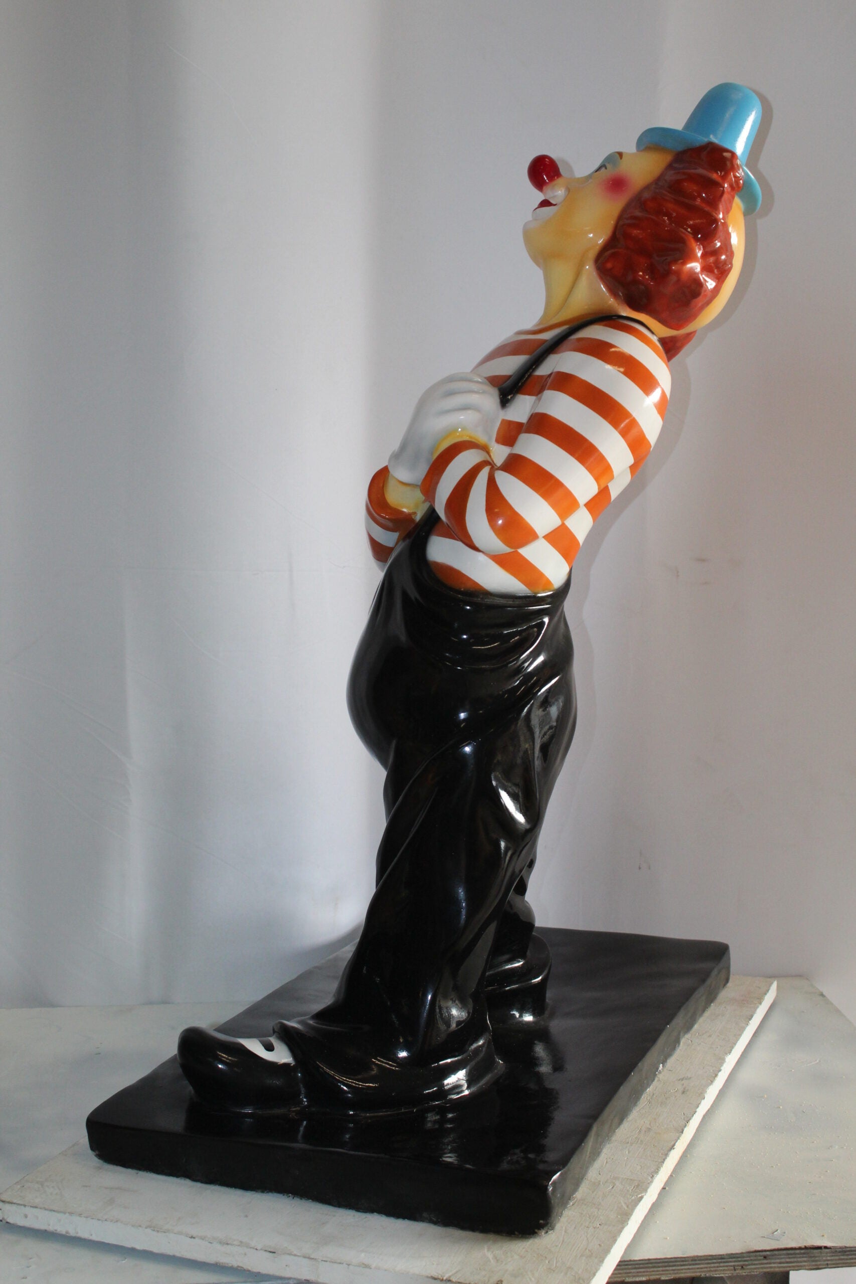 Explore joy with our Colorful Fiberglass Clown Statue. Handcrafted and casted, this vibrant piece features a striped shirt. Bring fun and whimsy into your space with this cheerful and delightful sculpture. Size: 27"L x 17"W x 39"H. Weight is: 22Lb