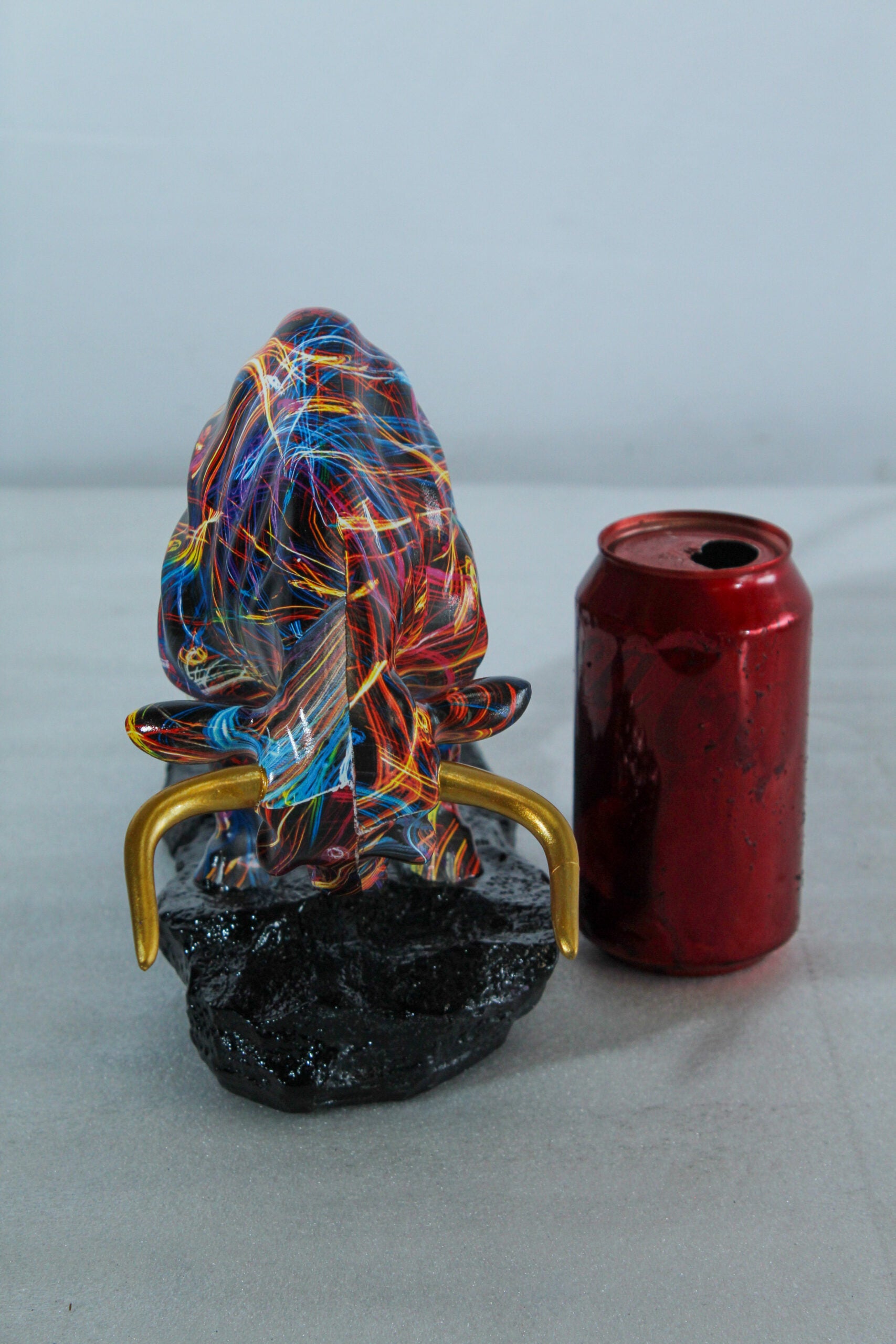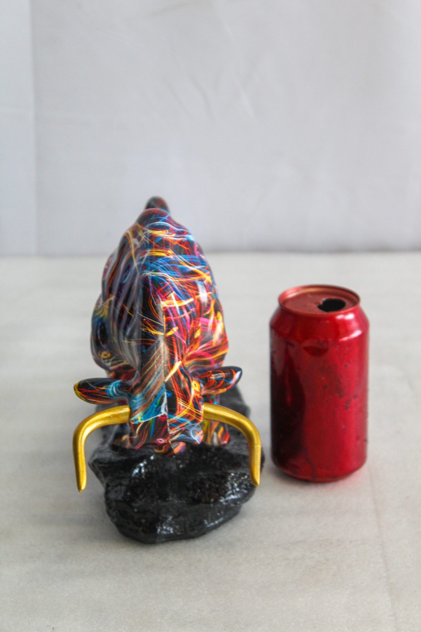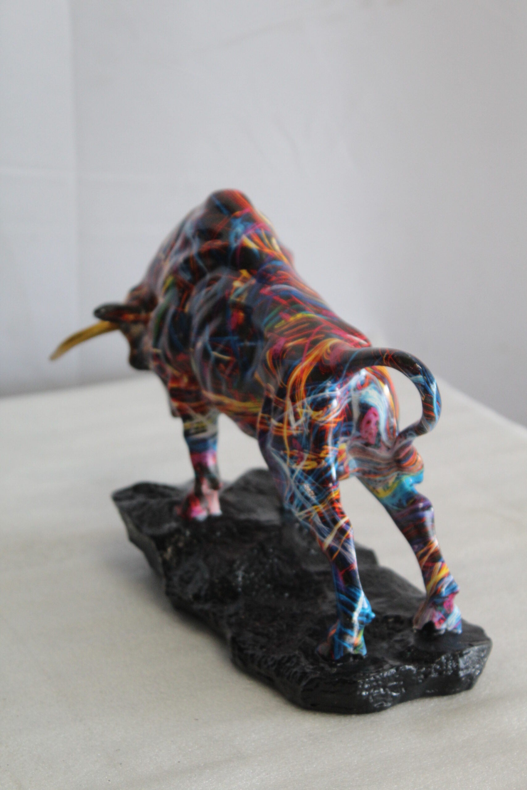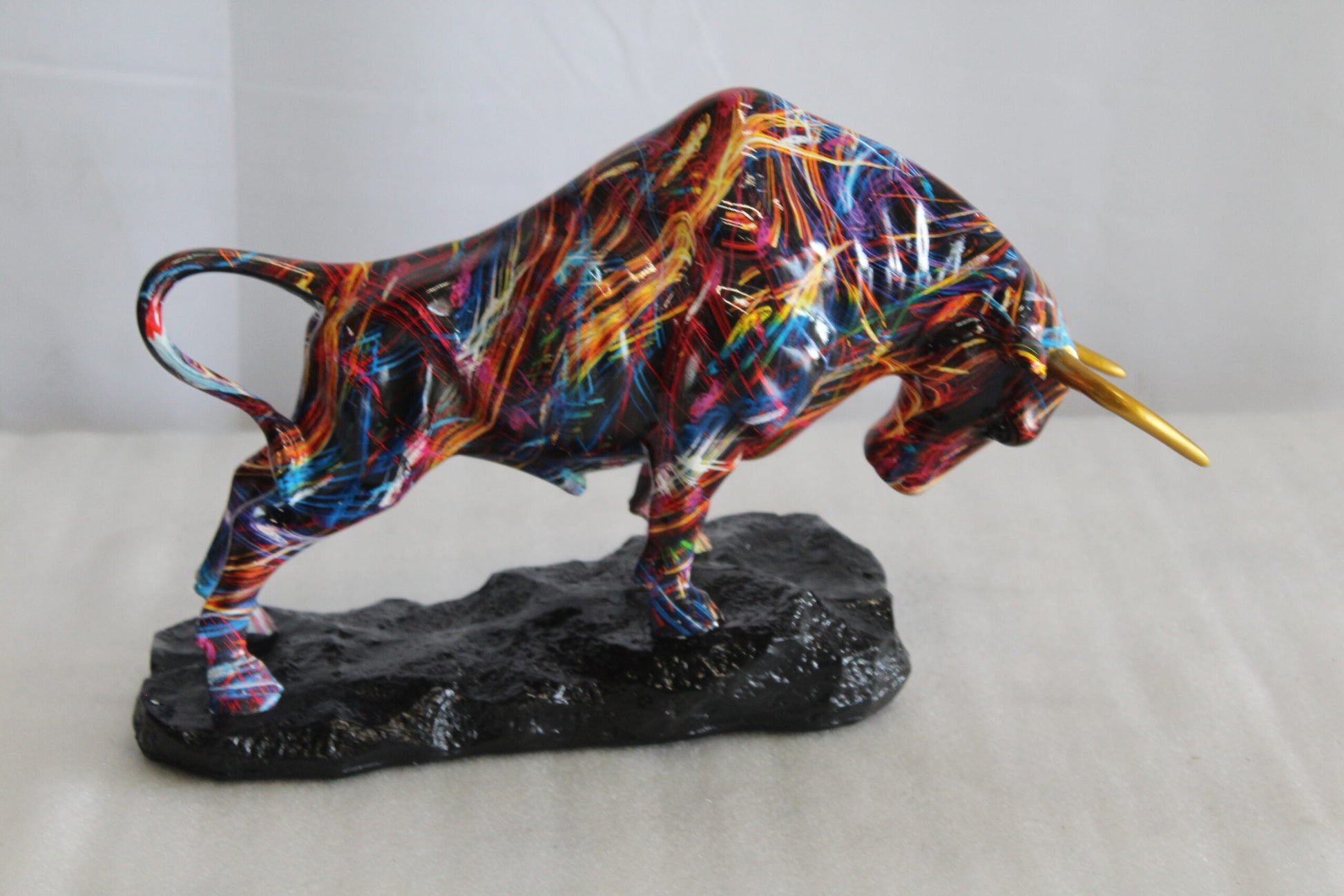 This dynamic resin bull sculpture bursts with energy and motion through its vivid multicolor streak design. A striking mix of red, blue, yellow, and orange lines create an electrifying look over a glossy black base. Finished with gold-tone horns and sculpted in a powerful charging stance, this piece adds bold style to modern interiors, offices, or collector shelves. A true celebration of strength and creative form. Size: 14"L x 4"W x 9"H. Weight: 2Lb