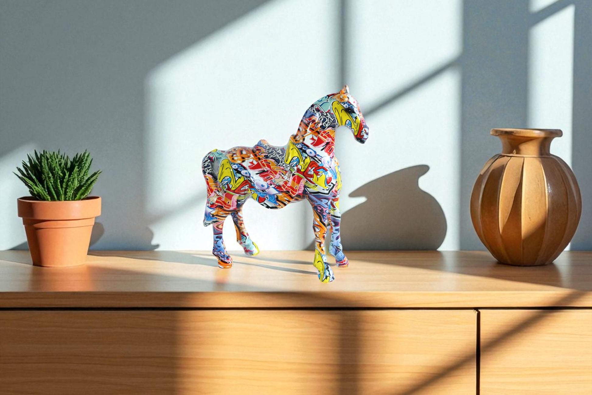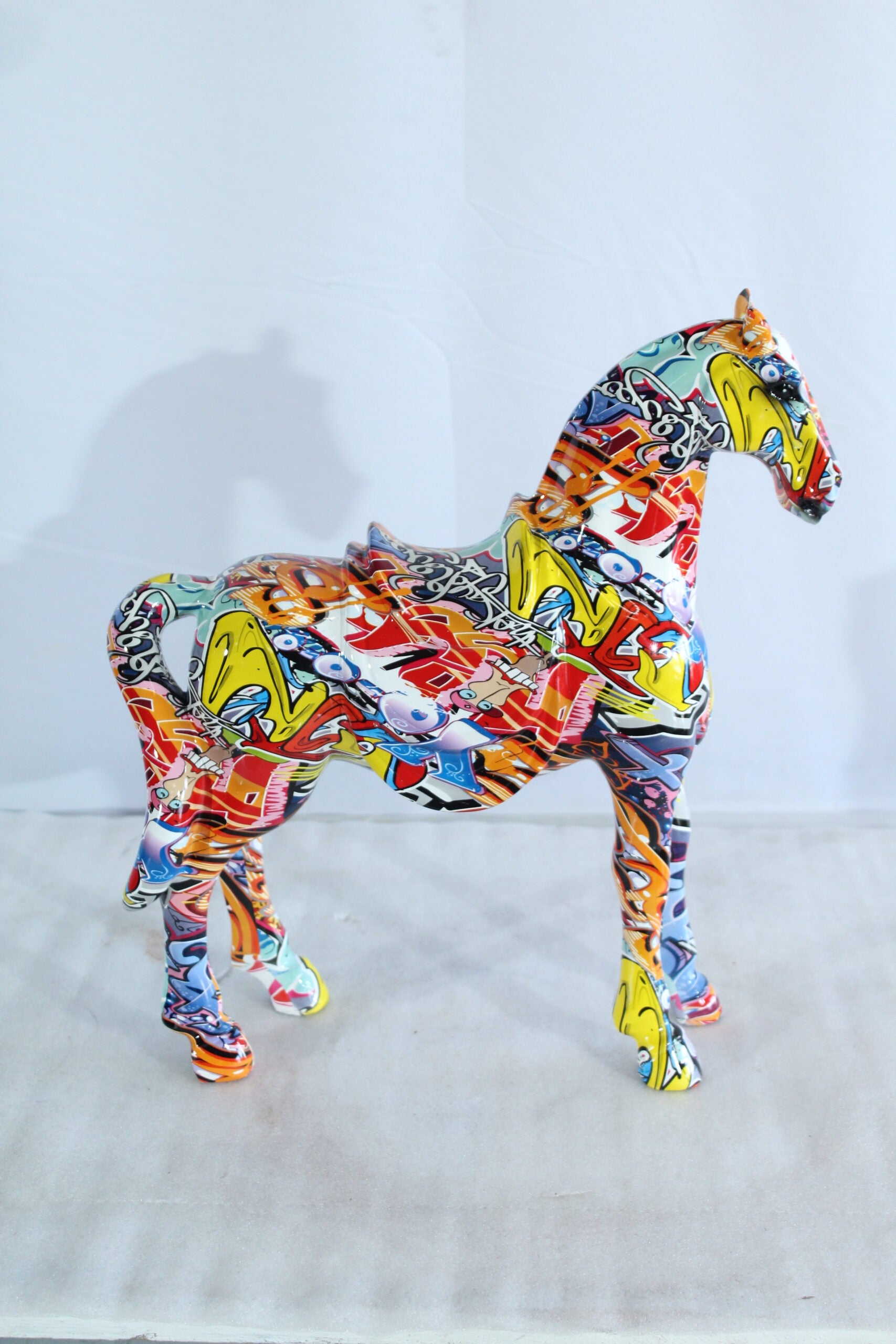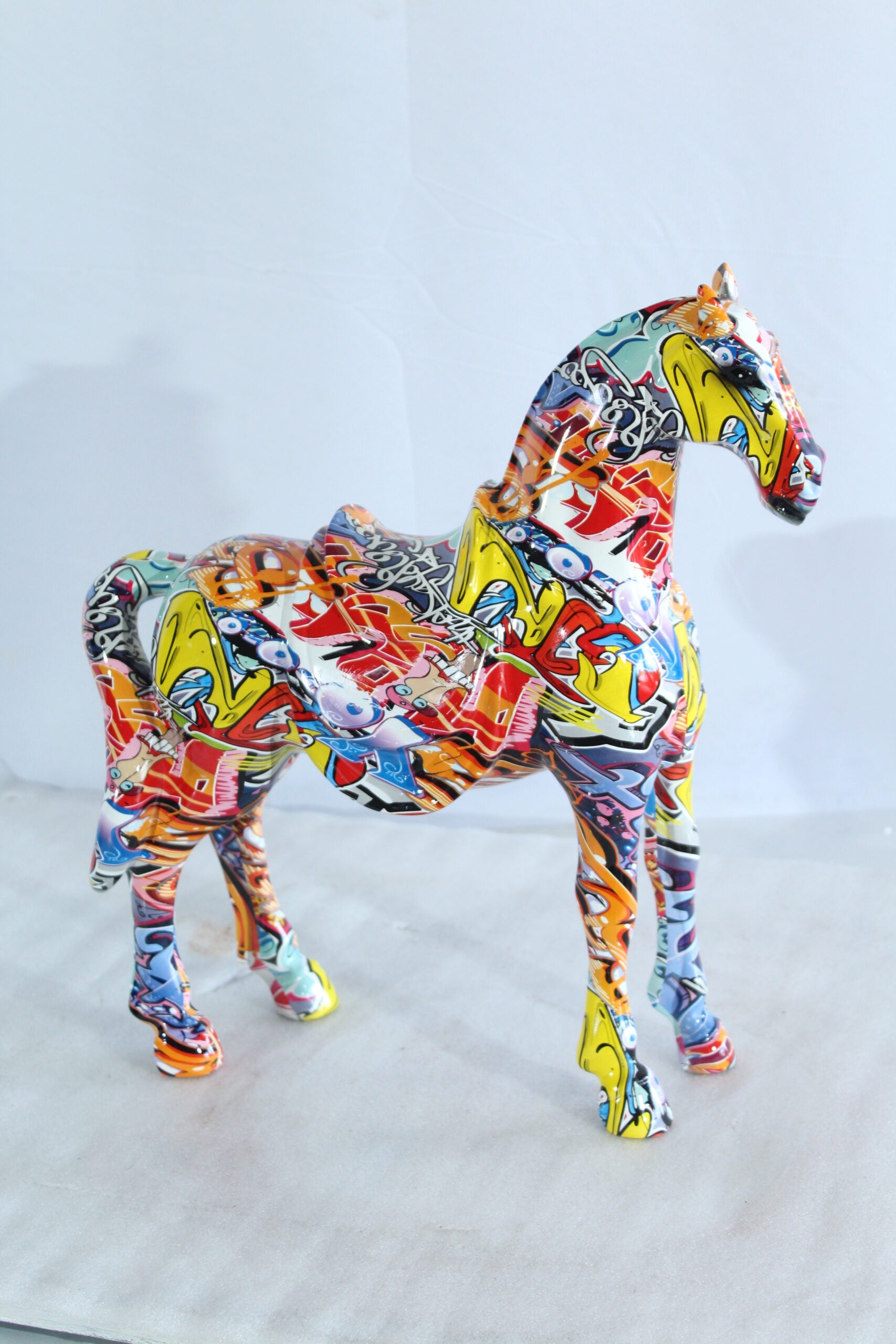 Vibrant resin horse statue with an abstract graffiti-style finish, this piece features a built-in saddle for added character. A perfect blend of color and form, it adds a modern artistic touch to any room. Great as a decorative accent or collectible for the home or office. Size: 14"L x 5"W x 15"H. Weight: 3Lb