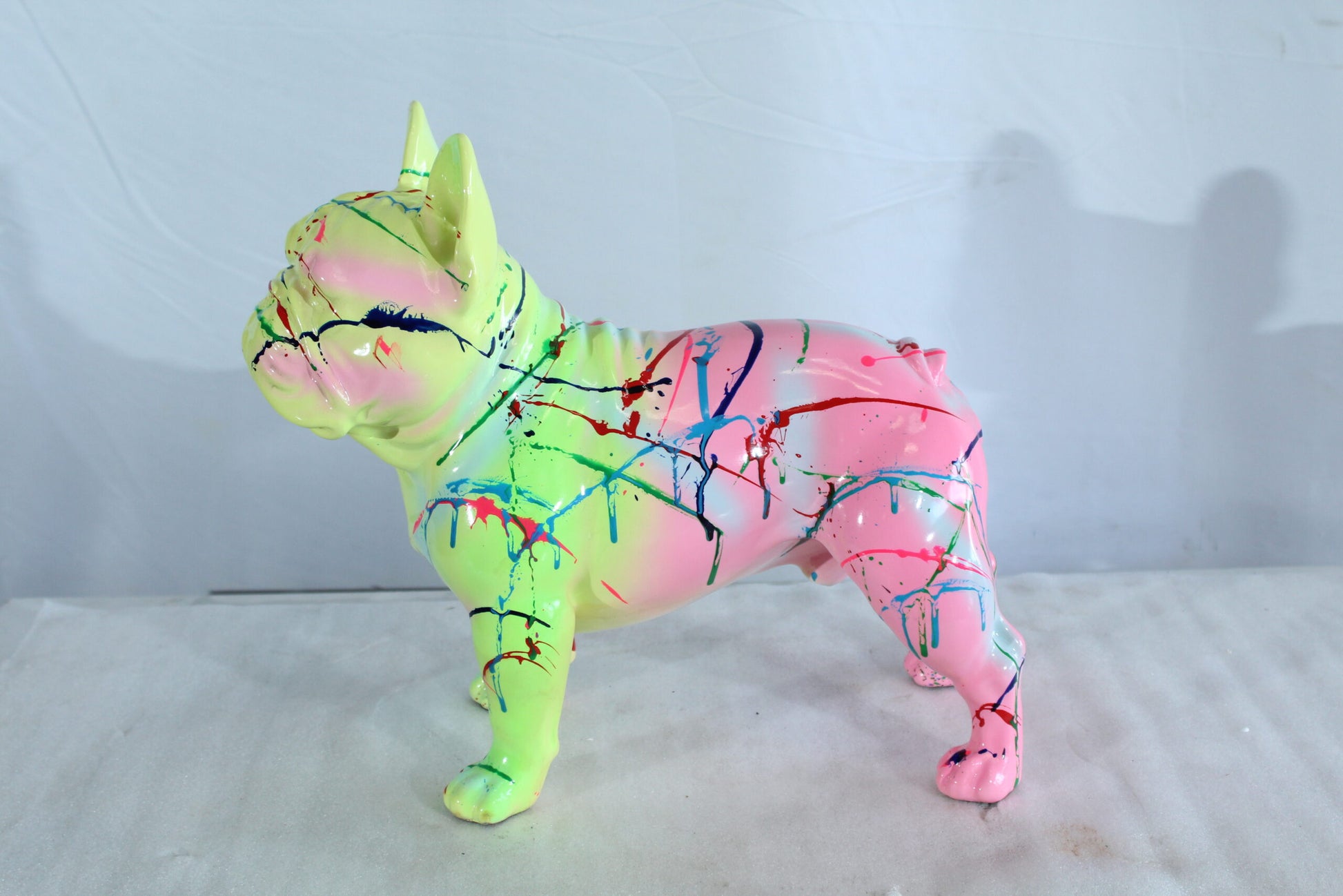 This vibrant French Bulldog statue features a dynamic splatter paint design in shades of green, pink, and neon tones. Crafted from resin, this playful decorative piece adds a bold, modern touch to any room or art collection. Ideal for dog lovers and fans of pop-inspired décor. Size: 11"L x 5"W x 10"H. Weight: 2Lb