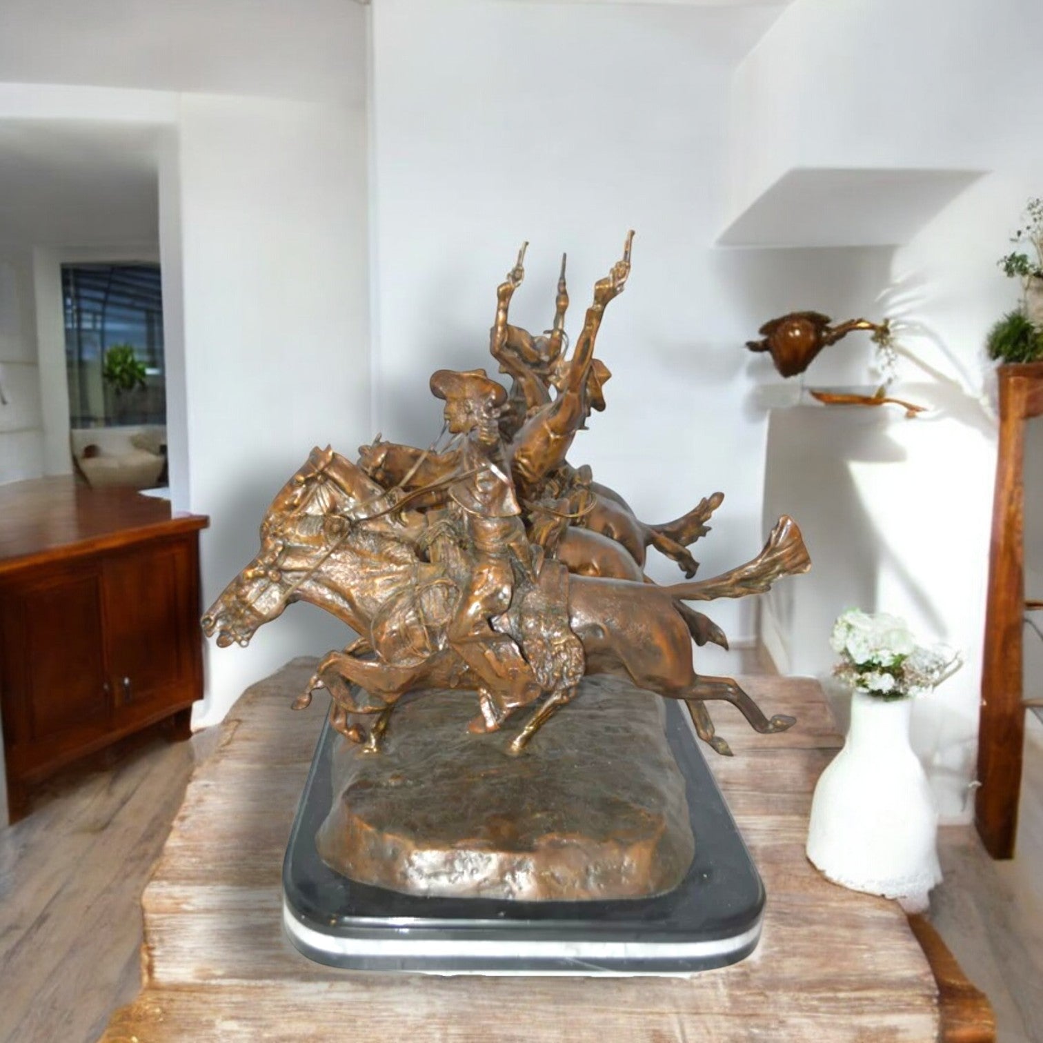 100% Bronze sculpture Statue, Coming Through The Rye by Frederic Remington replica. The statue depicts four mounted cowboys, pistols raised aloft, keep a steady pace in a tight, boisterous group. The “Coming Through The Rye” is Frederic Remington’s most popular bronze statue, cast in the lost-wax technique, sharply delineated with a rich variety of textures, from the fringed buckskin garment to the animal’s hairy coat to the rocklike base. Size: 28"L x 23"W x 29"H. Weight is: 250Lb.
