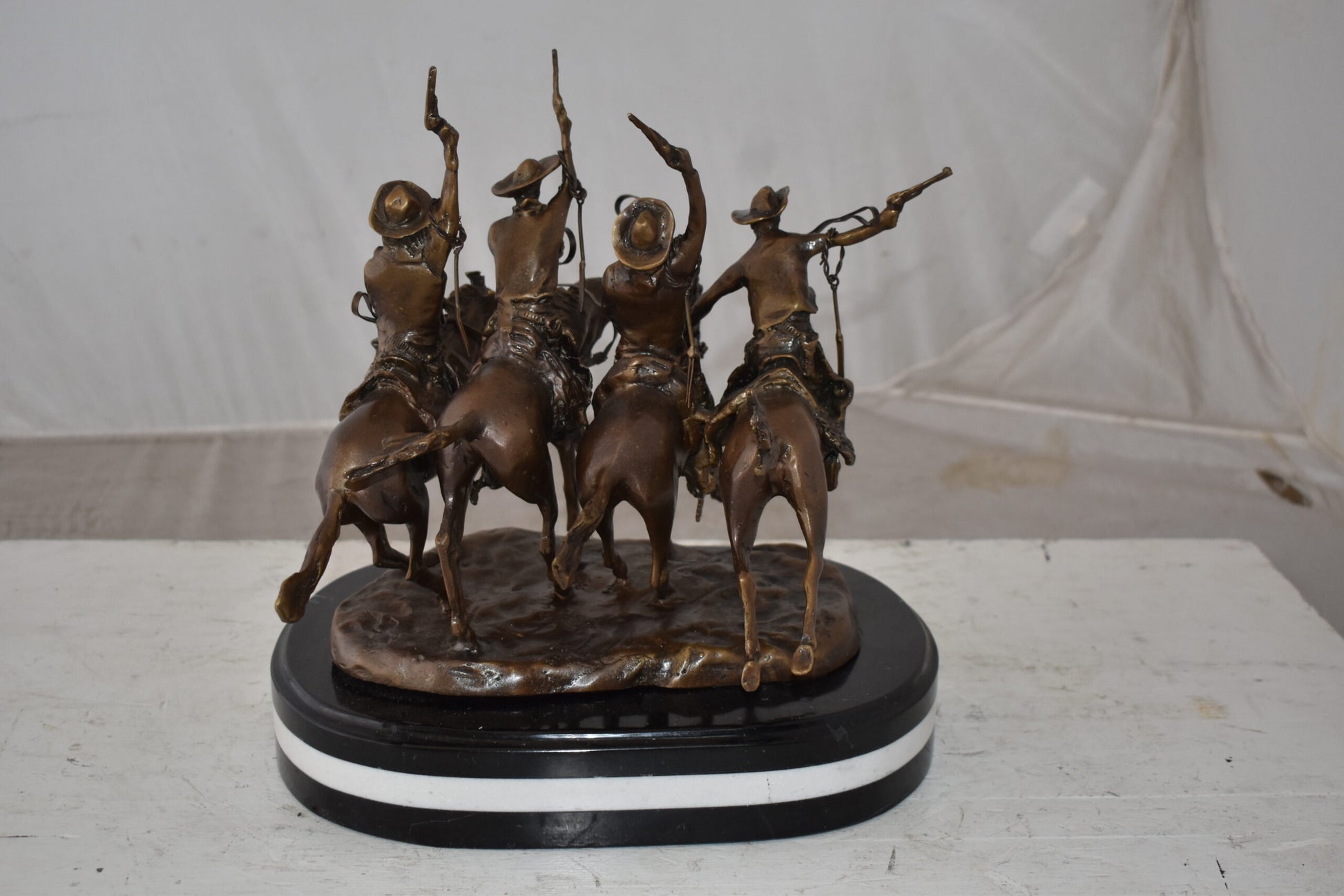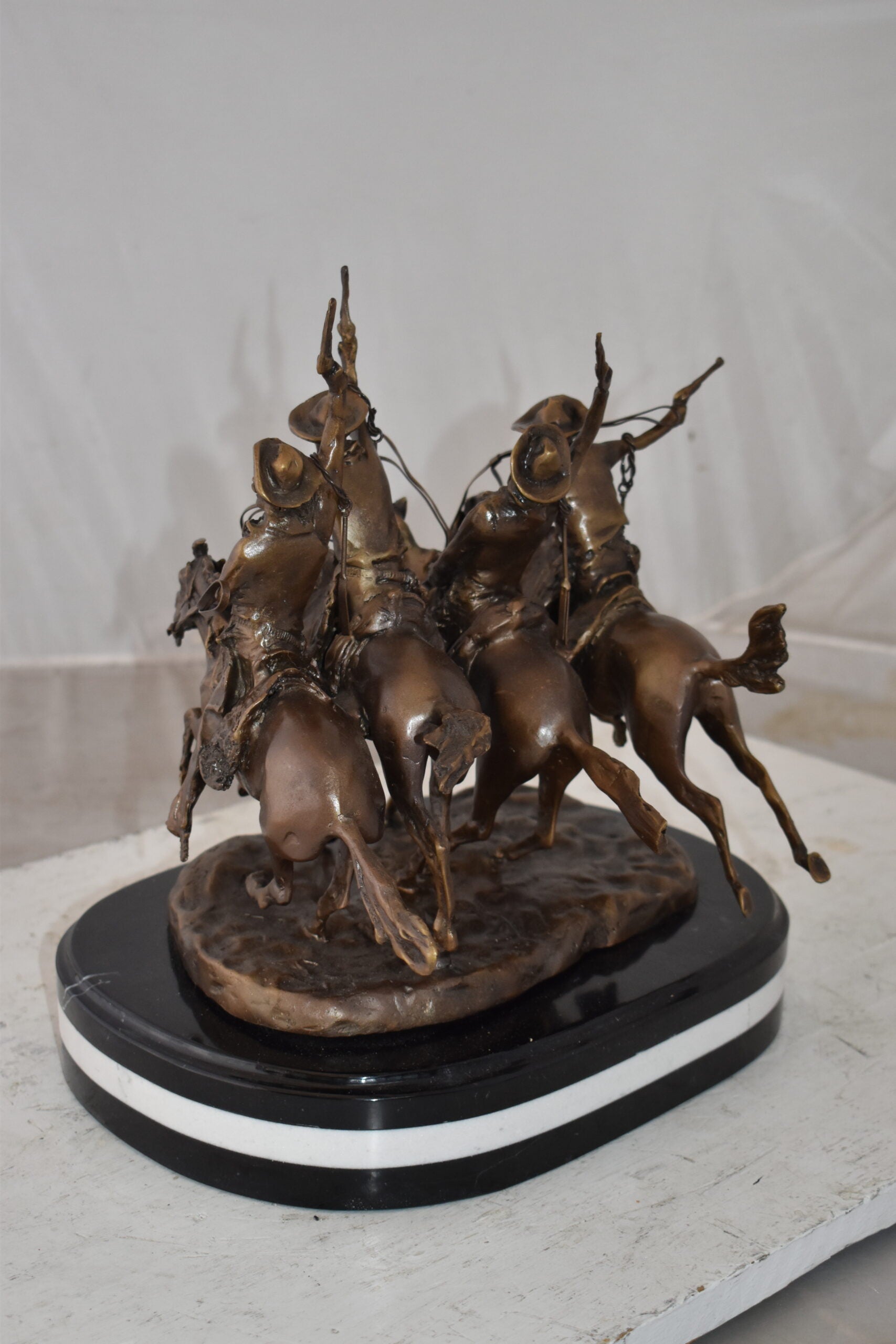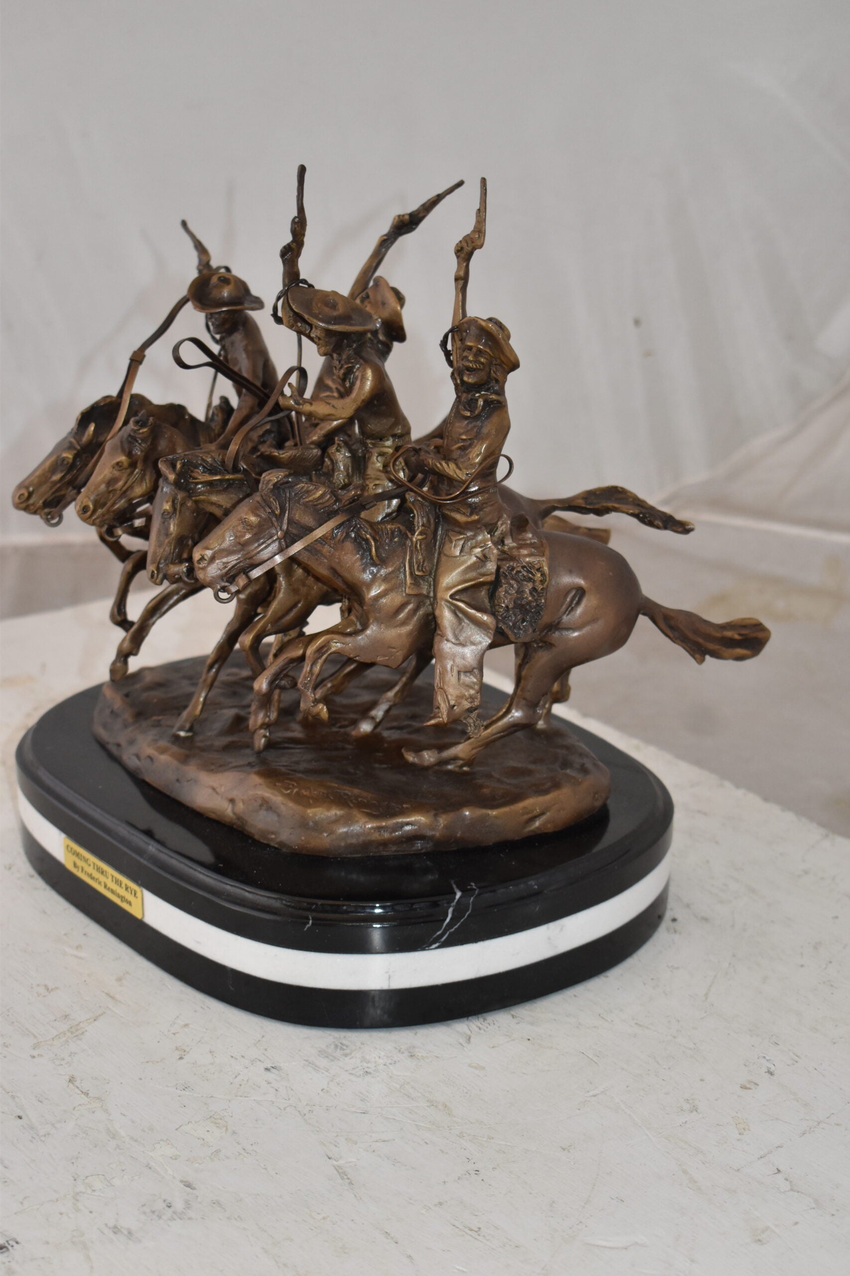 This replica of Coming Thru The Rye is a piece originally done by the famous Frederic Remington. Bring artistic and tasteful history to any space with this bronze statue. The artist was sure to genuinely recreate the piece from the detail of the horses to the embellishments on the hats of the riders. For history lovers, this statue is a must. Size: 13"L x 12"W x 14"H. Weight is: 41Lb