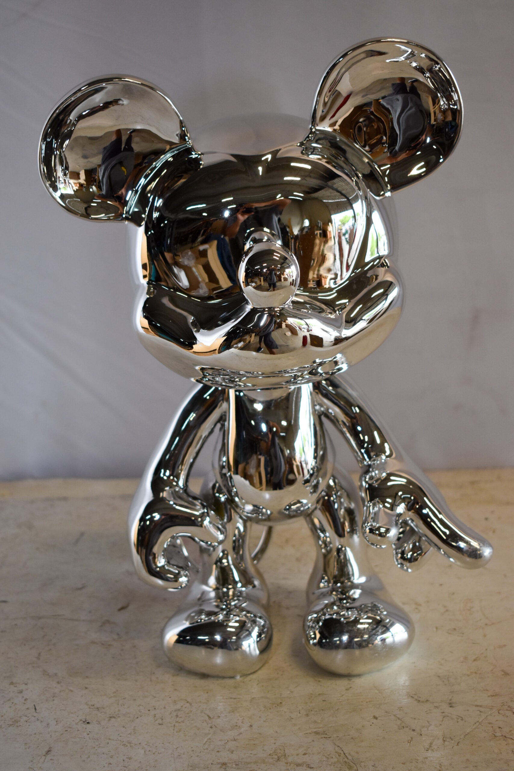Enjoy this adorable resin statue coated in silver chrome of a small Mickey Mouse. This modern and adorable small work of art would be a great addition to your home. Utilizing the method of resin casting, in which a mold is filled with a liquid synthetic resin, this statue displays a reliable bright color and joyful work of art. Size: 12"L x 9"W x 16"H. Weight is: 8Lb