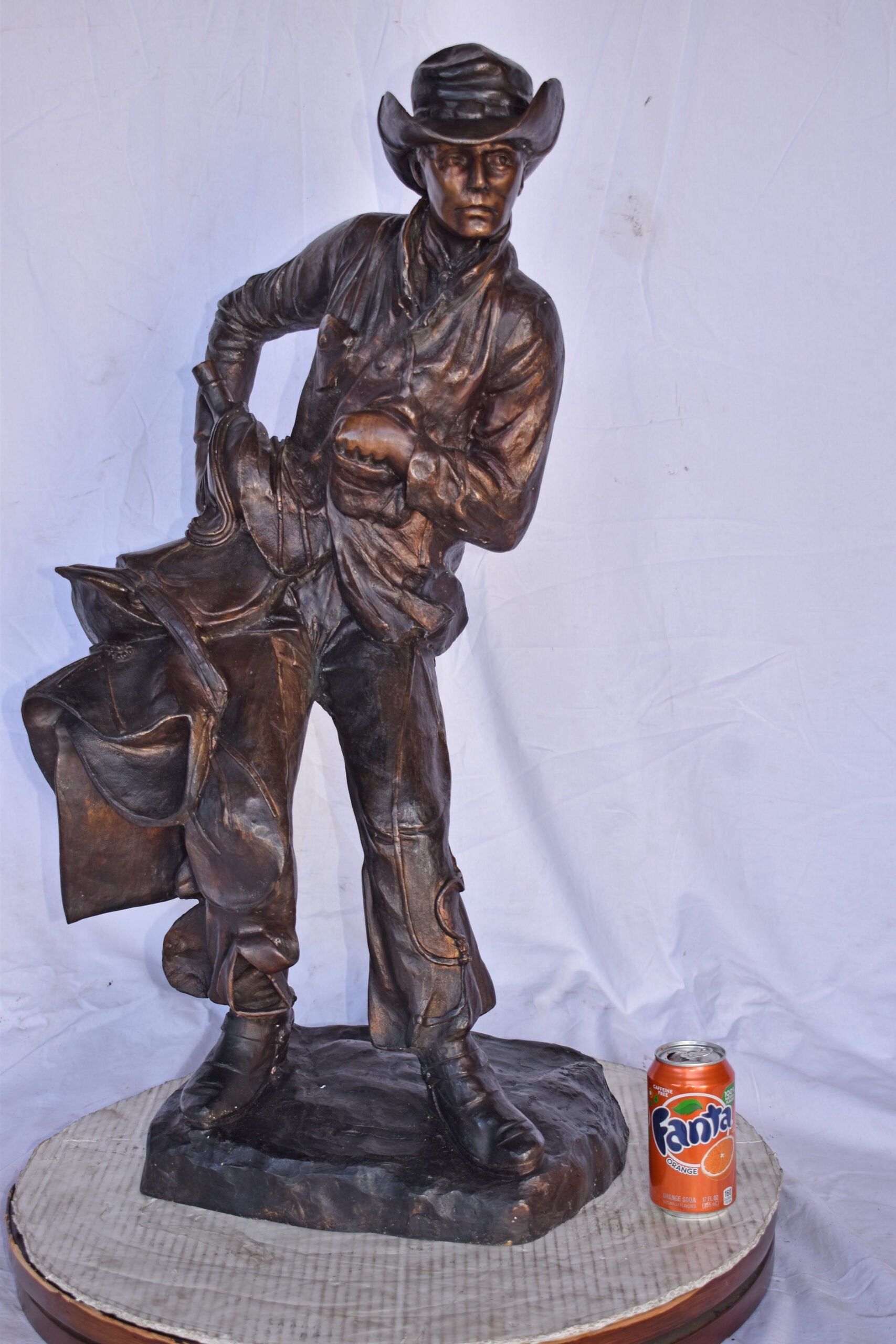 Cowboy Holding His Saddle Bronze Statue - Size: 20"L x 14"W x 35"H.