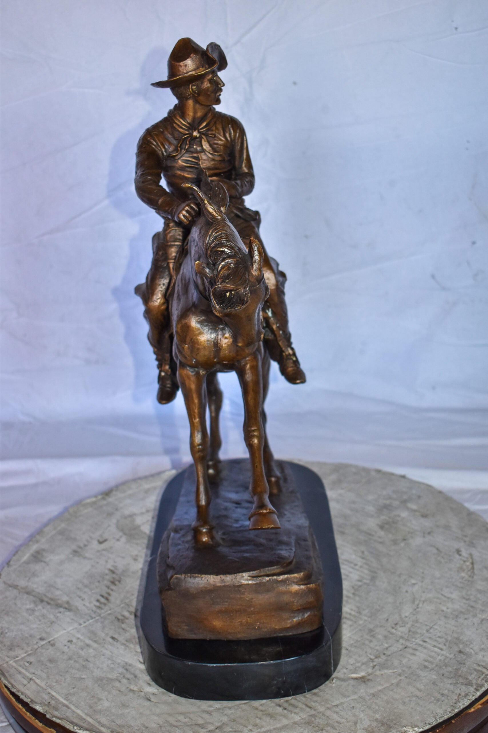 This bronze statue replicates the well-known piece titled, Cowboy, by the famous sculpture Frederic Remington. This statue depicts the ascending strides of the horse and the far-off gaze of his rider. Situated on a classy marble base, the detail and strong comparison make it a worthy purchase and will add another perspective of the American history to your home. Size: 25"L x 8"W x 24"H. Weight is: 51Lb