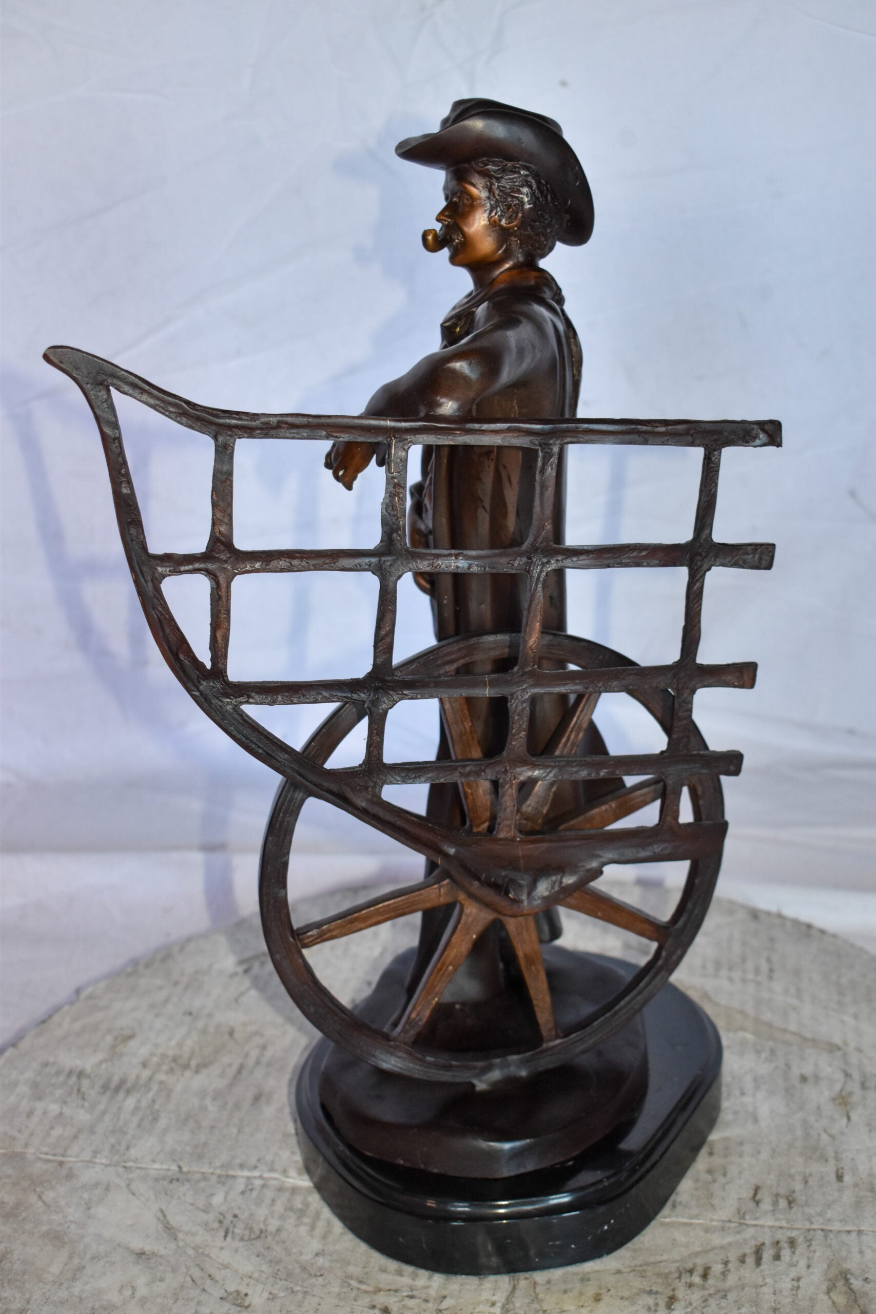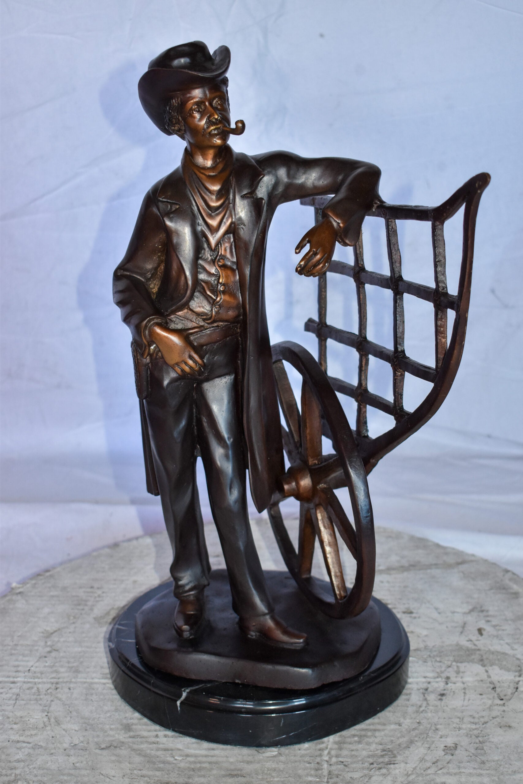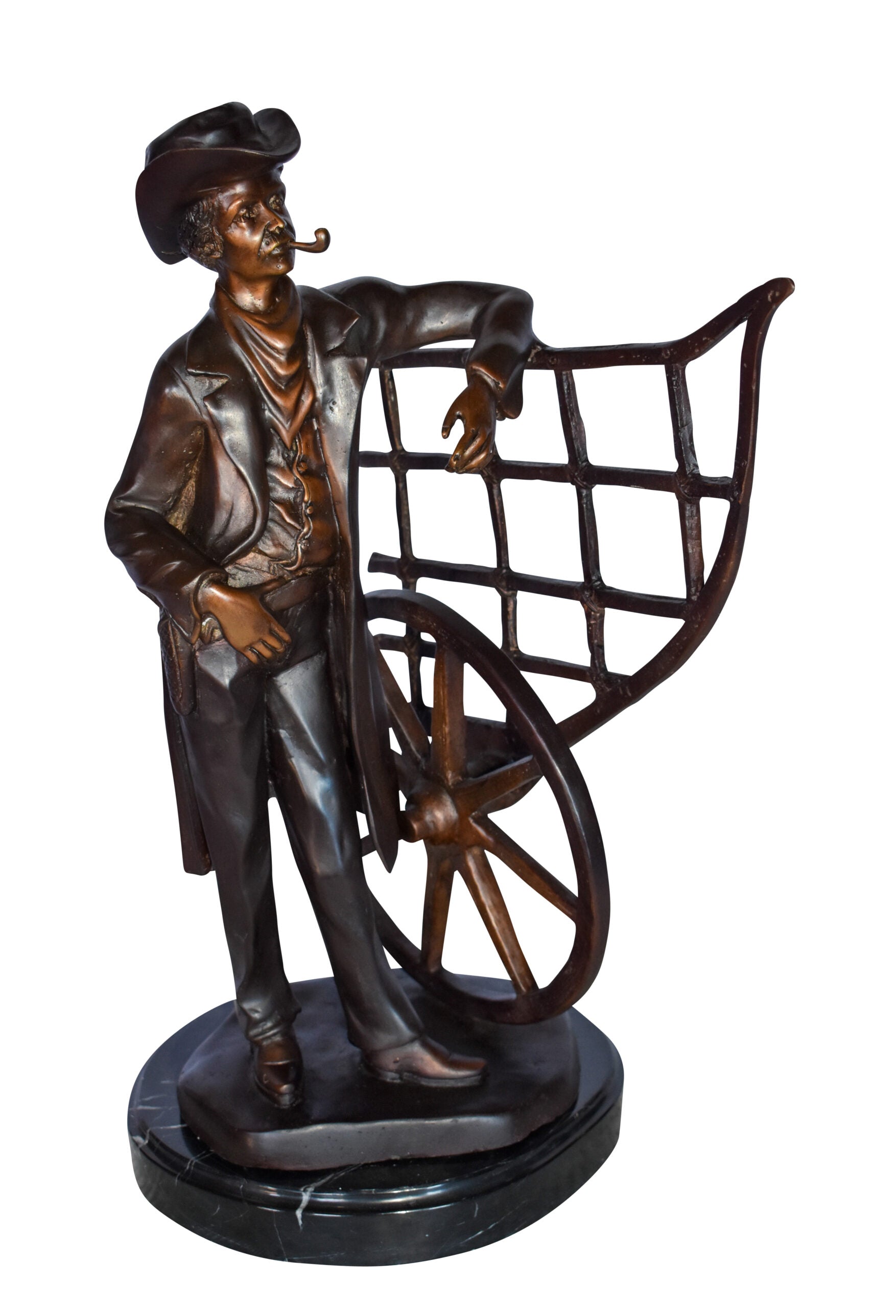 This statue depicts a multi-toned bronze statue of a cowboy standing by his carriage smoking his pipe, mounted on a marble base. The statue detailed face and body is finished with the traditional, hand-rubbed bronze. This bronze statue is cast in the traditional lost-wax method, which highlights the exceptionally fine detail. This statue will add another perspective of the American history to your home. Size: 12"L x 8"W x 23"H. Weight is: 28Lb