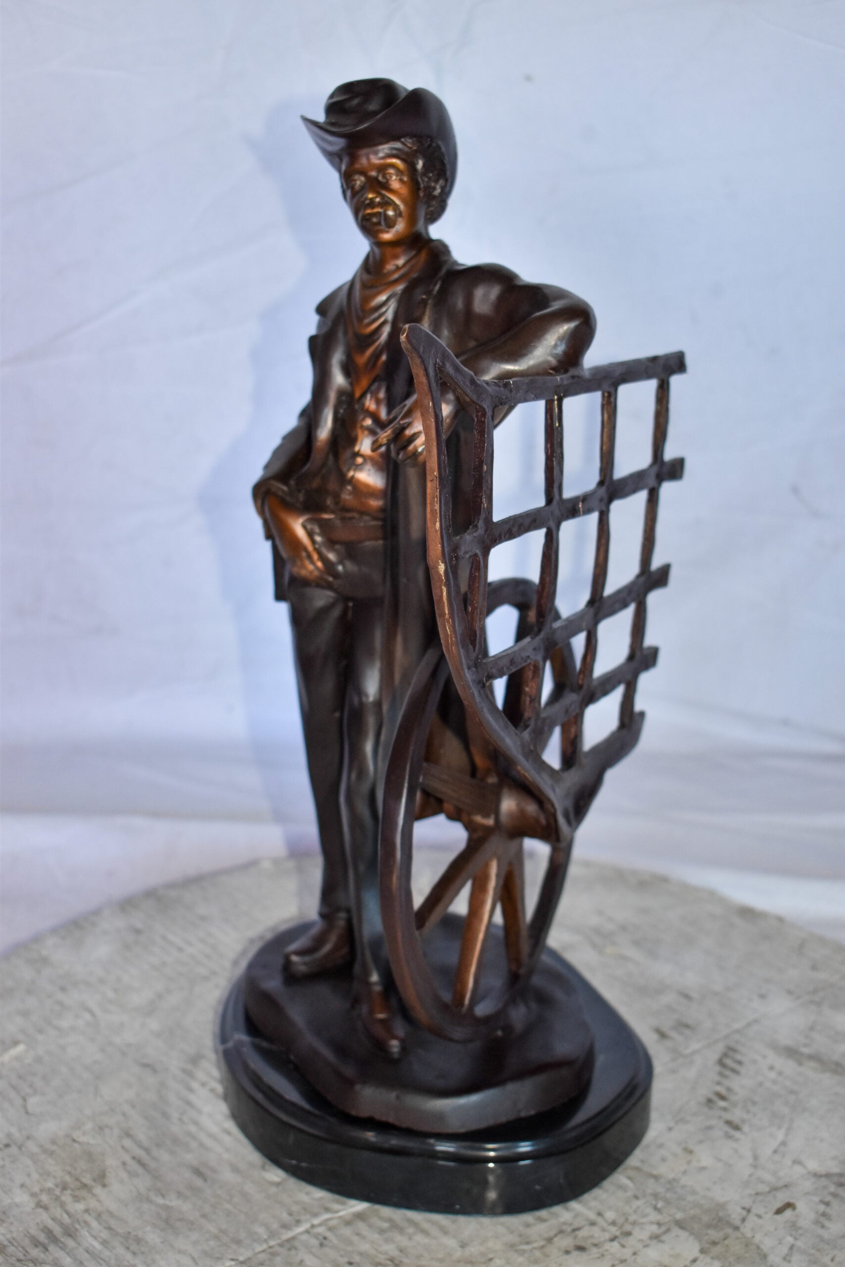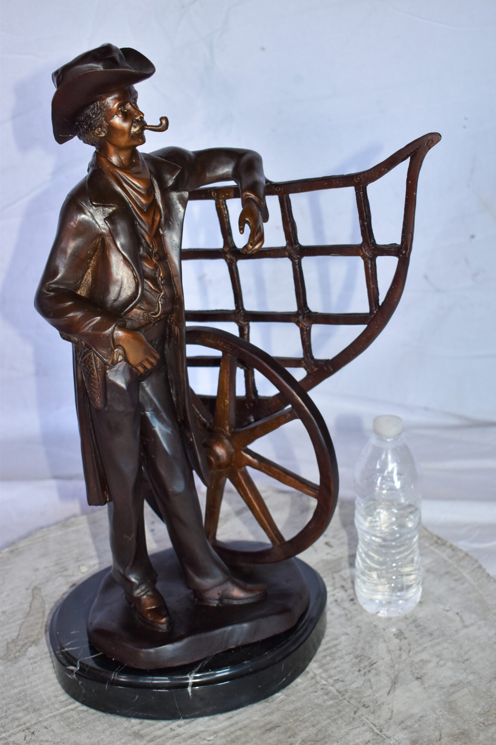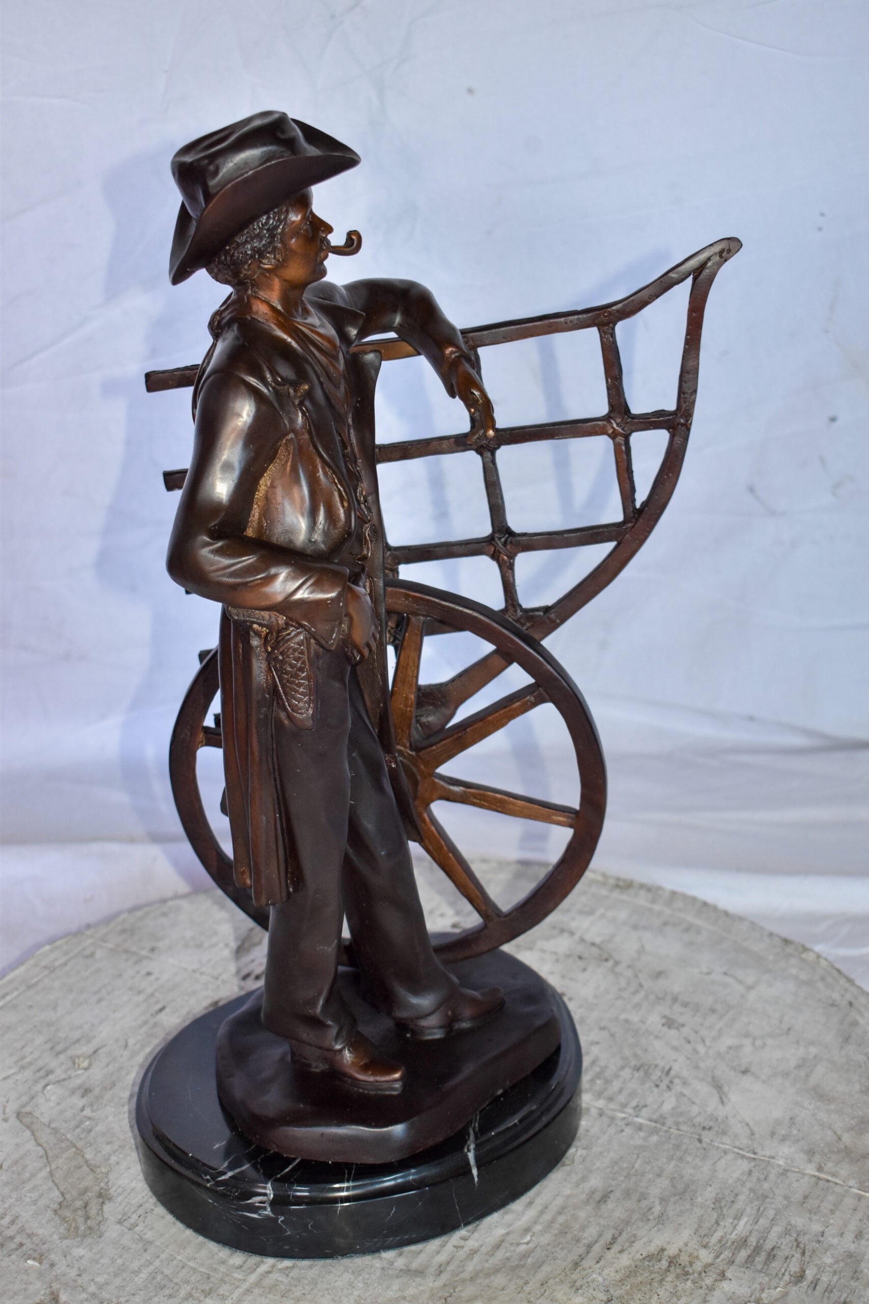This statue depicts a multi-toned bronze statue of a cowboy standing by his carriage smoking his pipe, mounted on a marble base. The statue detailed face and body is finished with the traditional, hand-rubbed bronze. This bronze statue is cast in the traditional lost-wax method, which highlights the exceptionally fine detail. This statue will add another perspective of the American history to your home. Size: 12"L x 8"W x 23"H. Weight is: 28Lb