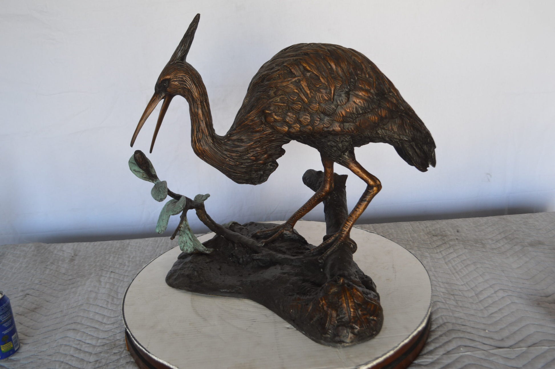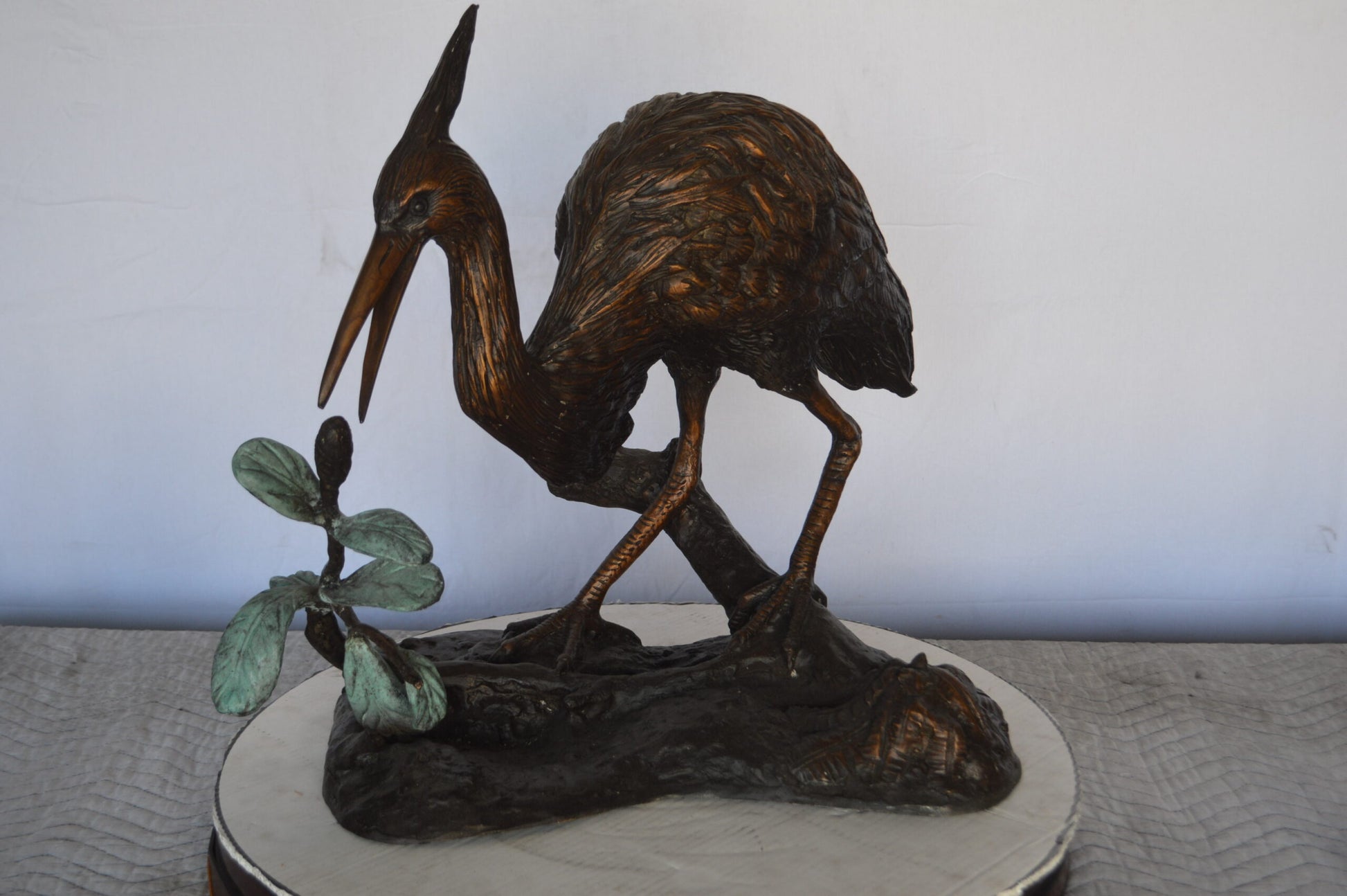 Bronze Crane on a tree branch, mounted on a bronze base. Like those seen in traditional English gardens, this Asian symbol of peace is a lifelike, lost wax bronze statue. The patina chosen for this Timeless Creation is stained in green and brown patina with a clear finish for preservation, handmade from pure bronze. This beautiful large bronze-cast statue will be a valuable addition to any area of the home, office, patio, or garden. Size: 24"L x 20"W x 21"H. Weight is: 32Lb