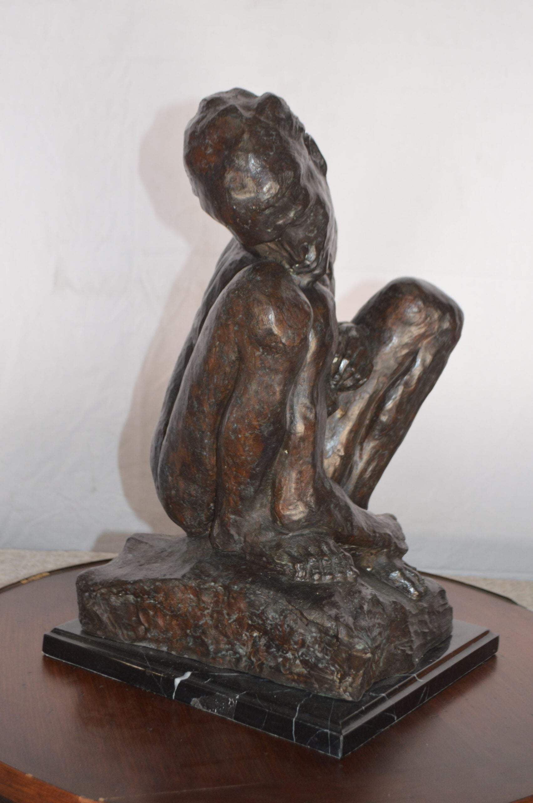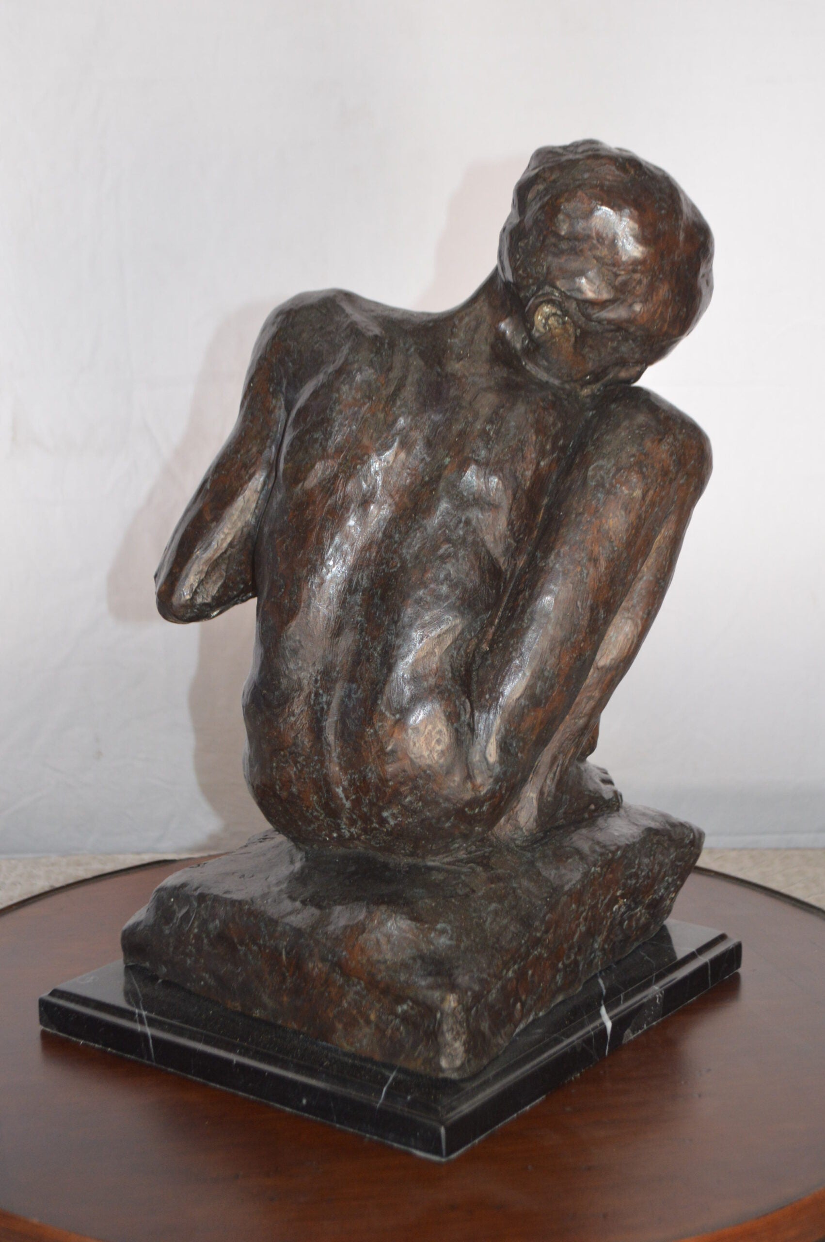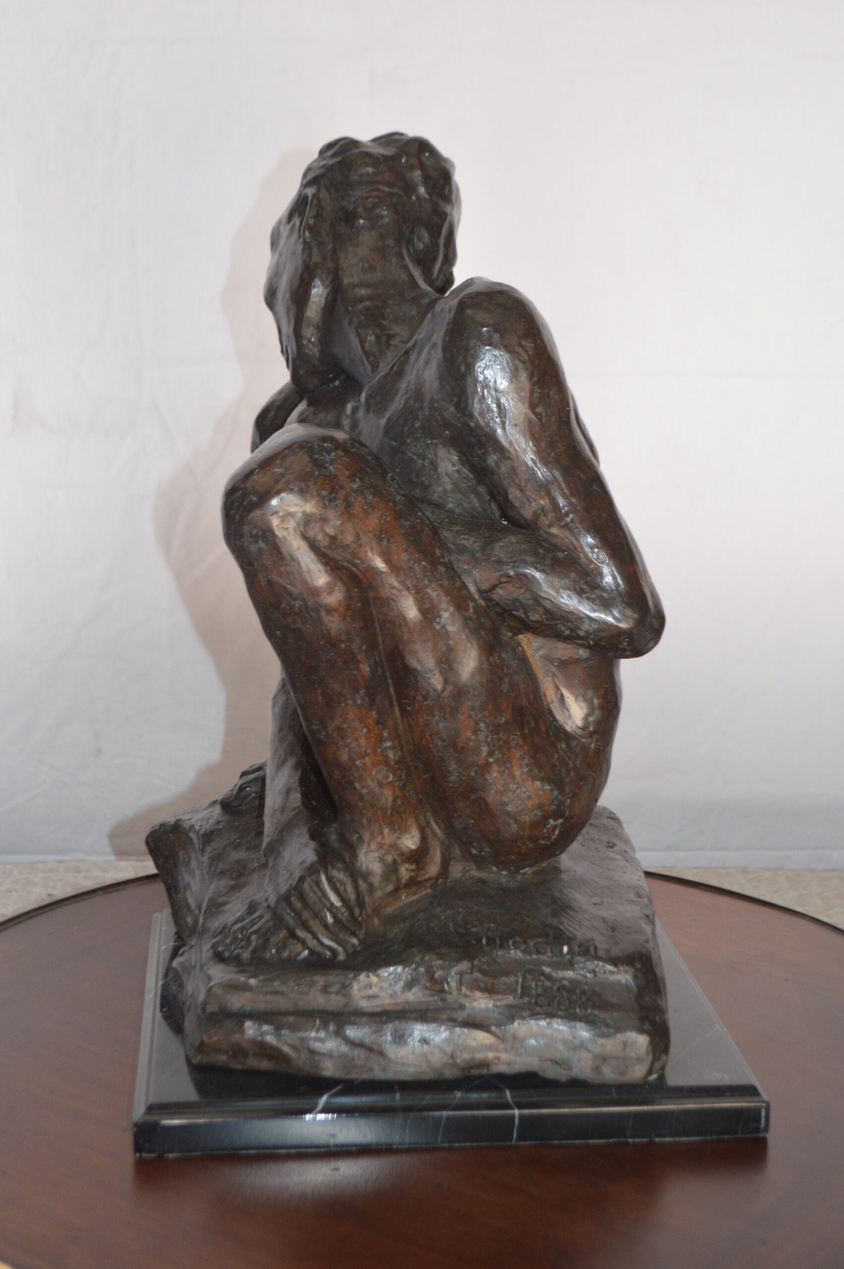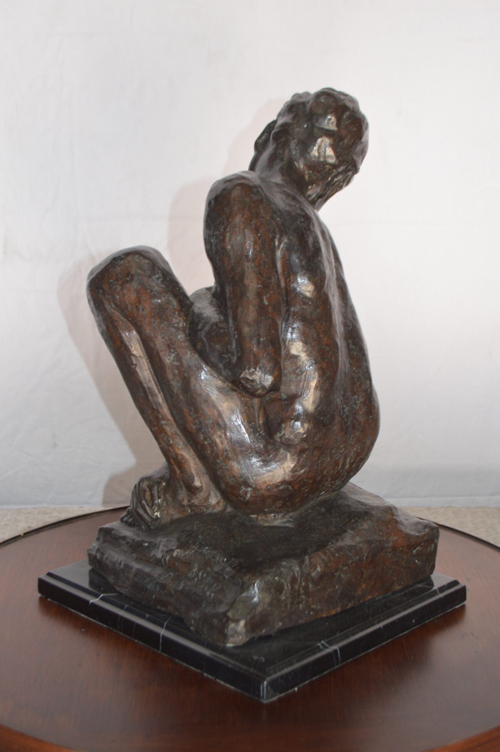 This is a pure Bronze Statue replica of The Crouching Woman by Auguste Rodin. Based on the couple from "Dante's Inferno." AUGUSTE RODIN (1840-1917). In between Romanticism and Impressionism this self-willed Frenchman created some of the most famous pieces known in the art of sculpting. He was very talented at conveying feeling in his compositions by emphasizing gesture. Also, his rough surface texture with deep hollows added strong shadows and naturalism to the human form. Rodin's goal, as he put it, was "to render inner feelings through muscular movement." He achieved this aim by joining his profound knowledge of anatomy and movement with special attention to the body's surfaces, saying, "The sculptor must learn to reproduce the surface, which means all that vibrates on the surface, soul, love, passion, life...Sculpture is thus the art of hollows and mounds, not of smoothness, or even polished planes." Size: 11"L x 16"W x 18"H. Weight is: 44Lb