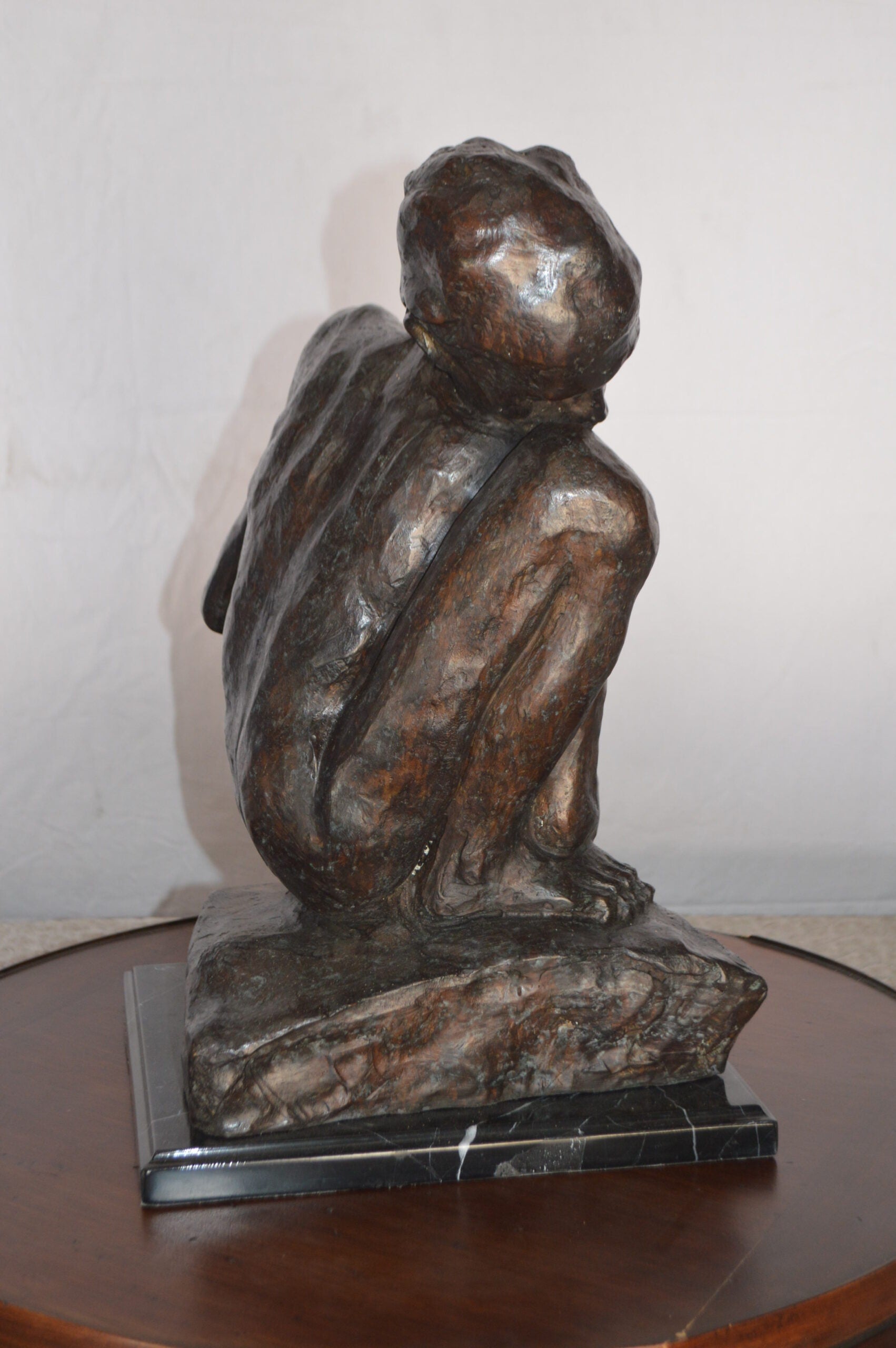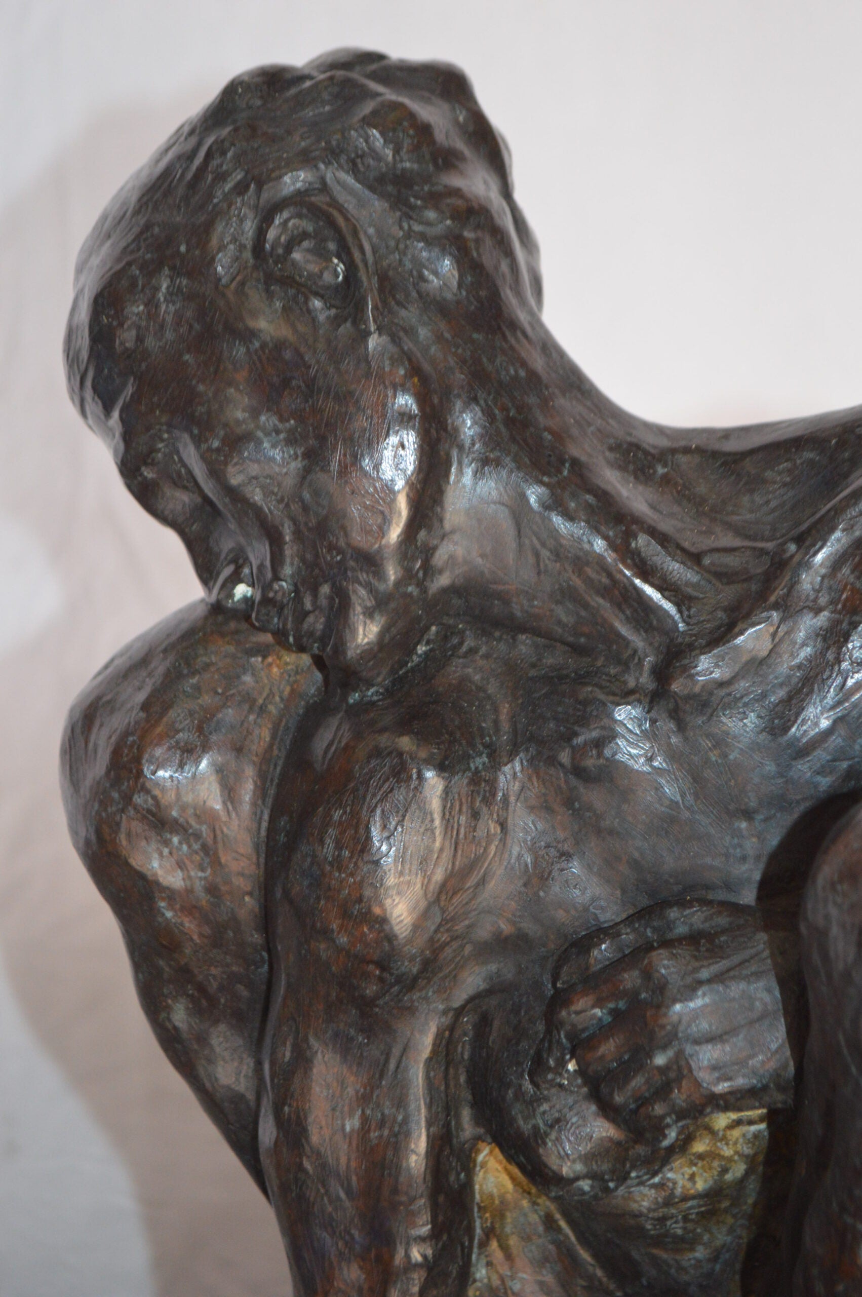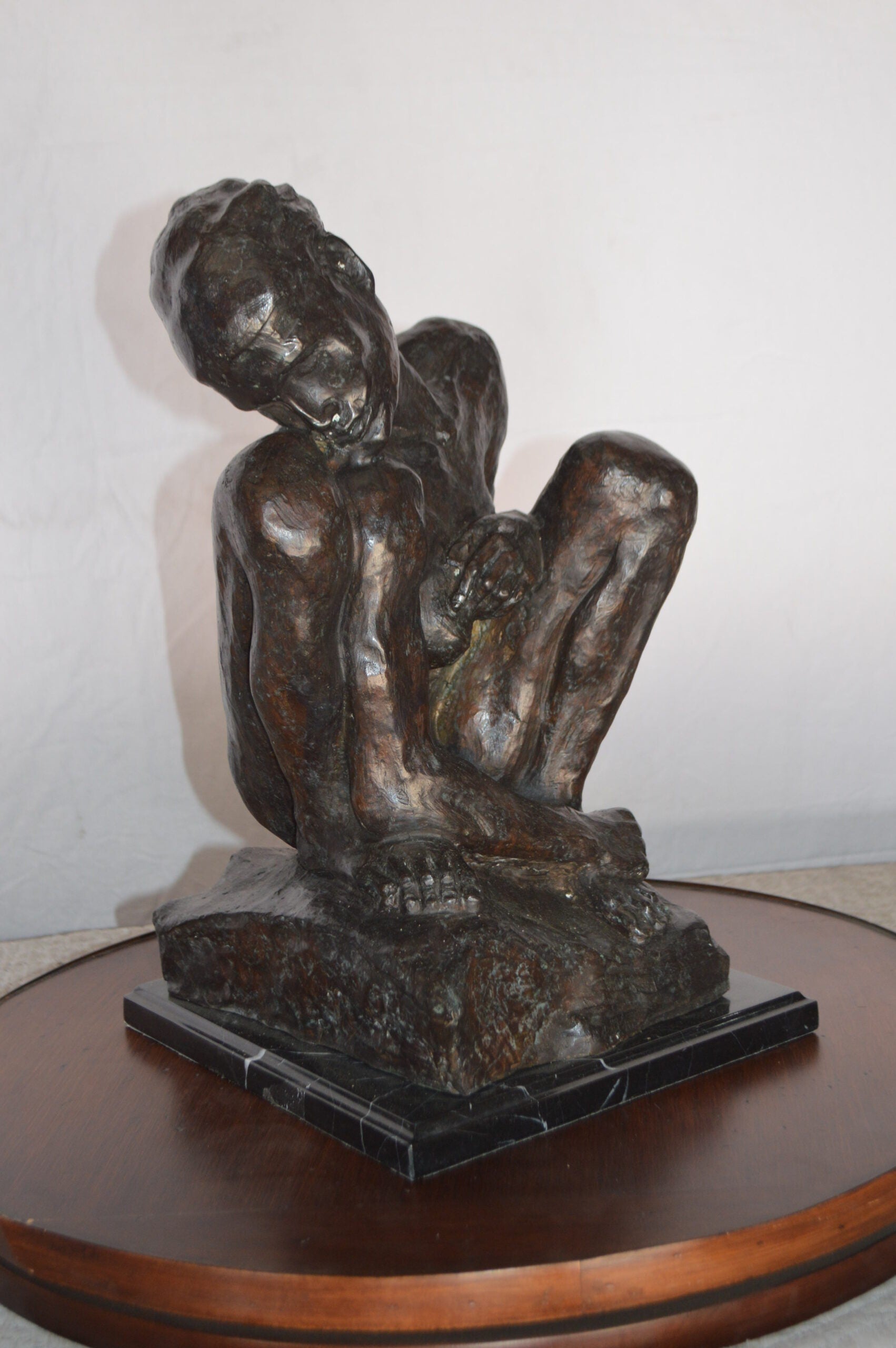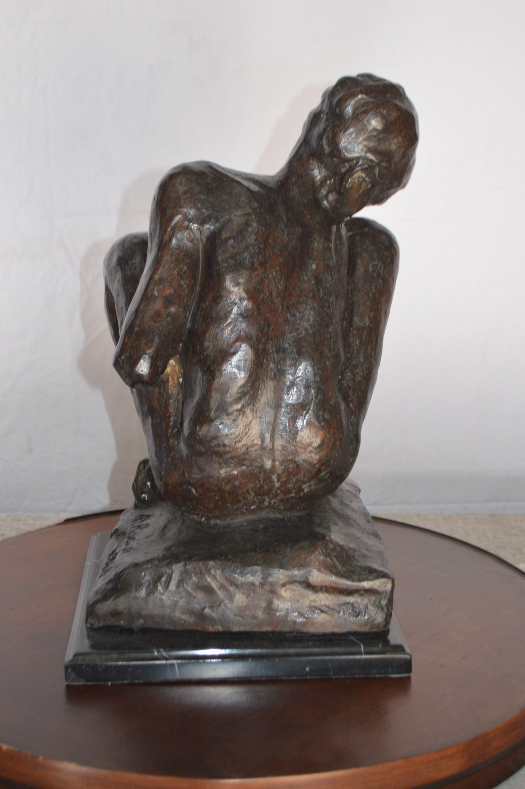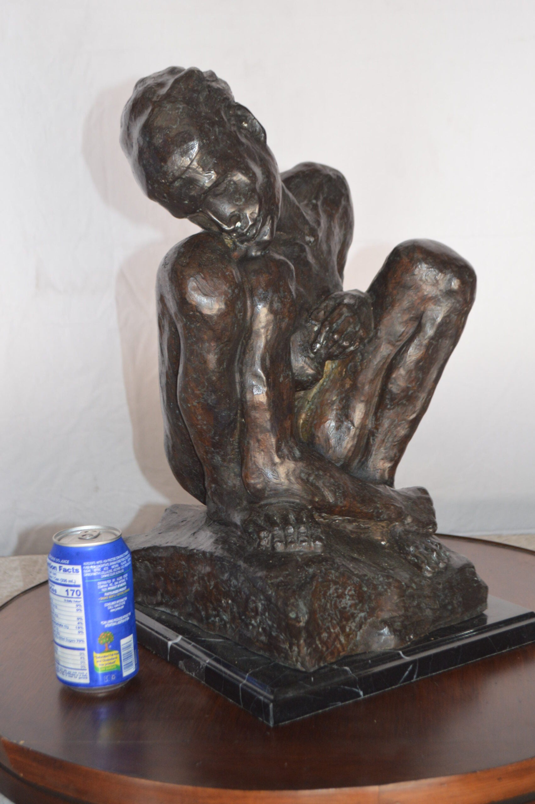 This is a pure Bronze Statue replica of The Crouching Woman by Auguste Rodin. Based on the couple from "Dante's Inferno." AUGUSTE RODIN (1840-1917). In between Romanticism and Impressionism this self-willed Frenchman created some of the most famous pieces known in the art of sculpting. He was very talented at conveying feeling in his compositions by emphasizing gesture. Also, his rough surface texture with deep hollows added strong shadows and naturalism to the human form. Rodin's goal, as he put it, was "to render inner feelings through muscular movement." He achieved this aim by joining his profound knowledge of anatomy and movement with special attention to the body's surfaces, saying, "The sculptor must learn to reproduce the surface, which means all that vibrates on the surface, soul, love, passion, life...Sculpture is thus the art of hollows and mounds, not of smoothness, or even polished planes." Size: 11"L x 16"W x 18"H. Weight is: 44Lb