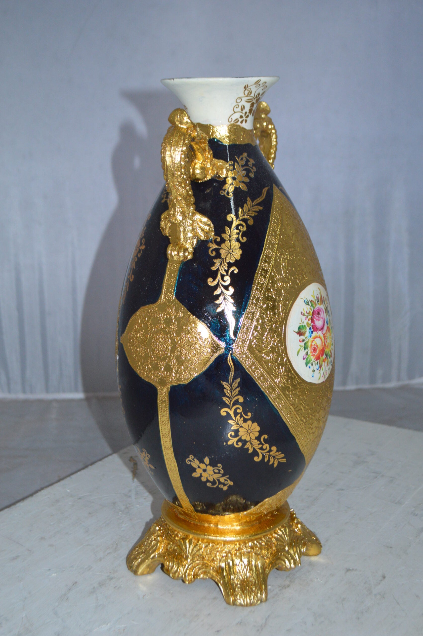 A beautiful large size Decoration Vase (French Vase replica) with Blue, White Gold and Pink colors, may be sold in pairs if available. Note that this vase is not made of porcelain. This vase can be a great addition to any area of the home, office or patio. Size: 7"L x 9"W x 18"H. Weight is: 5Lb