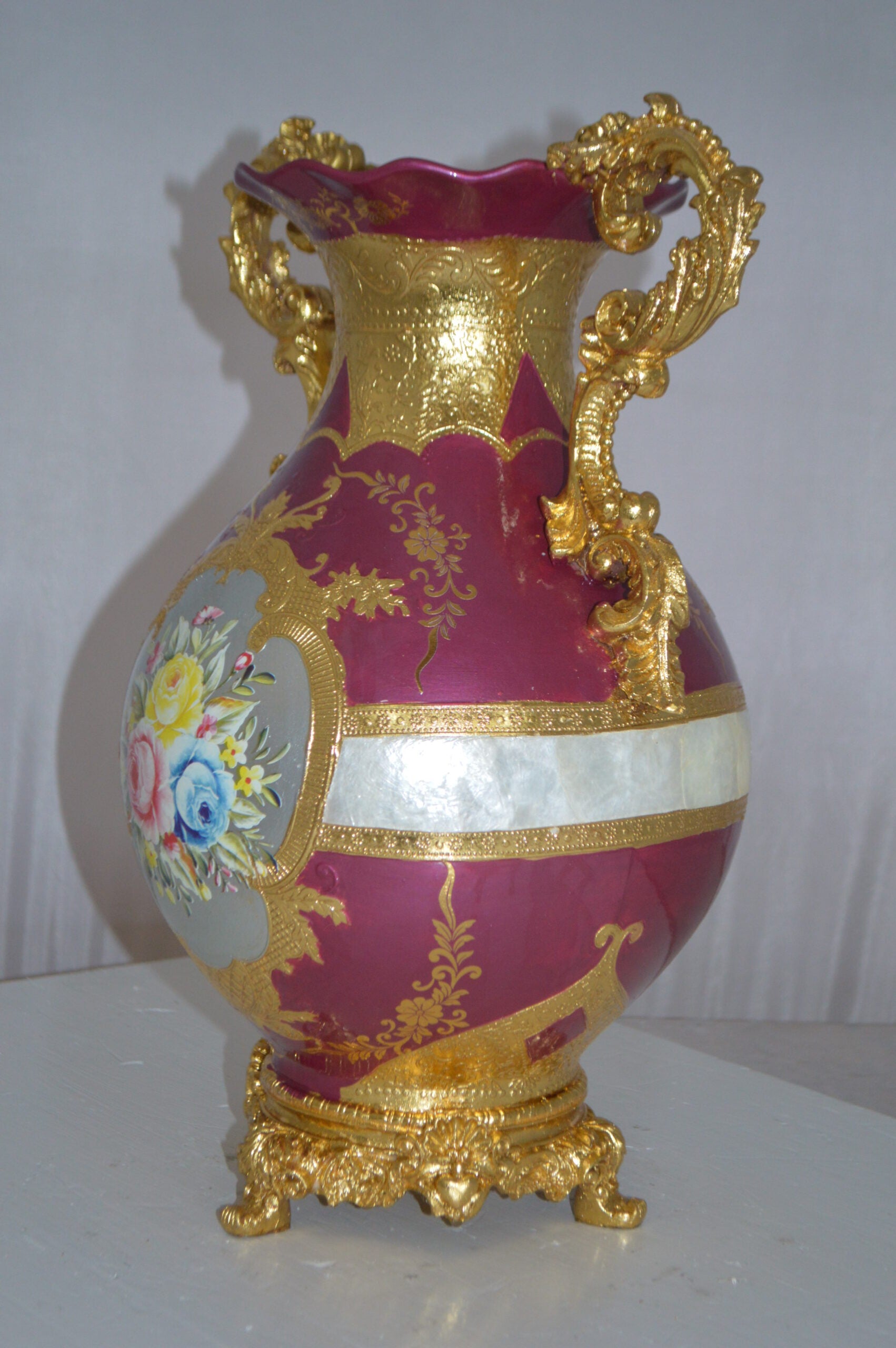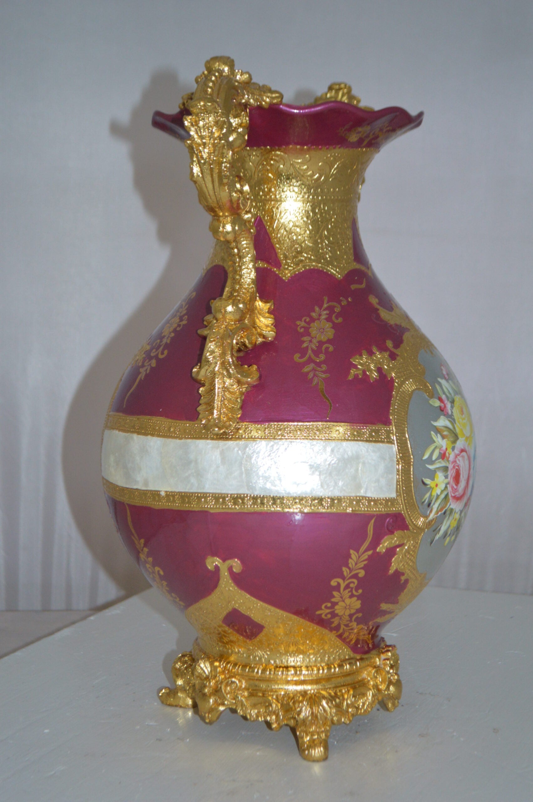 A beautiful Medium size Decoration Vase (French Vase replica) with White Gold and Pink soft colors, may be sold in pairs if available. Note that this vase is not made of porcelain. This vase can be a great addition to any area of the home, office or patio. Size: 12"L x 9"W x 17"H. Weight is: 6Lb