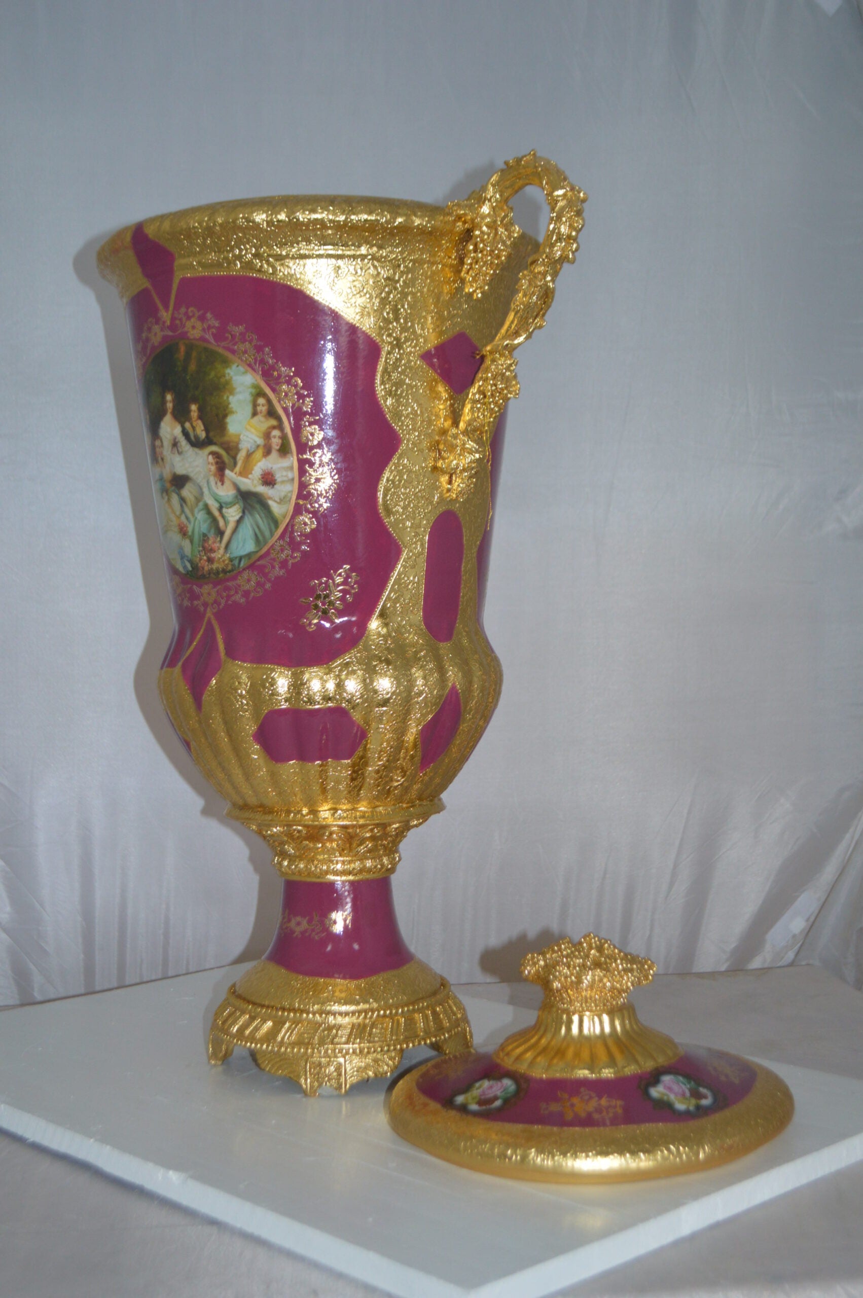 A beautiful large size Decoration Vase (French Vase replica) with White Gold and Pink soft colors, may be sold in pairs if available. Note that this vase is not made of porcelain. This vase can be a great addition to any area of the home, office or patio. Size: 23"L x 16"W x 33"H. Weight is: 27Lb