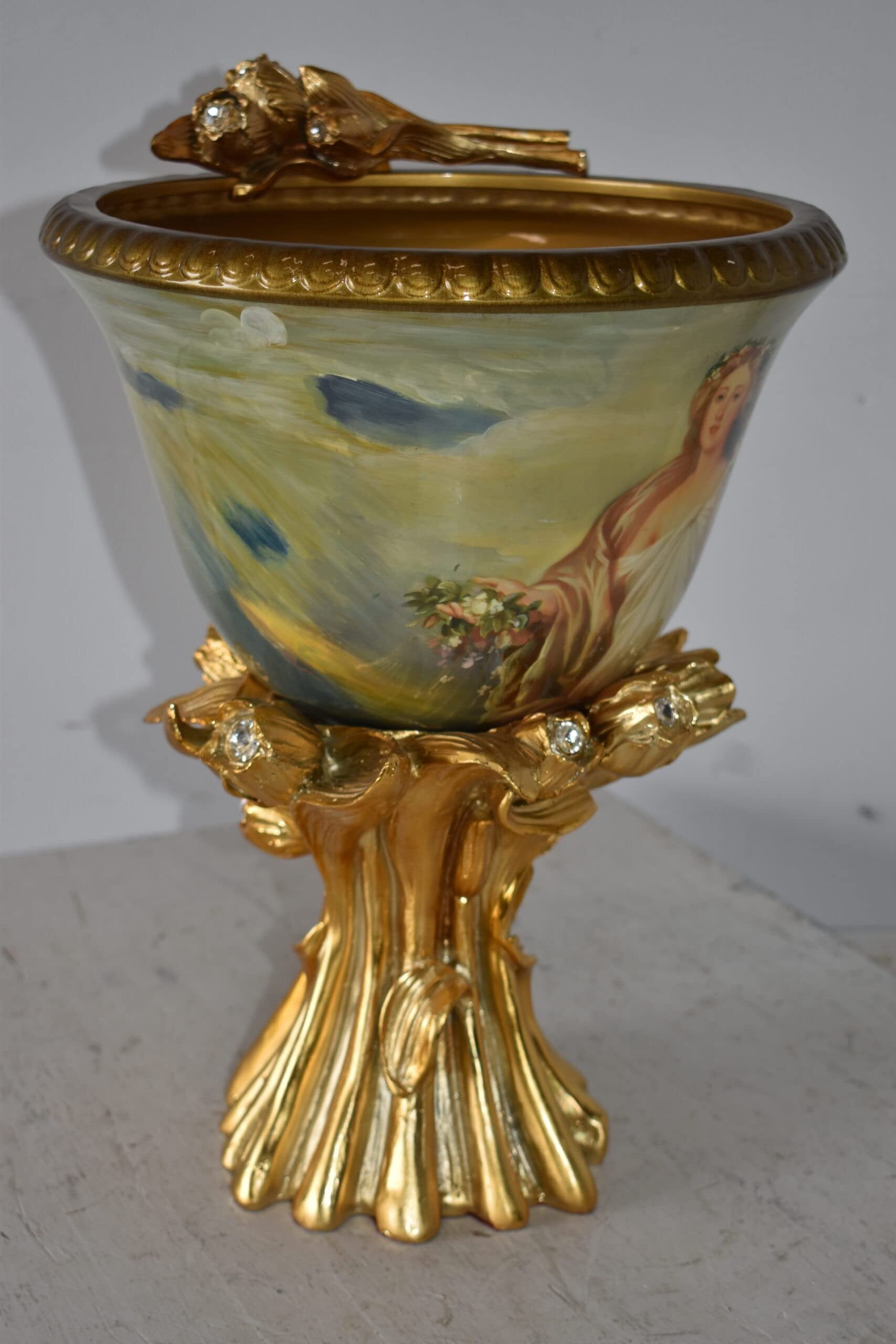 This beautiful vase sits atop a rounded golden base. Carefully designed with a replica painting of fairy flora, it is sure to stop eyes in any room. This resin statue carries intricate work and combines different textures to bring beauty to your home. Size: 12"L x 12"W x 18"H. Weight is: 7Lb