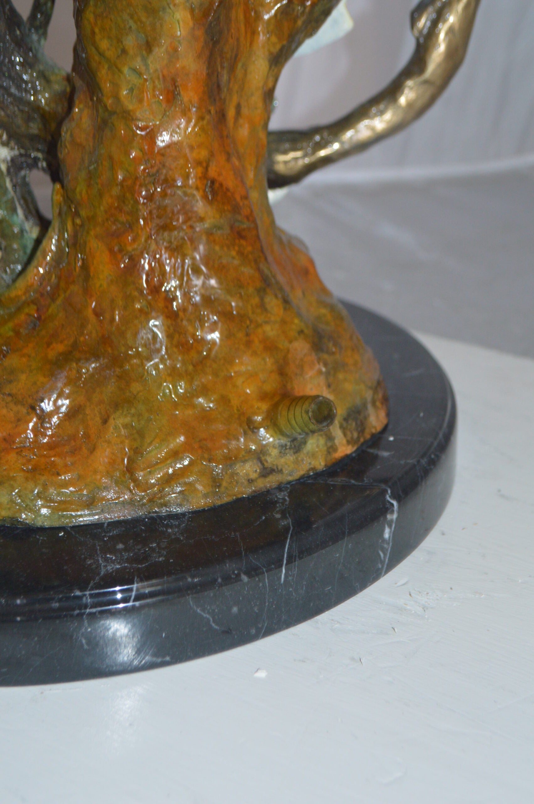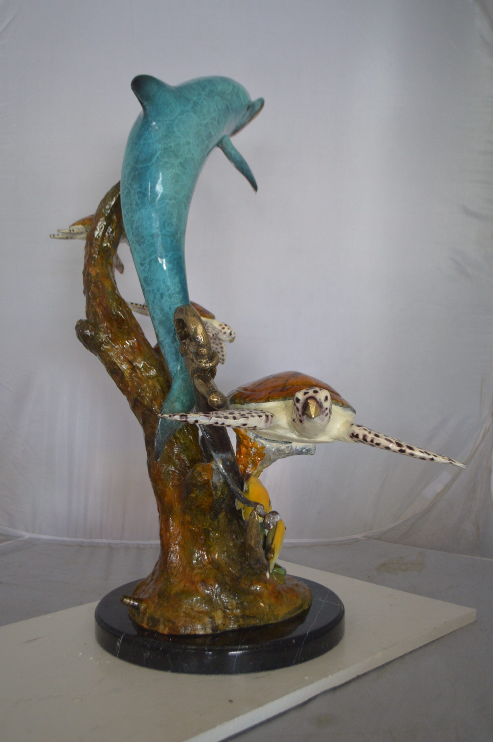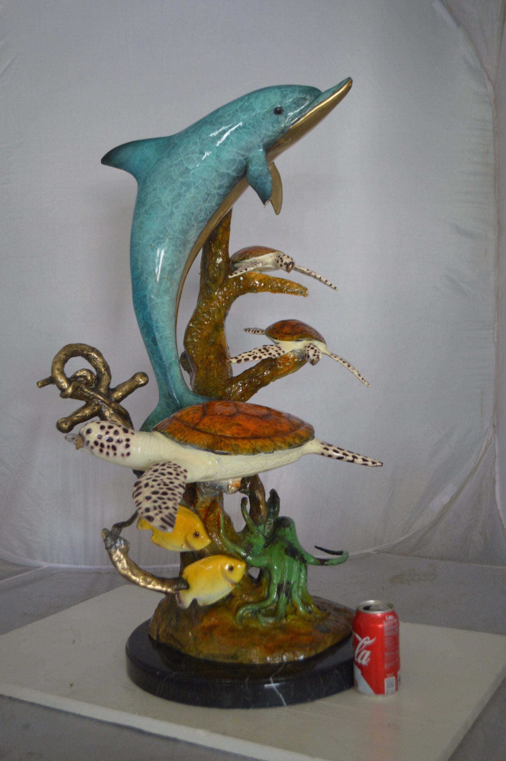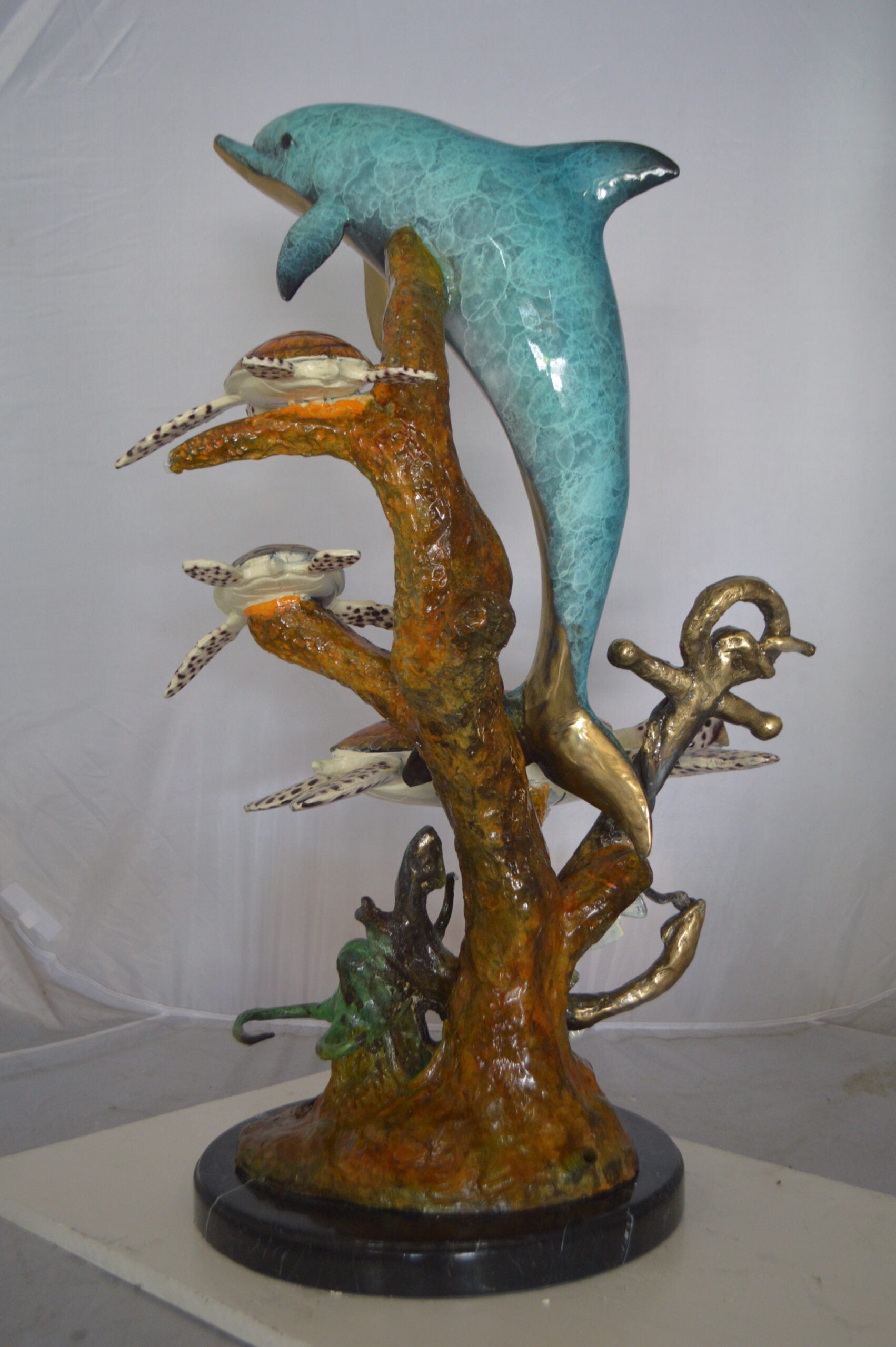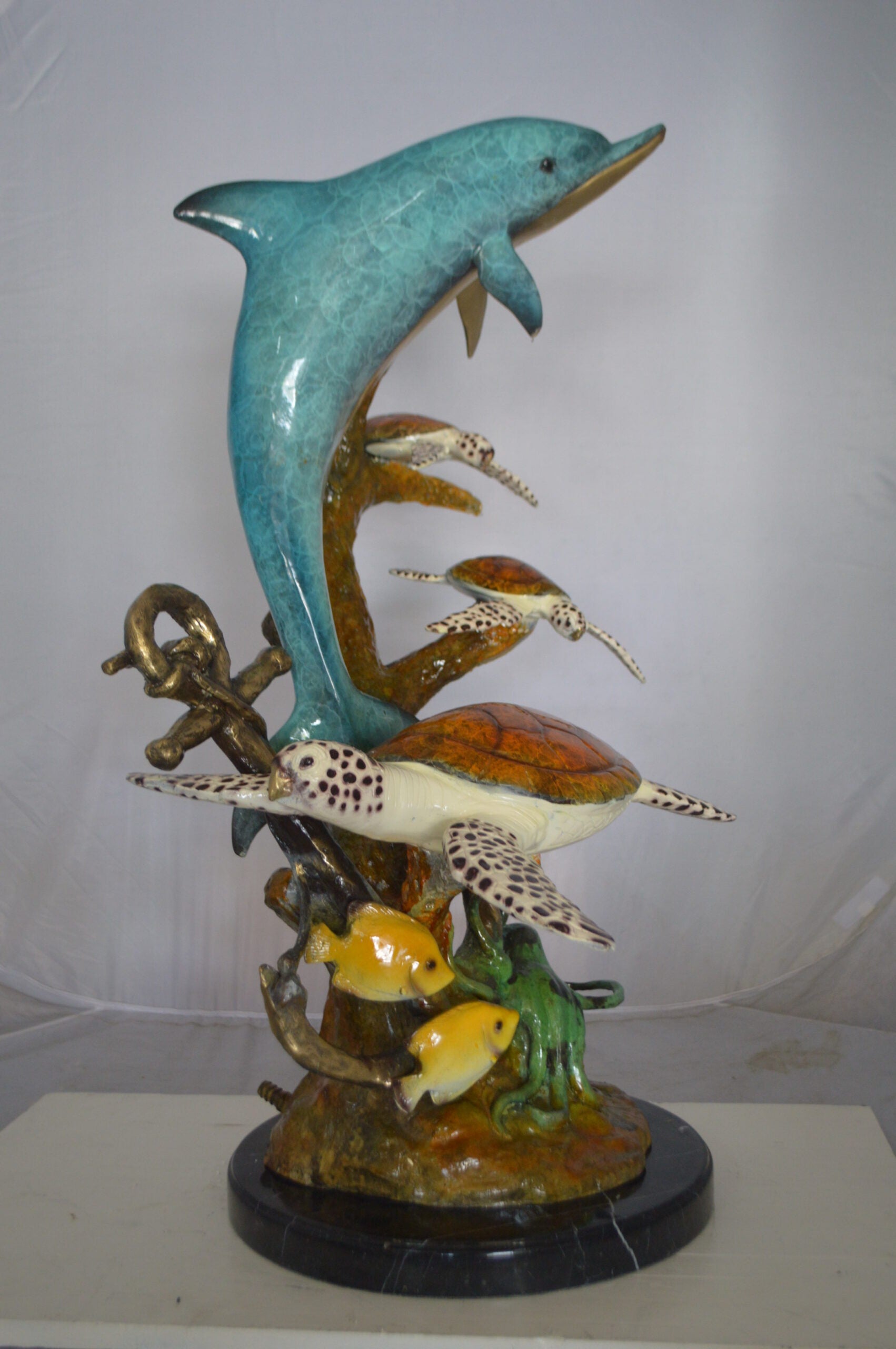 Surprise your garden guests with this large size outdoor Bronze fountain Statue of a Dolphin and three turtles swimming in the deep water by a rusty boat anchor providing a show to its audience. The dolphin is equipped with a hose that sprays water out of its mouth with the use of a fountain pump (pump is not included). Produced using superior quality bronze and a traditional casting method that yields pristine details. The patina chosen for this Timeless Creation is a mix of hand finishing with different colors and Polychrome techniques also referred to as enameling over bronze. This impressive Bronze Statue will be a permanent fixture on the grounds of your estate for years to come. Size: 24"L x 34"W x 36"H. Weight is: 89Lb