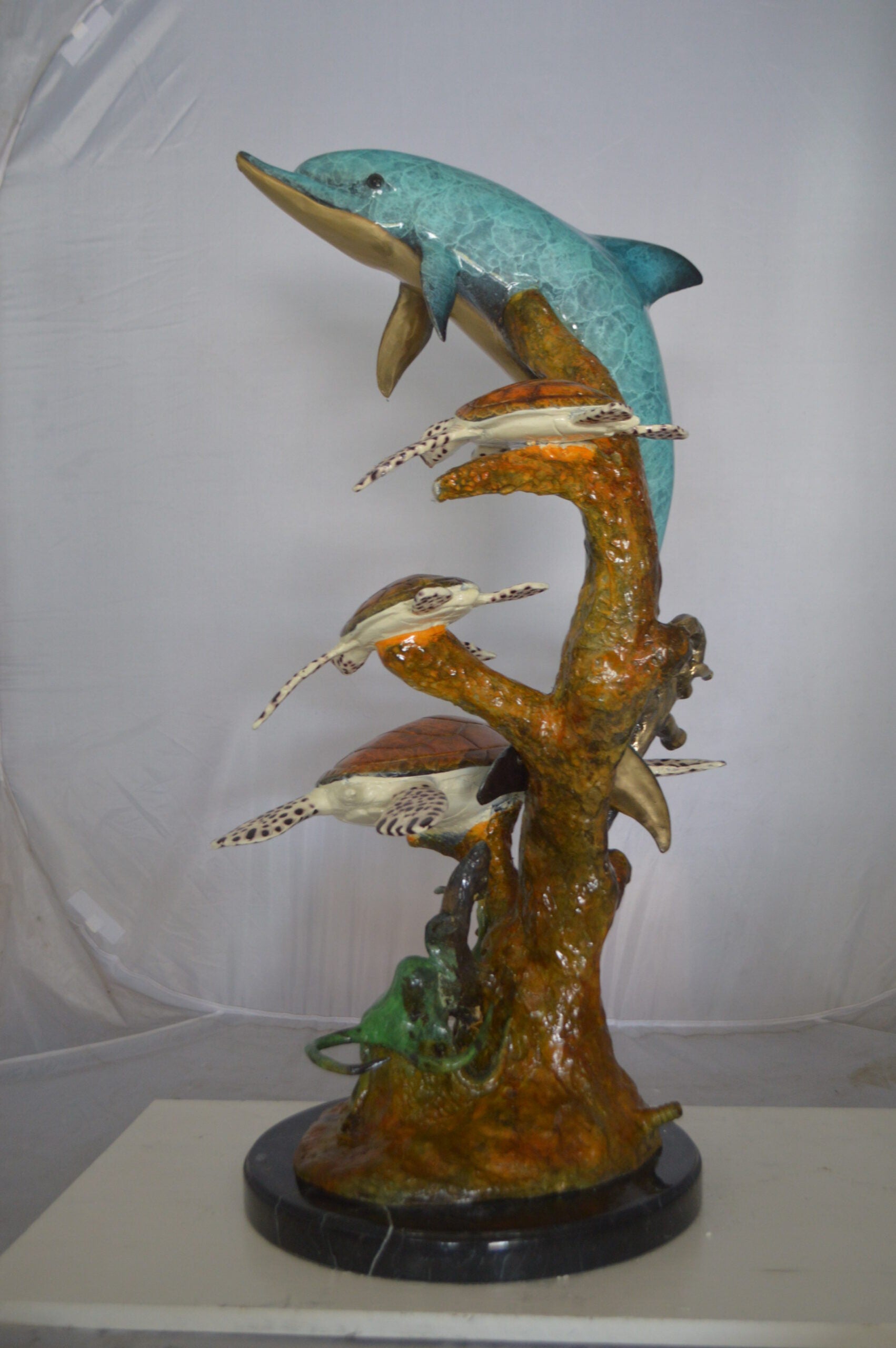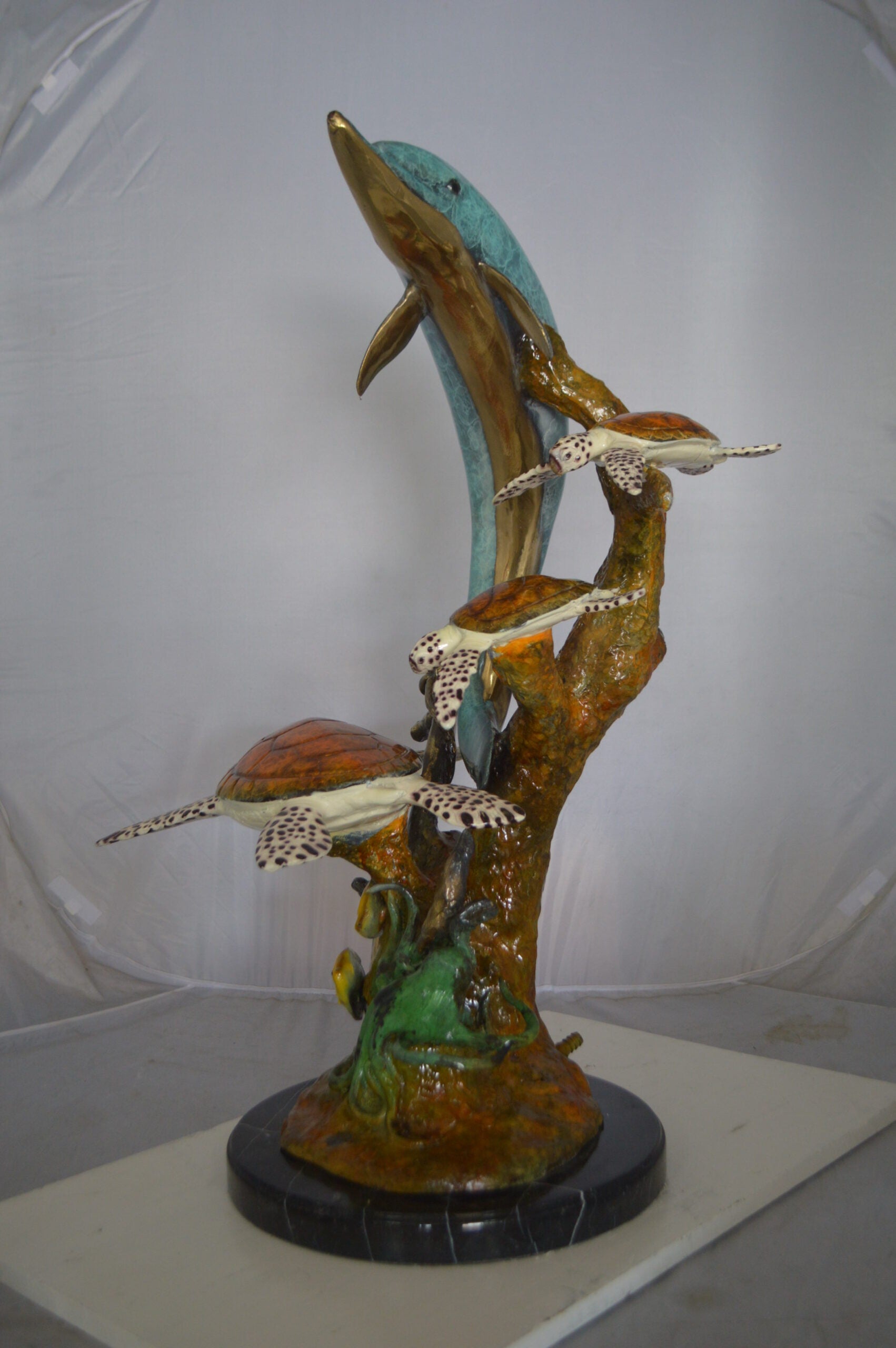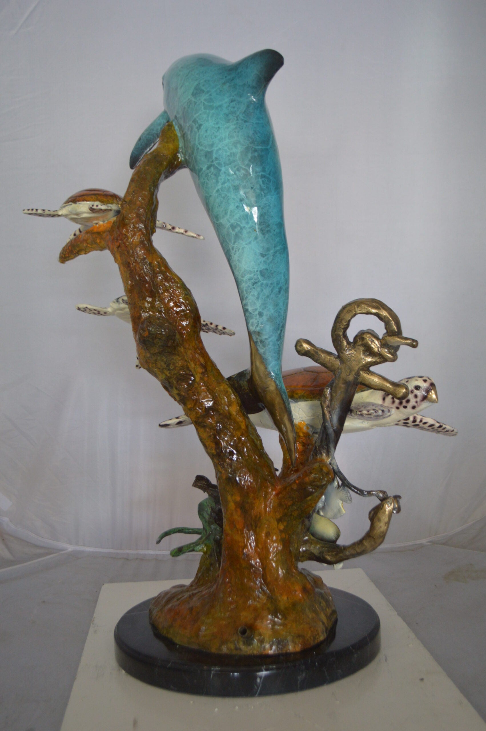 Dolphin medium with Turtles Fountain Bronze Statue - Size: 24"L x 34"W x 36"H.