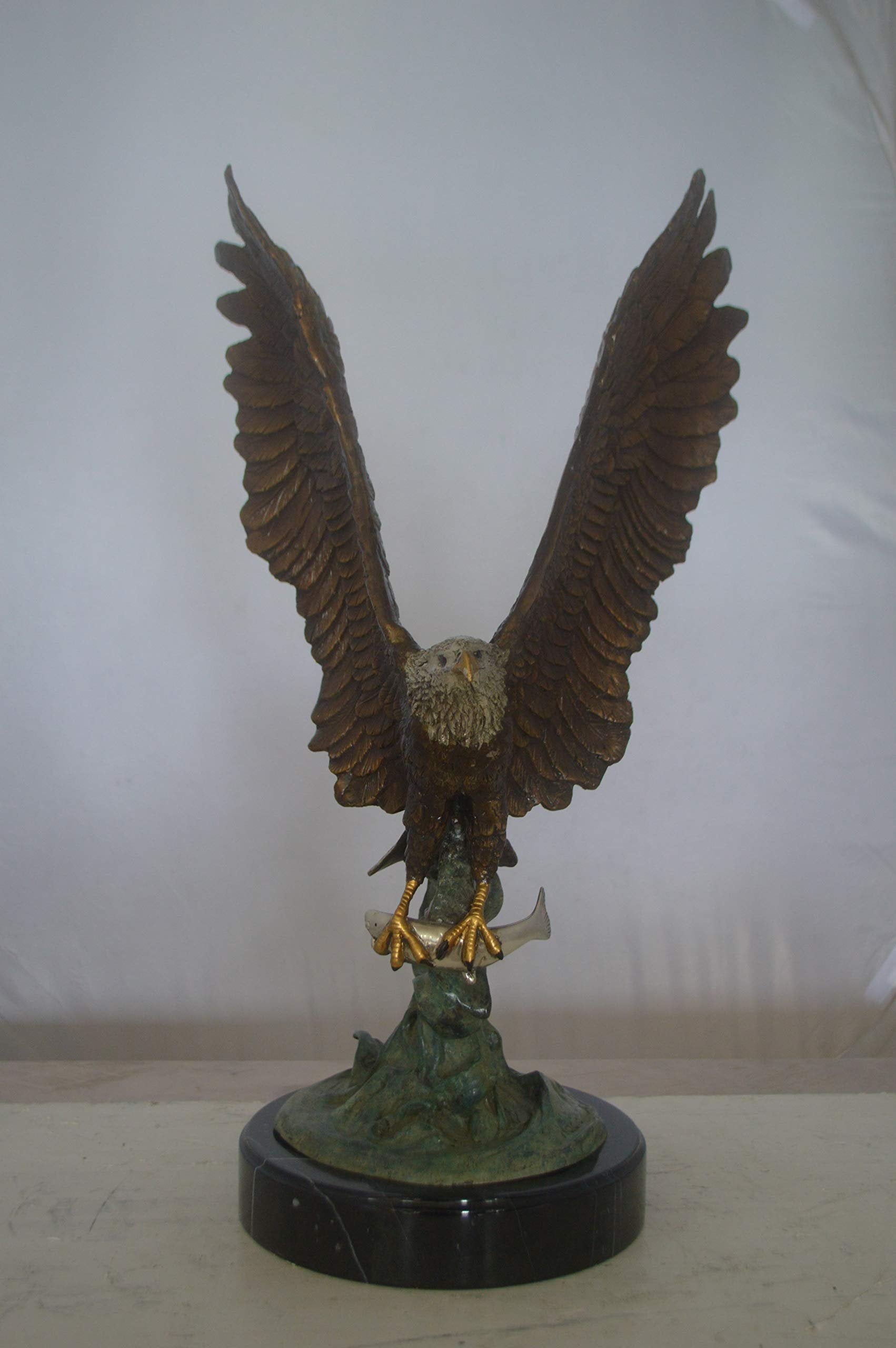 A large eagle made of bronze flying of the water right after catching his prey. The eagle is shown with marvelous detail to the feathers, beaks and eyes each with a unique expression and pose. This very fine and unique abstract was casted using the ancient old Lost Wax Method with brown patina finish for preservation. The patina chosen for this Timeless Creation is a mix of hand finishing with different colors and Polychrome techniques also referred to as enameling over bronze. This impressive Bronze Statue will be a permanent fixture on the grounds of your estate for years to come. Size: 14"L x 13"W x 26"H. Weight is: 38Lb