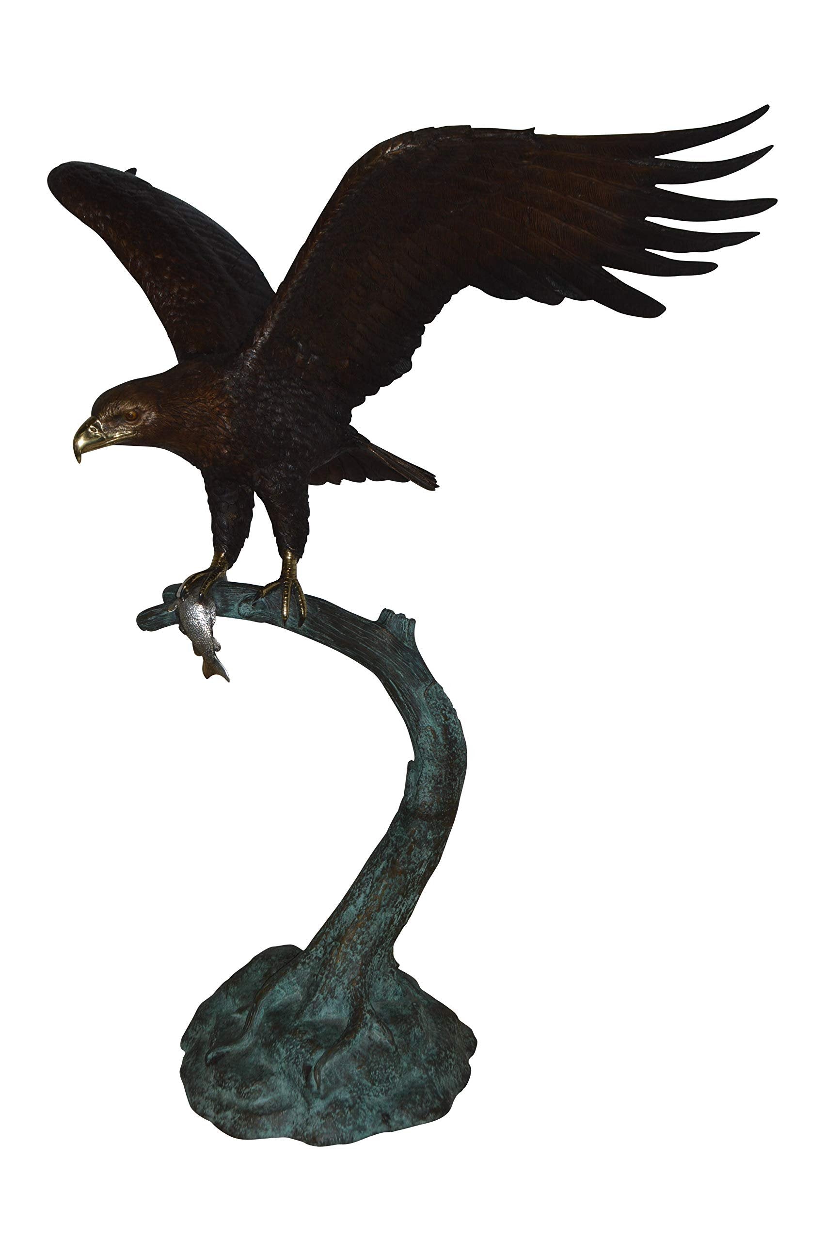 Sculpted beautifully, a large statue of an eagle standing on a tree proudly holding its prey. The eagle head captures the essence of the majestic bird of prey. The eagle's very large hooked beak is used for tearing flesh from their unfortunate prey. The extremely keen eyesight of the eagle stares out spotting a potential prey from a very long distance. Through the ages and different cultures, the eagle has represented spiritual protection, carrier of prayers, strength, courage, wisdom, illumination of spirit, healing. This impressive Bronze Statue will be a permanent fixture on the grounds of your estate for years to come. Size: 44"L x 50"W x 65"H. Weight is: 130Lb