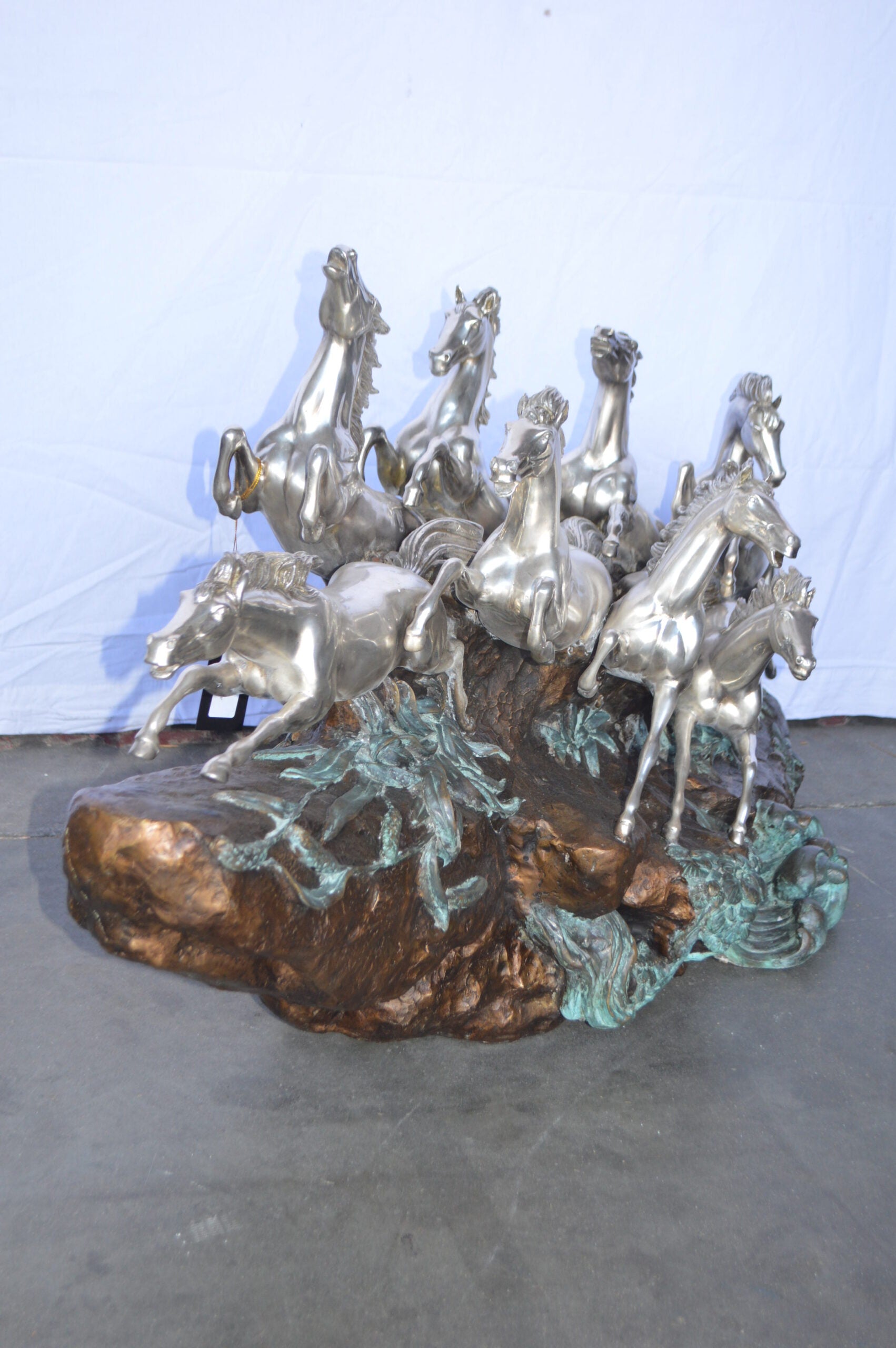 This giant size bronze statue of eight horses running bronze statue with brown and silver Finish. This very fine, large, heavy and unique bronze statue was casted using the ancient old Lost Wax Method. The colors chosen for this Timeless Creation is stained in silver, green and brown patina finish for preservation, handmade and pure bronze. This impressive Bronze Statue will be a permanent fixture on the grounds of your estate for years to come. Size: 59"L x 20"W x 28"H. Weight is: 132Lb