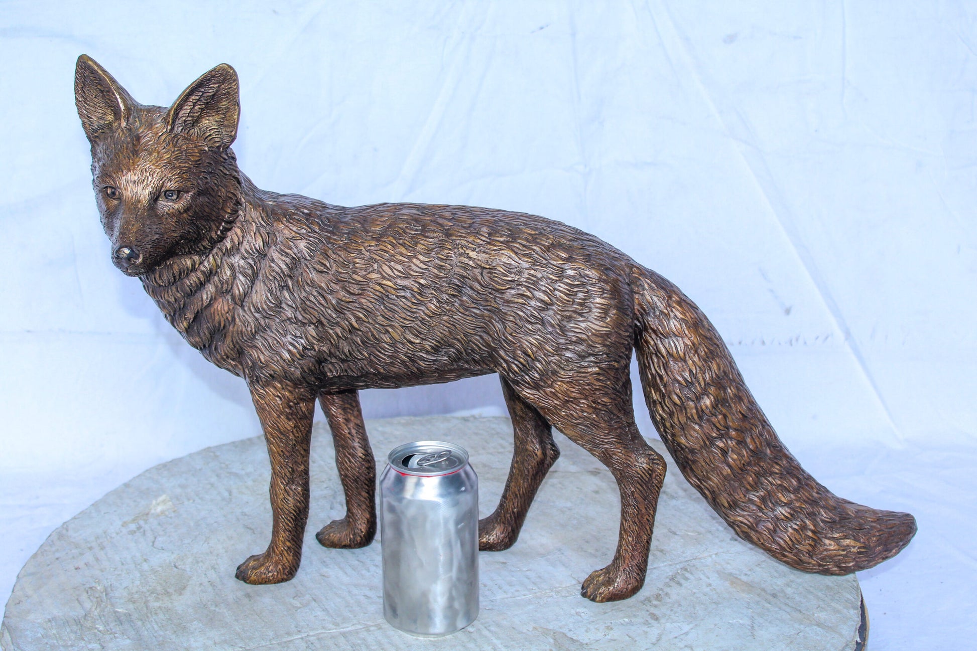 Elegant standing fox bronze statue, stunning wildlife decor, handcrafted and casted using traditional lost wax method. This exquisite piece embodies the grace and beauty of a fox in fine detail, perfect for nature enthusiasts and collectors seeking distinctive and artful home decor. Size: 24"L x 6"W x 15"H. Weight: 14Lb