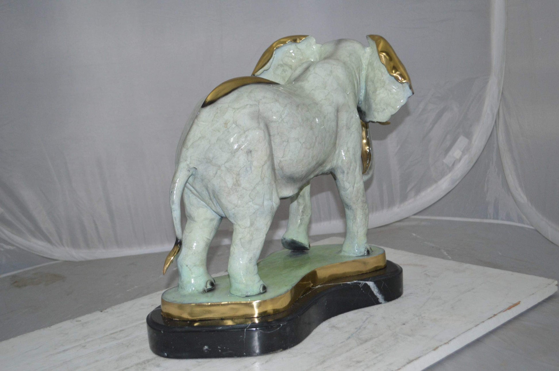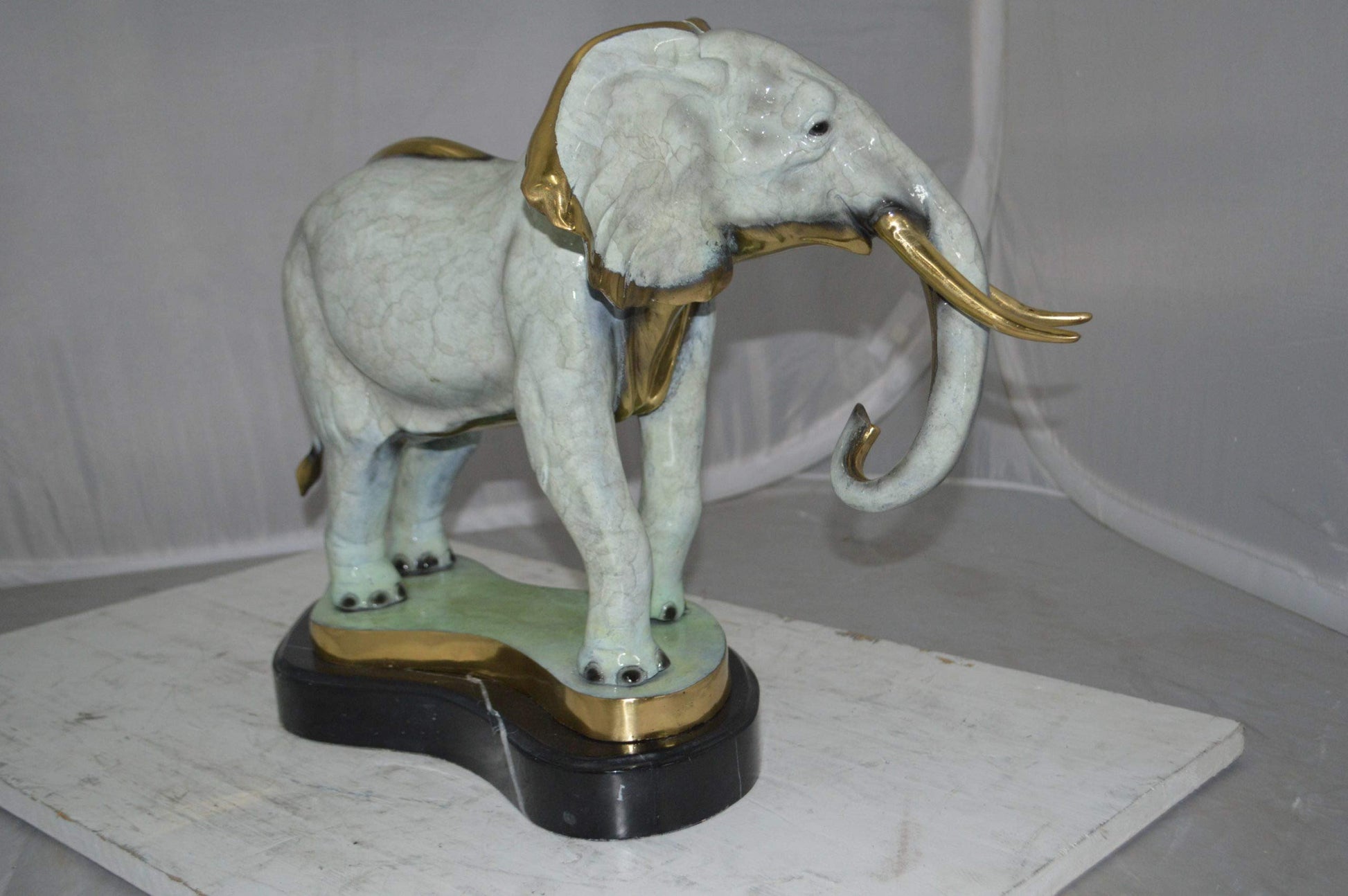 This Elephant statue looks ready to march right off of its platform. It looks that real with the detailing that is found from the texture of the hide of the elephant to the face and trunk, the details make these bronze pieces. Give as a gift or keep it for yourself. Either way you will find that it is a great value and will add enjoyment and life into your home. Size: 28"L x 12"W x 17"H. Weight is: 39Lb