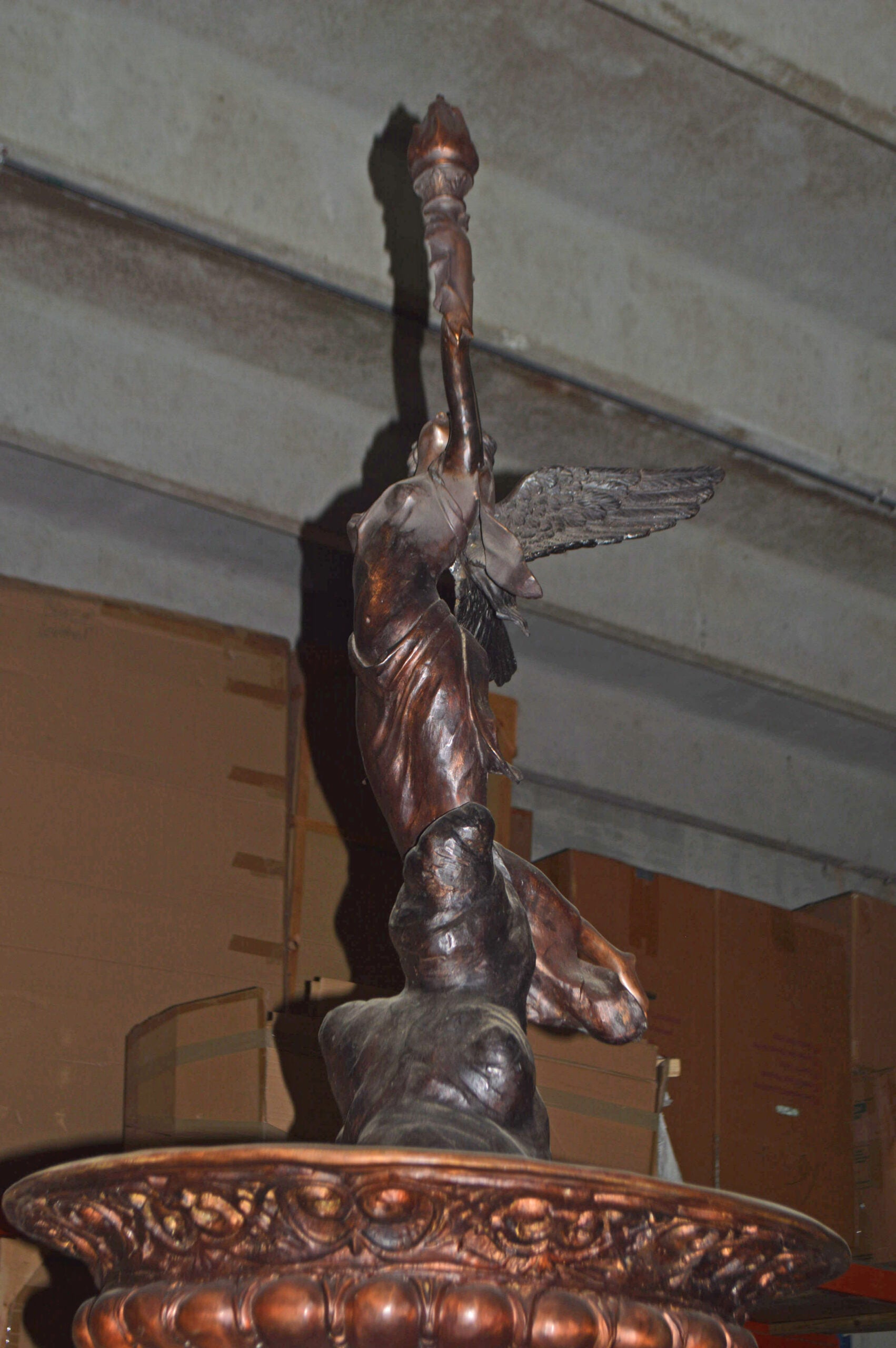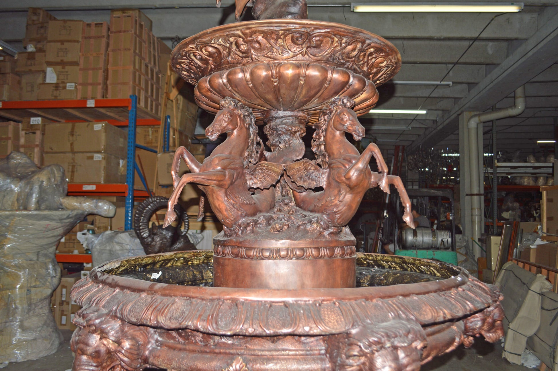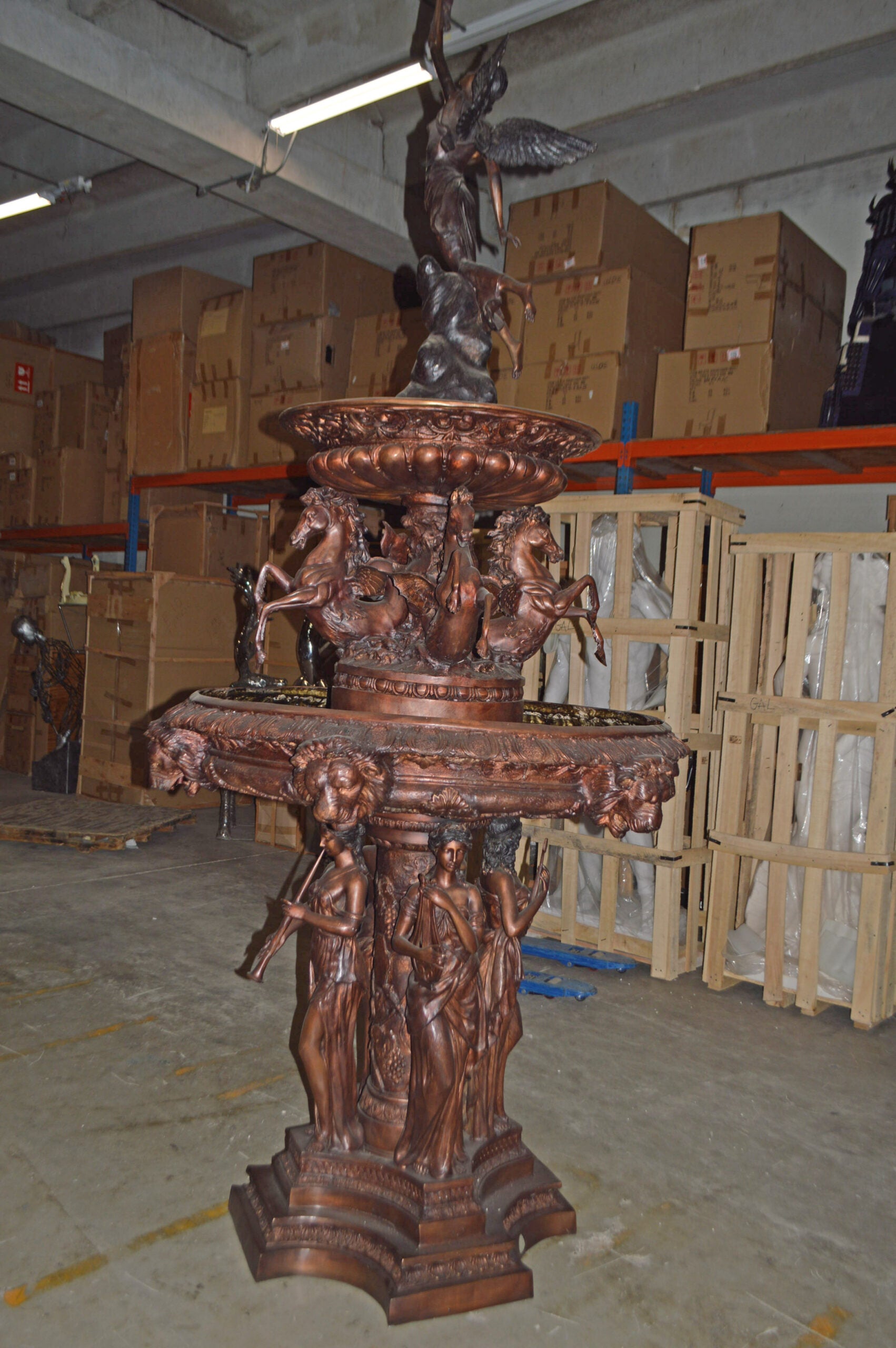 This eleven feet tall, Tiered Outdoor pond Fountain is a grand addition to your yard. Water cascades down from the angel torch, through the scalloped tiers, overflow the first and second basin and down to the pond at the bottom. Water also is sprayed out of the horses and the lions mouth, all with the use of a fountain pump (Pump and Pond are not included, customer may need to build a pond around the base of the fountain). Produced using superior quality bronze and a traditional casting method that yields pristine details, this impressive Bronze Statue will be a permanent fixture on the grounds of your estate for years to come. Size: 55"L x 55"W x 135"H. Weight is: 350Lb