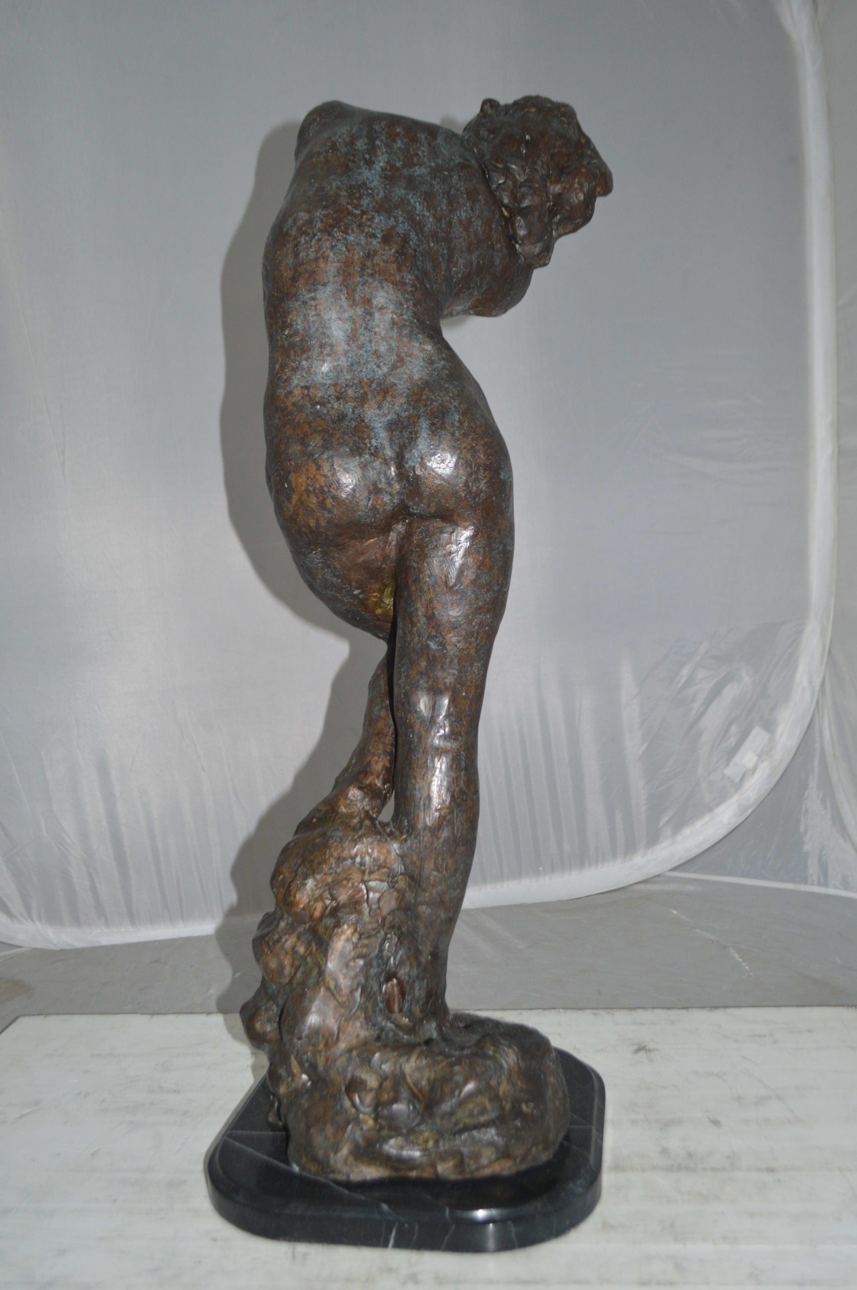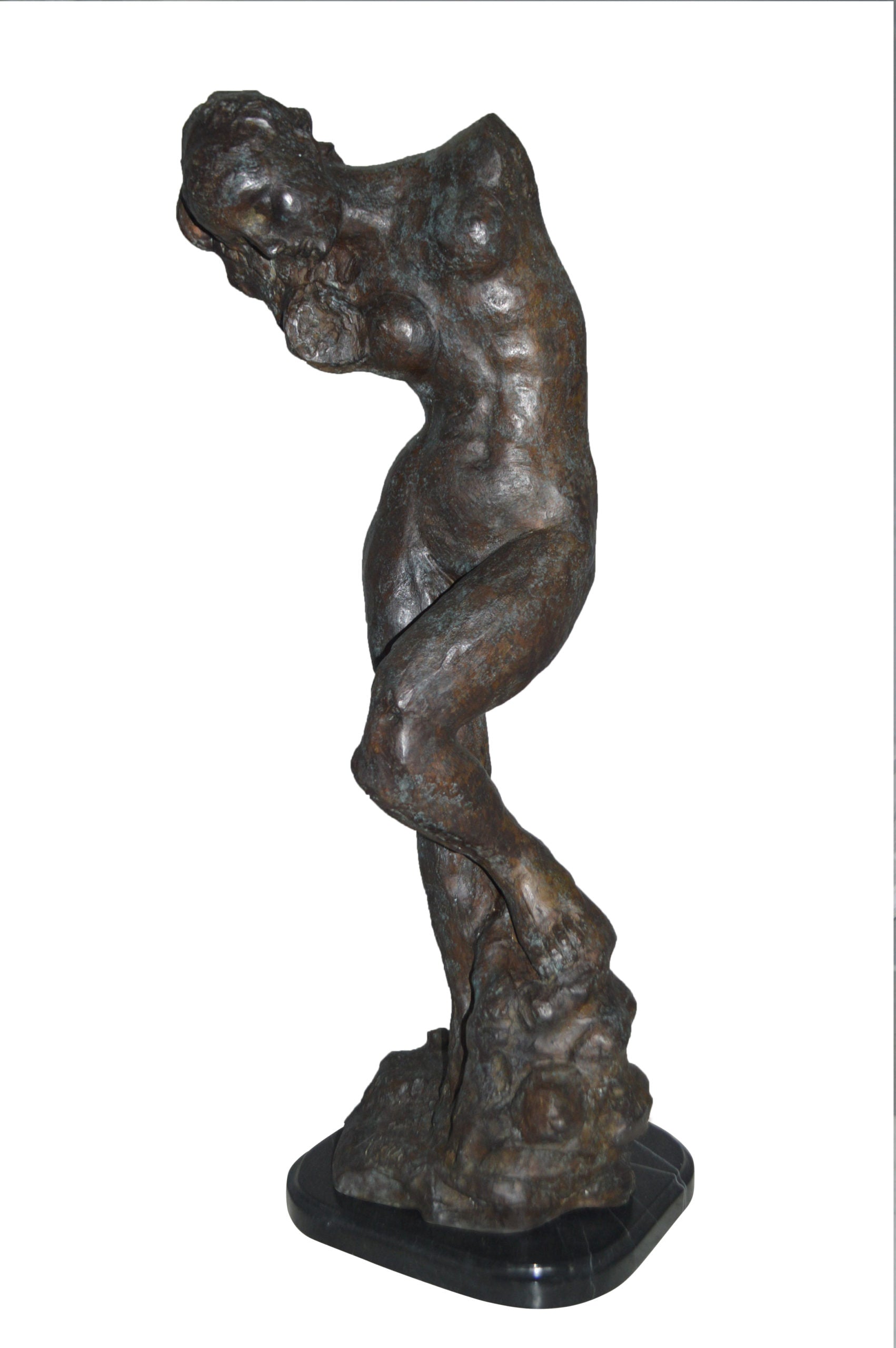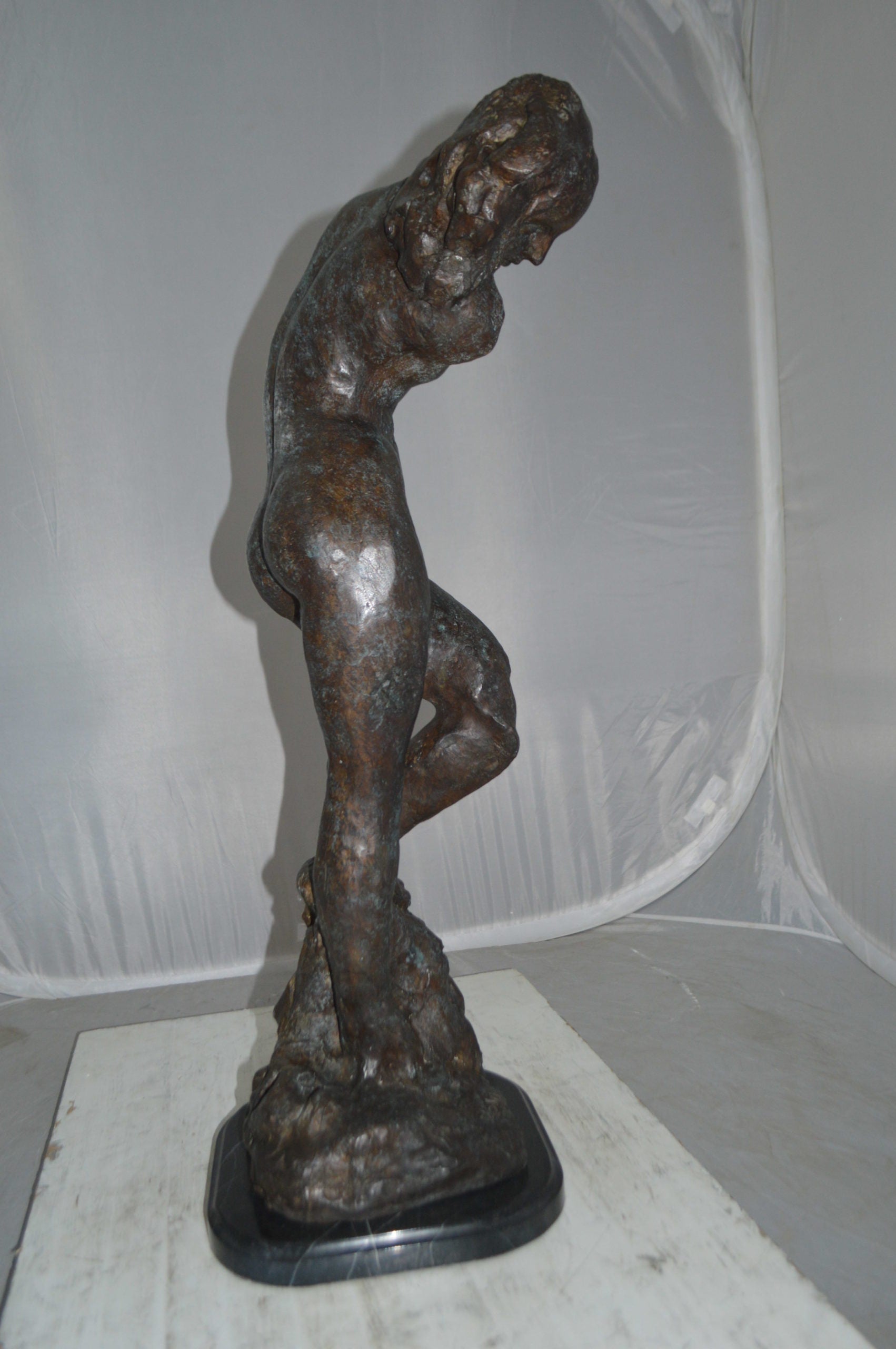 Large 100% Bronze Statue replica of Eve (Adam and Eve) by Auguste Rodin. Based on the couple from "Dante's Inferno." AUGUSTE RODIN (1840-1917). In between Romanticism and Impressionism this self-willed Frenchman created some of the most famous pieces known in the art of sculpting. He was very talented at conveying feeling in his compositions by emphasizing gesture. Also, his rough surface texture with deep hollows added strong shadows and naturalism to the human form. Rodin's goal, as he put it, was "to render inner feelings through muscular movement." He achieved this aim by joining his profound knowledge of anatomy and movement with special attention to the body's surfaces, saying, "The sculptor must learn to reproduce the surface, which means all that vibrates on the surface, soul, love, passion, life...Sculpture is thus the art of hollows and mounds, not of smoothness, or even polished planes." (Adam Replica by Rodin is available in our online store) Size: 10"L x 10"W x 32"H. Weight is: 30Lb