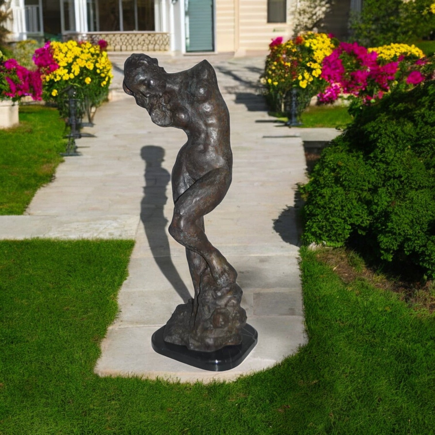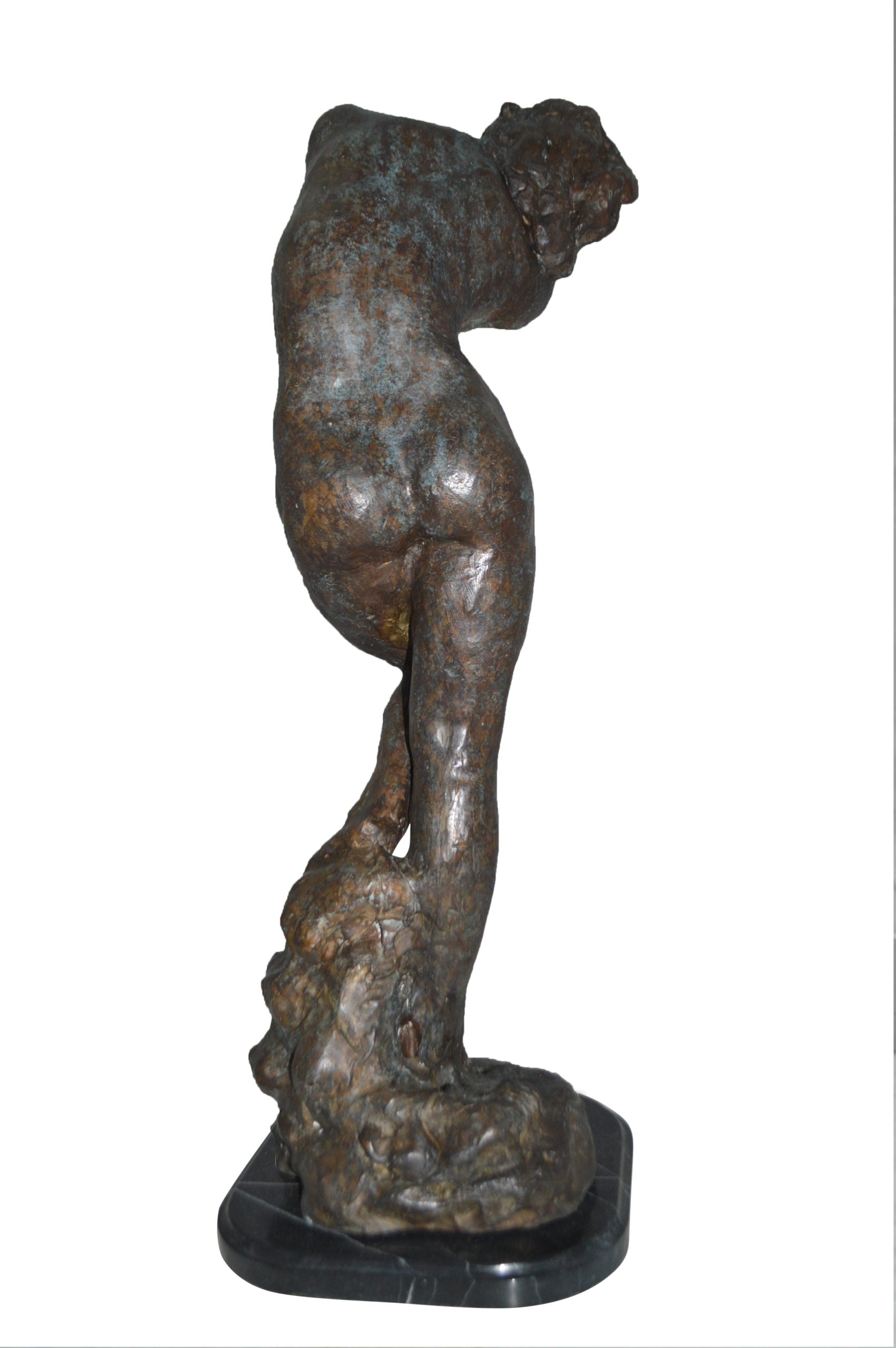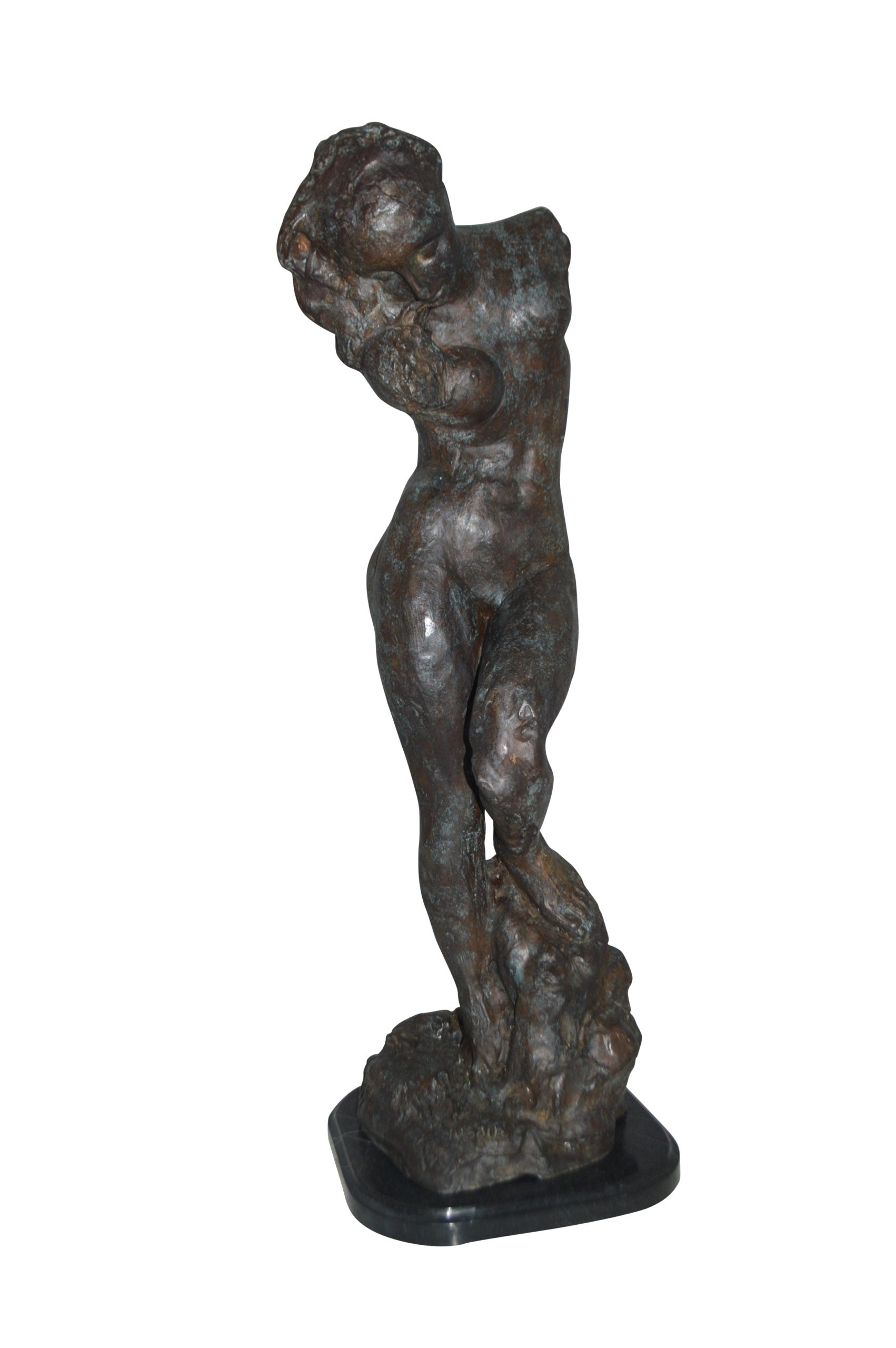 Large 100% Bronze Statue replica of Eve (Adam and Eve) by Auguste Rodin. Based on the couple from "Dante's Inferno." AUGUSTE RODIN (1840-1917). In between Romanticism and Impressionism this self-willed Frenchman created some of the most famous pieces known in the art of sculpting. He was very talented at conveying feeling in his compositions by emphasizing gesture. Also, his rough surface texture with deep hollows added strong shadows and naturalism to the human form. Rodin's goal, as he put it, was "to render inner feelings through muscular movement." He achieved this aim by joining his profound knowledge of anatomy and movement with special attention to the body's surfaces, saying, "The sculptor must learn to reproduce the surface, which means all that vibrates on the surface, soul, love, passion, life...Sculpture is thus the art of hollows and mounds, not of smoothness, or even polished planes." (Adam Replica by Rodin is available in our online store) Size: 10"L x 10"W x 32"H. Weight is: 30Lb