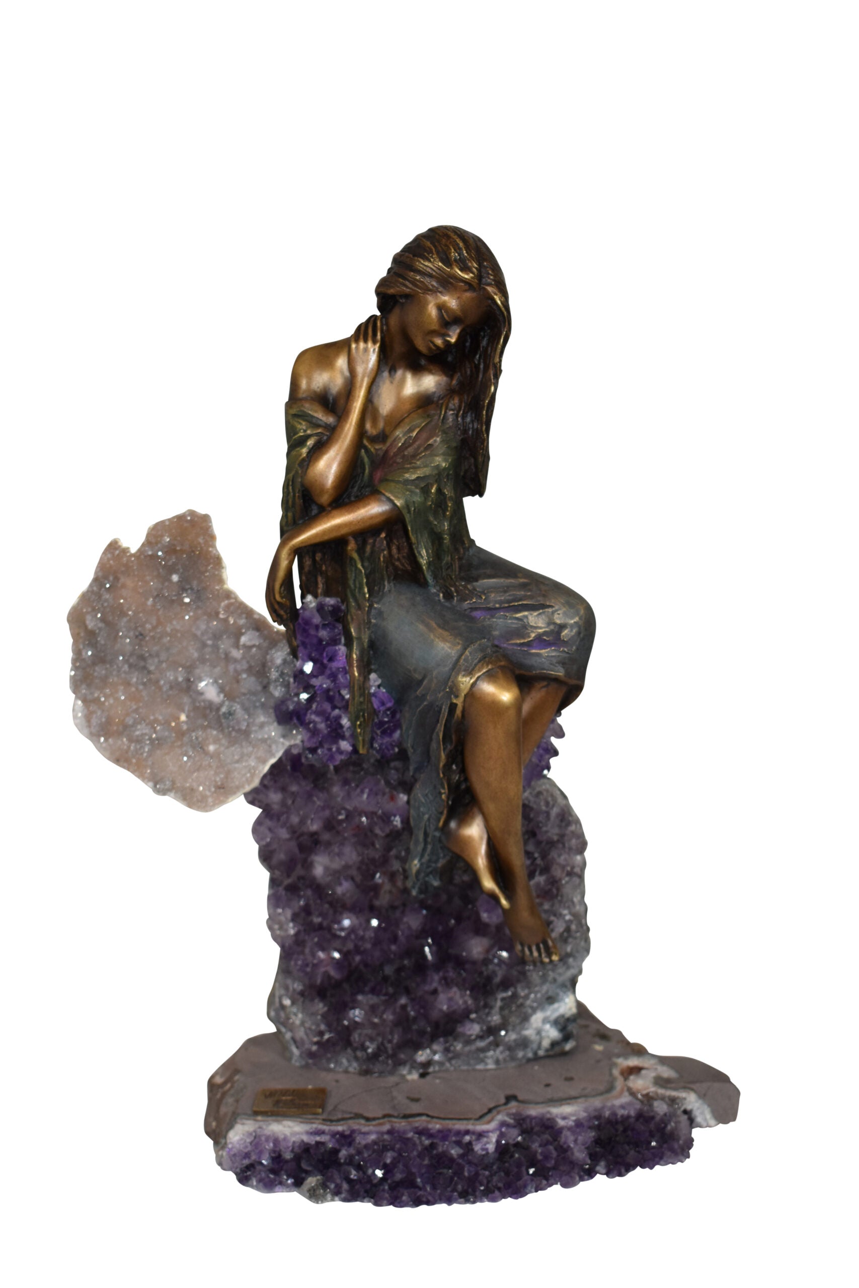 Ebano bronze sculpture, Evenfall, from the Vidal collection. An elegant and decorative bronze sculpture decorated with amethyst and rock crystals of a woman sitting on a verandah enjoying the scenery. This sculpture comes with a certificate of authenticity. Size: 12"L x 10"W x 17"H. Weight is: 26Lb