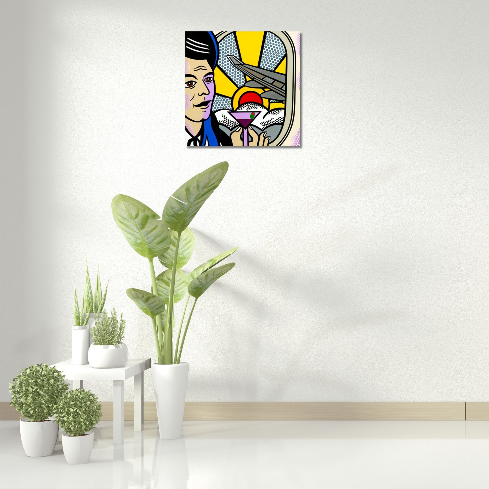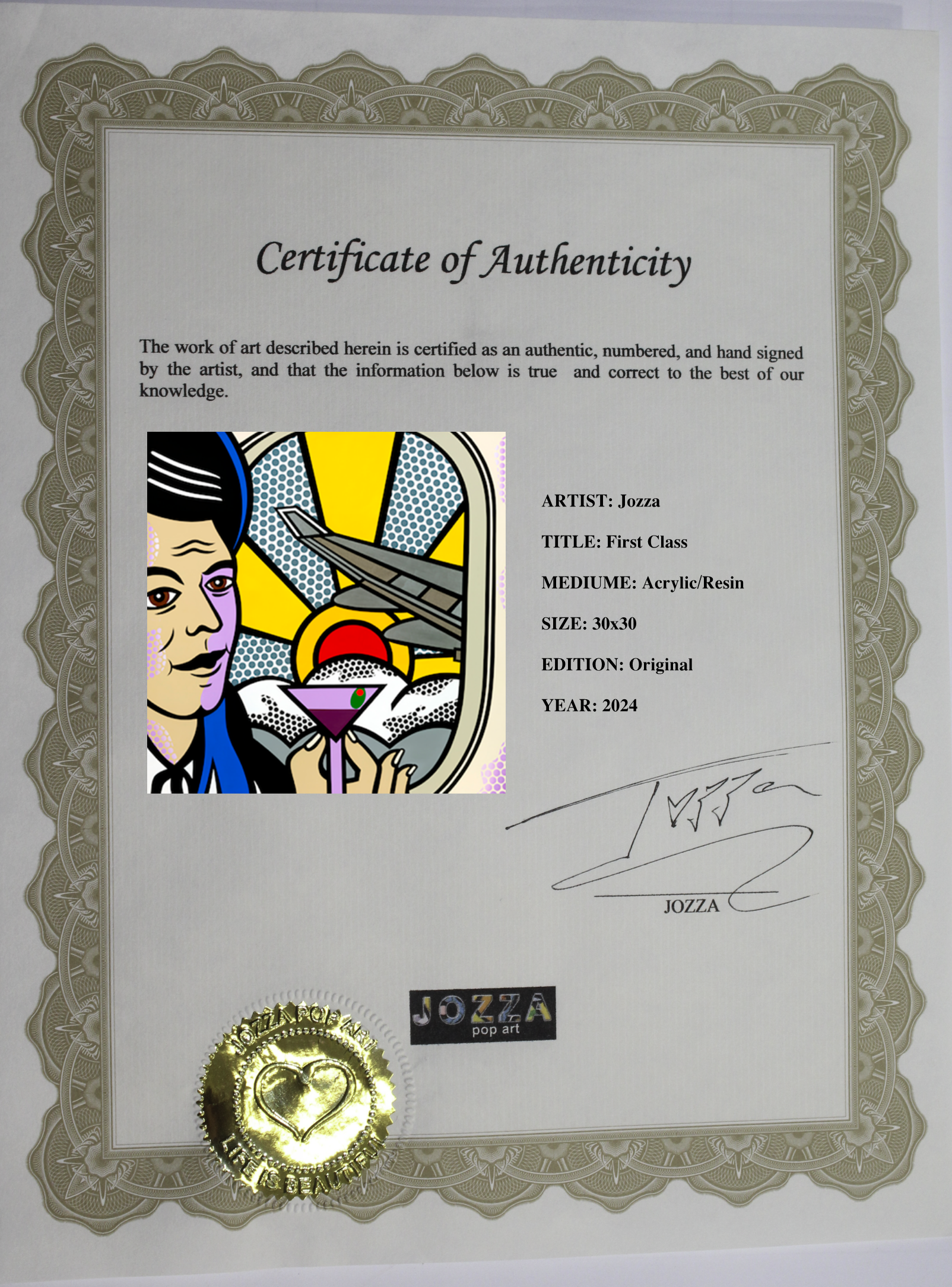 First Class 2, A Wall Art Painting by Jozza, Original Acrylic print on Canvas, hand signed and numbered by the artist. Jozza, born in 1958 in Hidrolandia, a small town located in central Brazil, one of the most exciting Pop Artists in the world today, creates his artistic vision with vibrant imagery and combinations of bright color and hard-edged abstract subjects. This artwork comes gallery wrapped, stretched ready to hang Size: 30"L x 30"W x 1"H. Weight is: 4Lb
