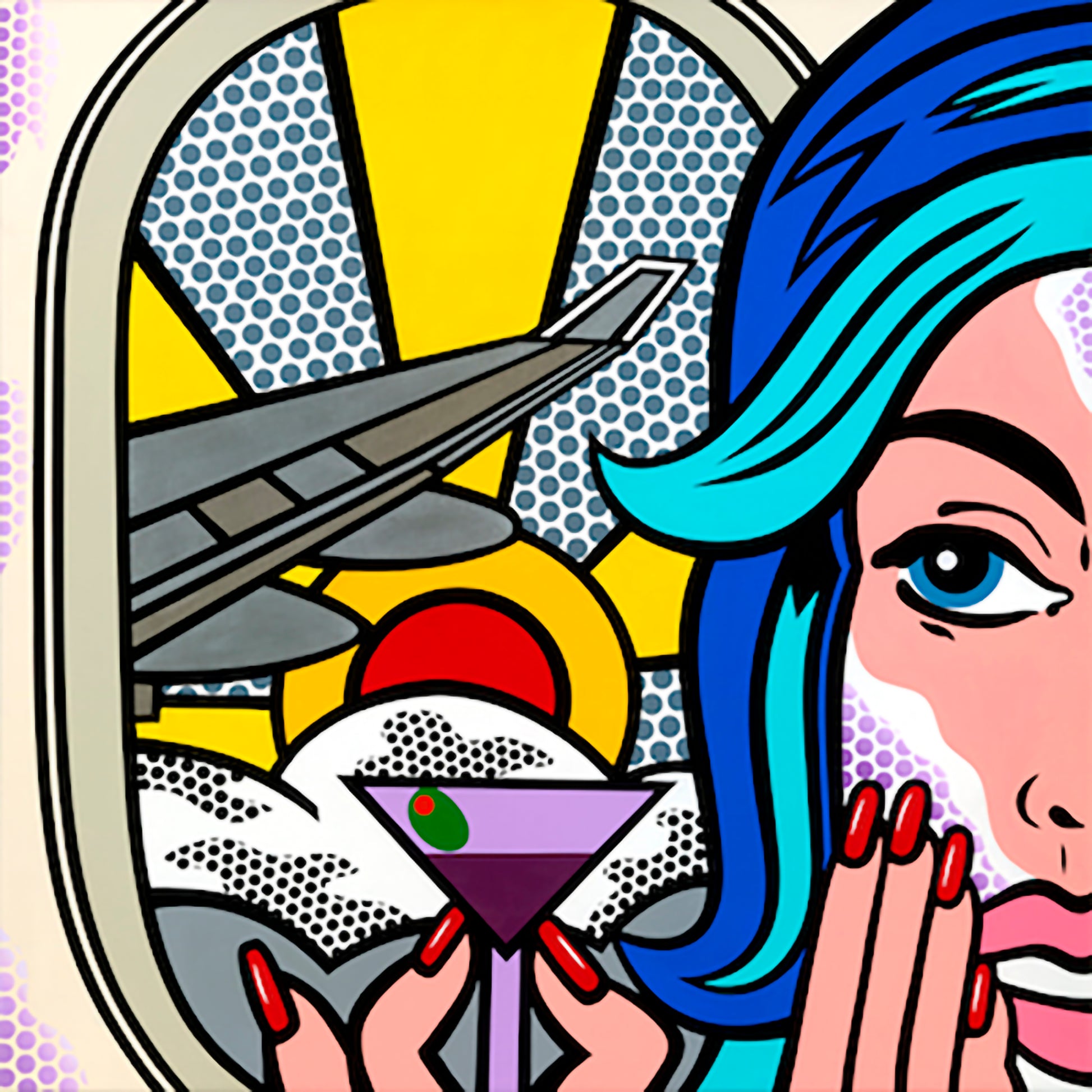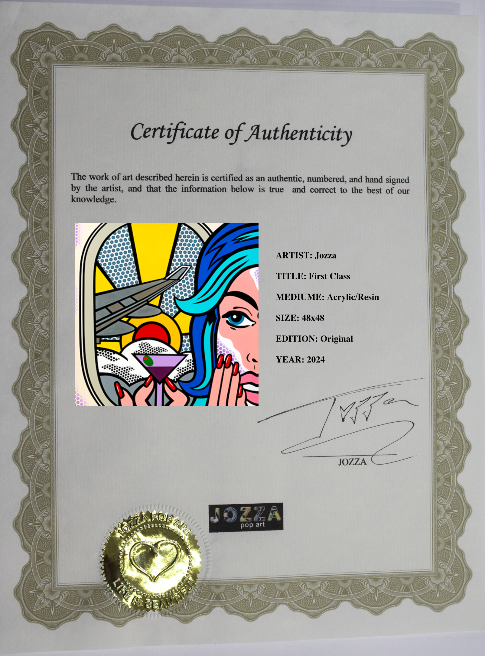 First Class, A Wall Art Painting by Jozza, Original Acrylic print on Canvas, hand signed and numbered by the artist. Jozza, born in 1958 in Hidrolandia, a small town located in central Brazil, one of the most exciting Pop Artists in the world today, creates his artistic vision with vibrant imagery and combinations of bright color and hard-edged abstract subjects. This artwork comes gallery wrapped, stretched ready to hang Size: 48"L x 48"W x 1"H. Weight is: 6Lb