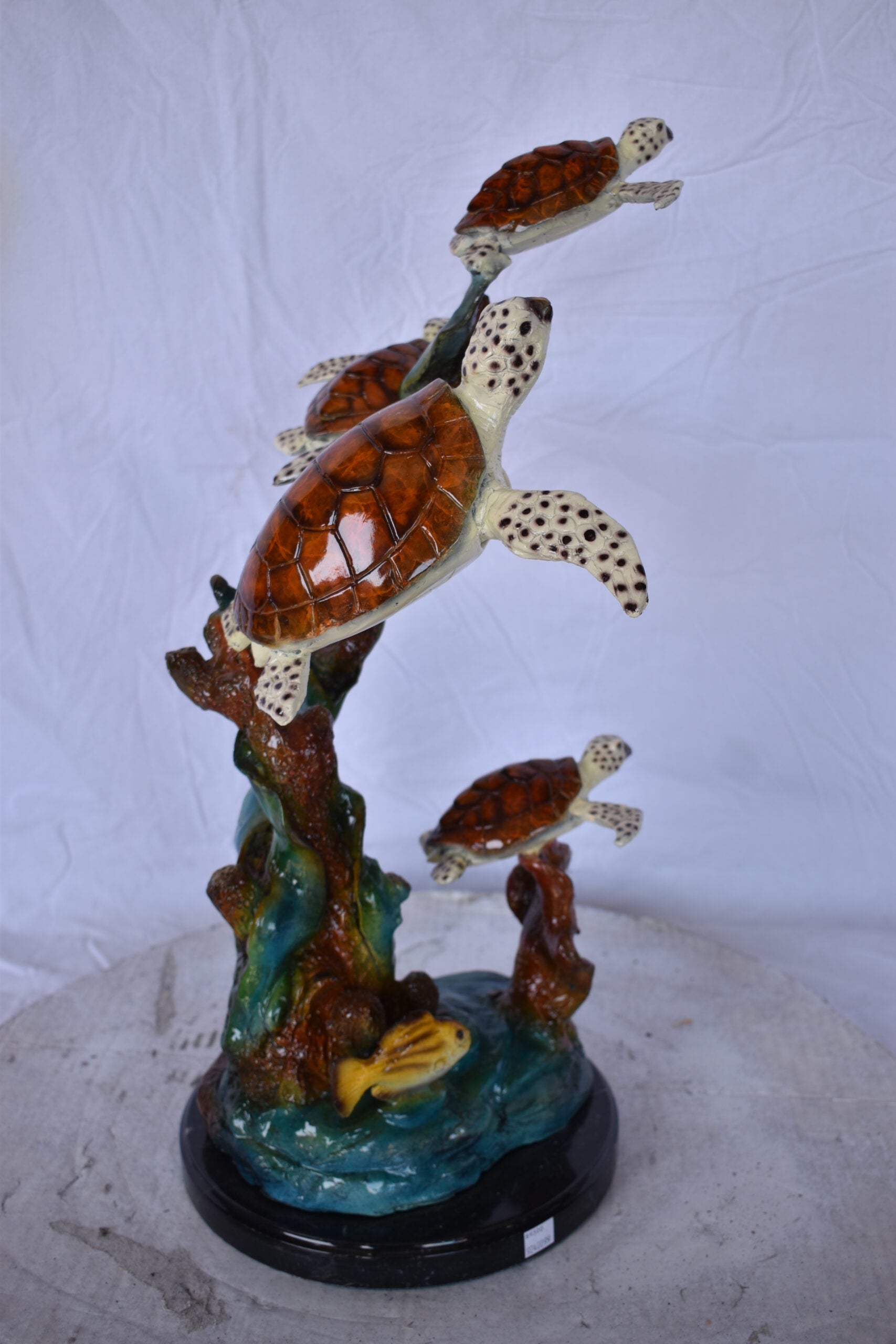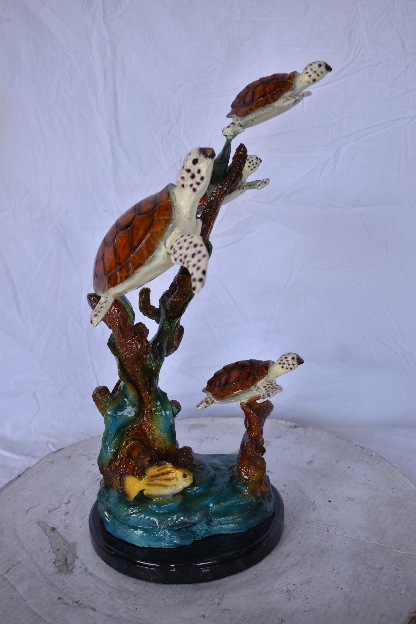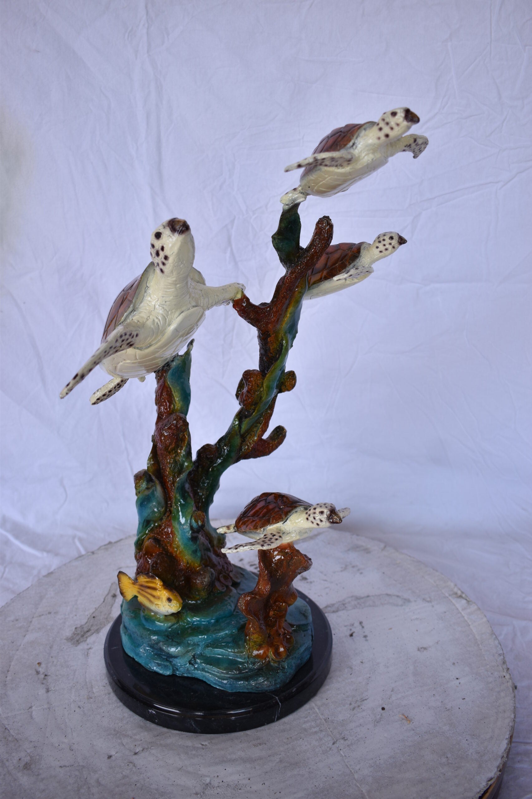 This bronze statue represents a beautiful scene of the ocean, almost taken out of Finding Nemo Movie. The 4 turtles and clownfish are displayed with bright colors through the use of enameling over bronze. This bronze statue is cast in the traditional lost-wax method, which highlights the exceptionally fine detail and guarantees lasting heirloom beauty. This bronze statue would look adorable in any space of the home of any ocean life lover. Size: 16"L x 12"W x 22"H. Weight is: 27Lb
