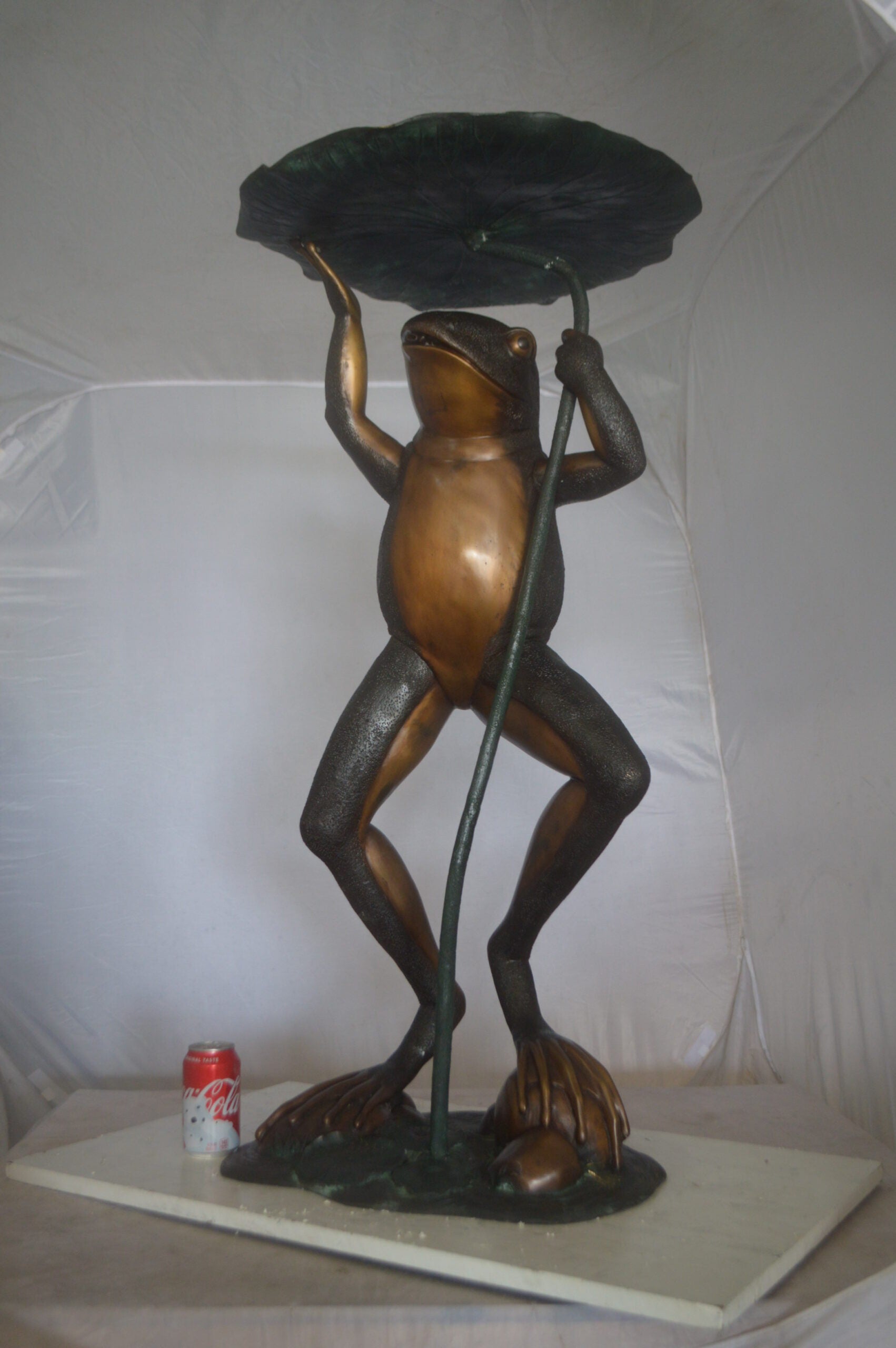 When you see this comical, piped bronze, frog statue seemingly "singing in the rain", it might just make you chuckle! This whimsical sculpture will evoke gleeful responses from all who see it. A human like frog tries to avoid getting wet by hiding under his large leaf. The statue is equipped with a hose that leads water to the top of the leaf and spills down all around the frog, with the use of a fountain pump (pump is not included). This jumbo grumpy frog will charm all visitors to his pond, and will be an endless source of amusement. Size: 22"L x 22"W x 43"H. Weight is: 60Lb