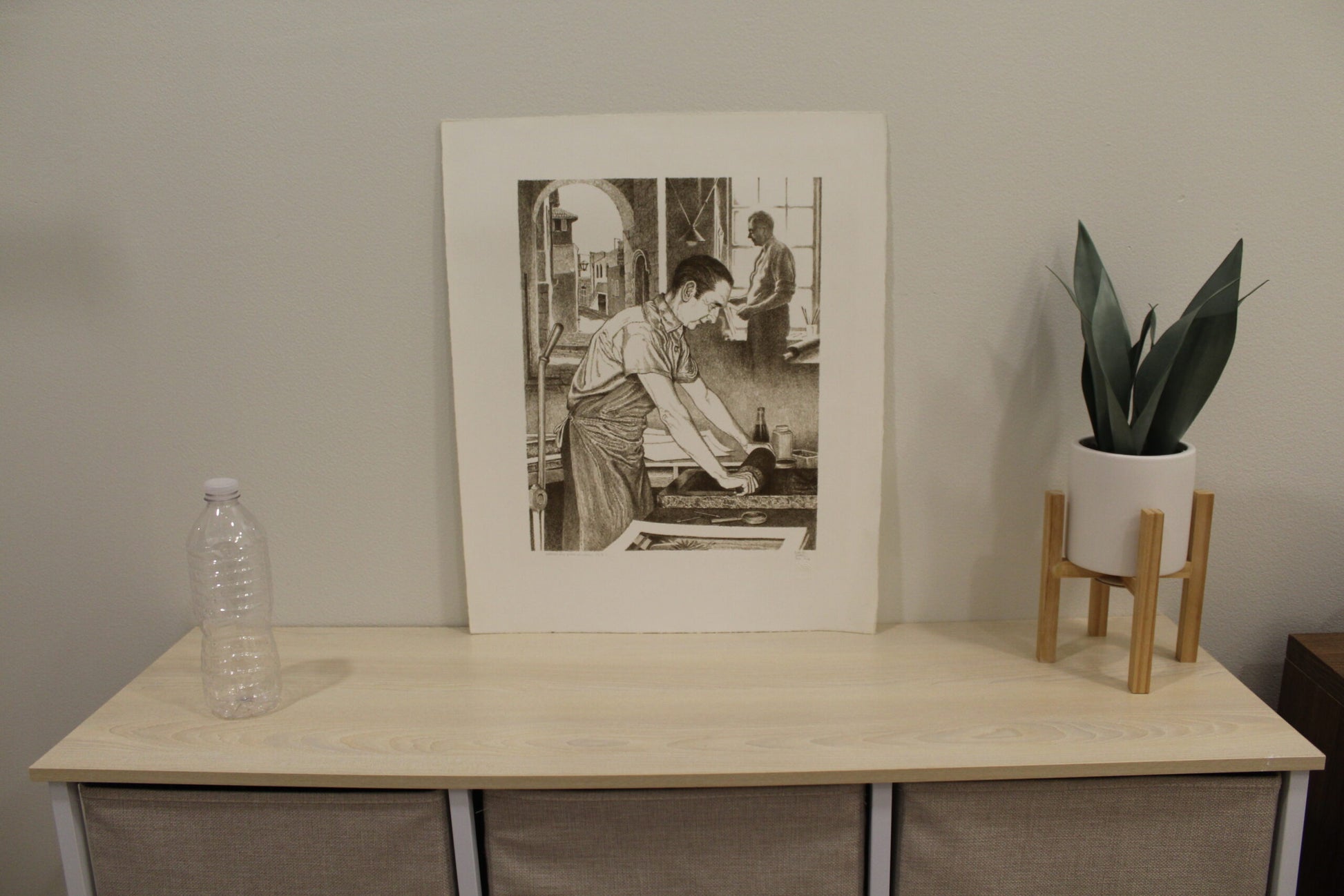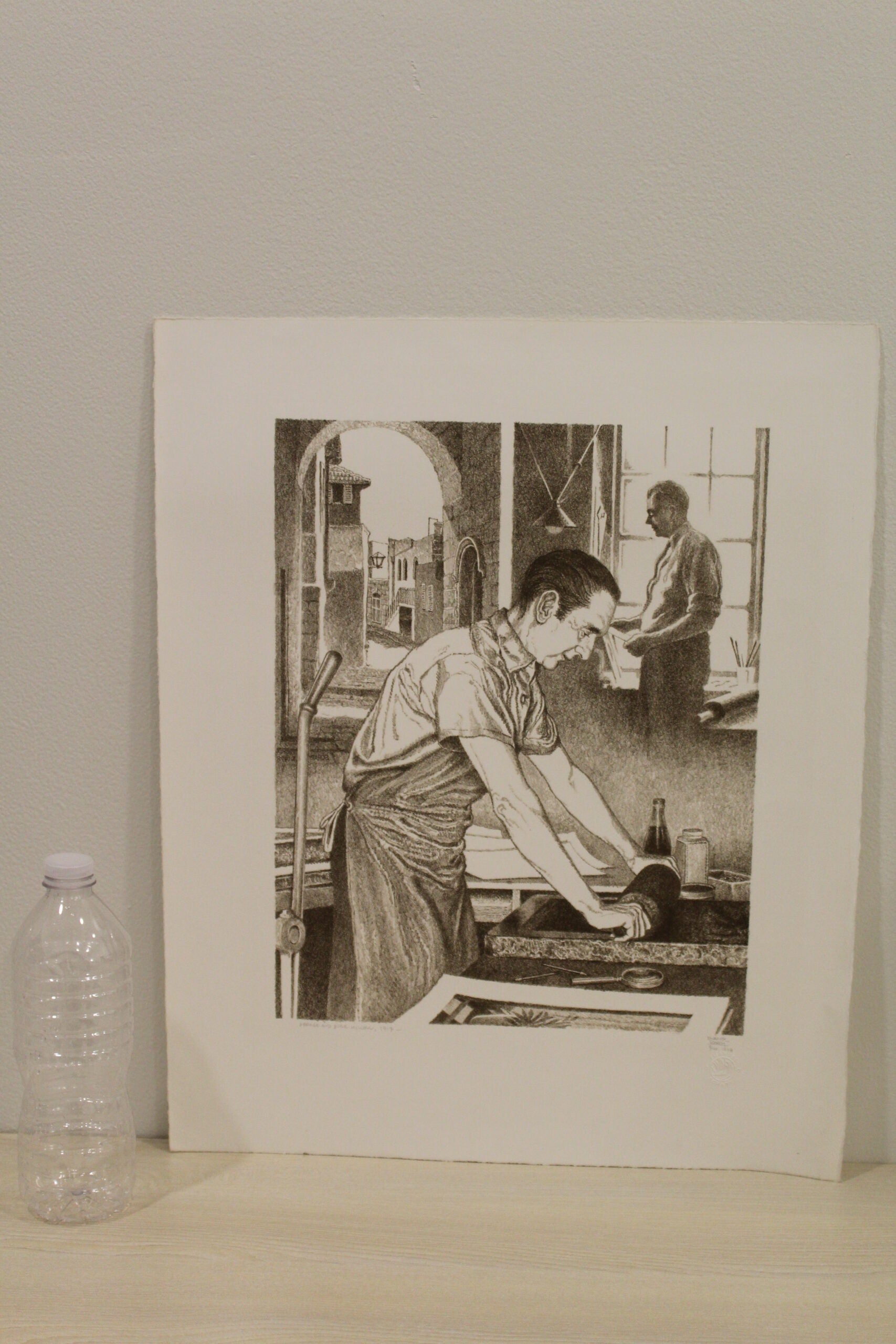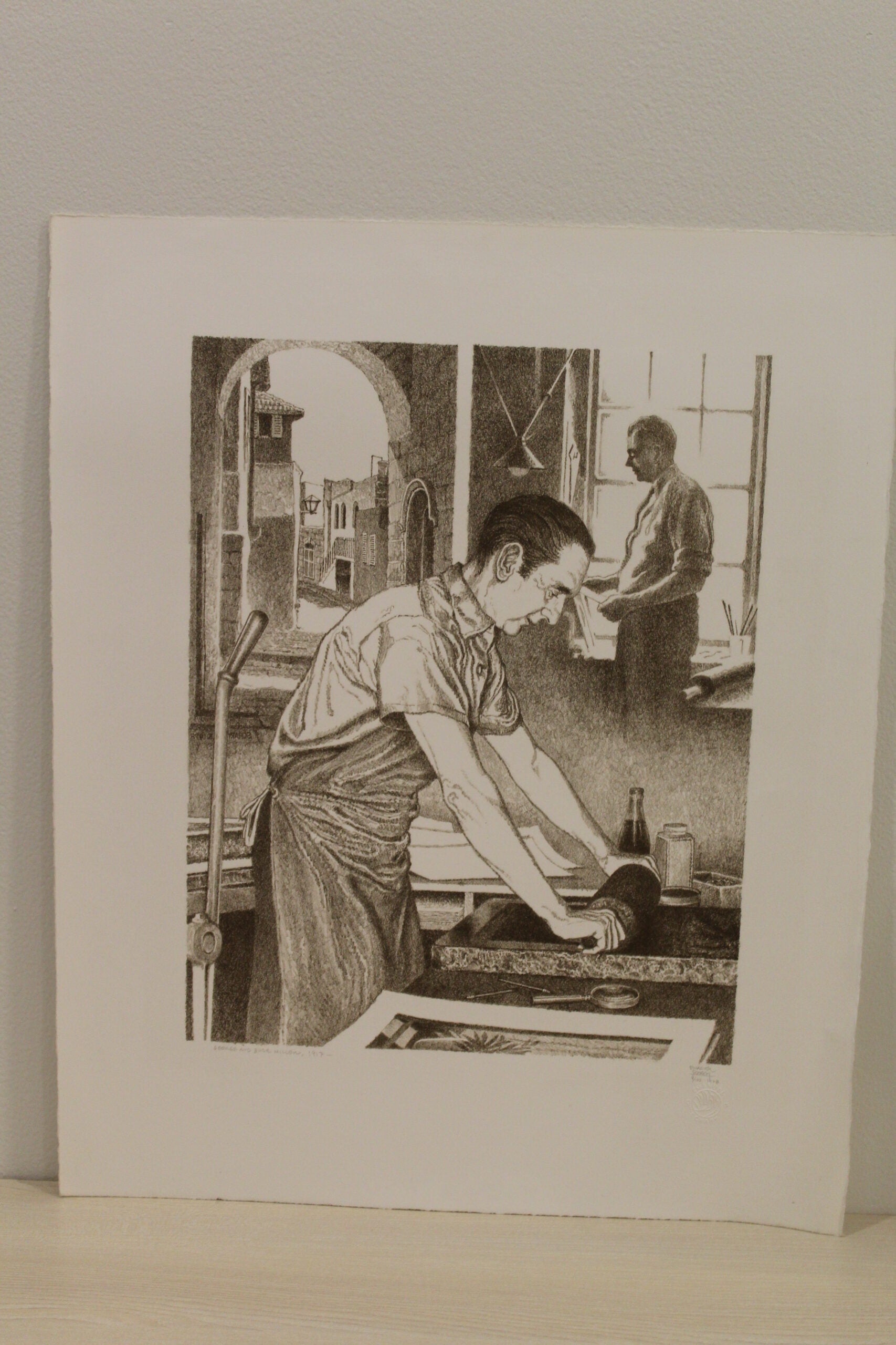 Step back to 1917 with Emanuel Schary's "George and Burr Miller." In this black and white Lithograph, witness the essence of craftsmanship as George and Burr Miller passionately print lithographs. Schary's meticulous portrayal captures the spirit of artistic dedication, immersing you in the intimate world of printmaking. Own a piece that bridges time, honoring the craft of lithography and the indelible mark of artistic legacy. Size: 11"L x 14"W x "H. Weight is: 2Lb