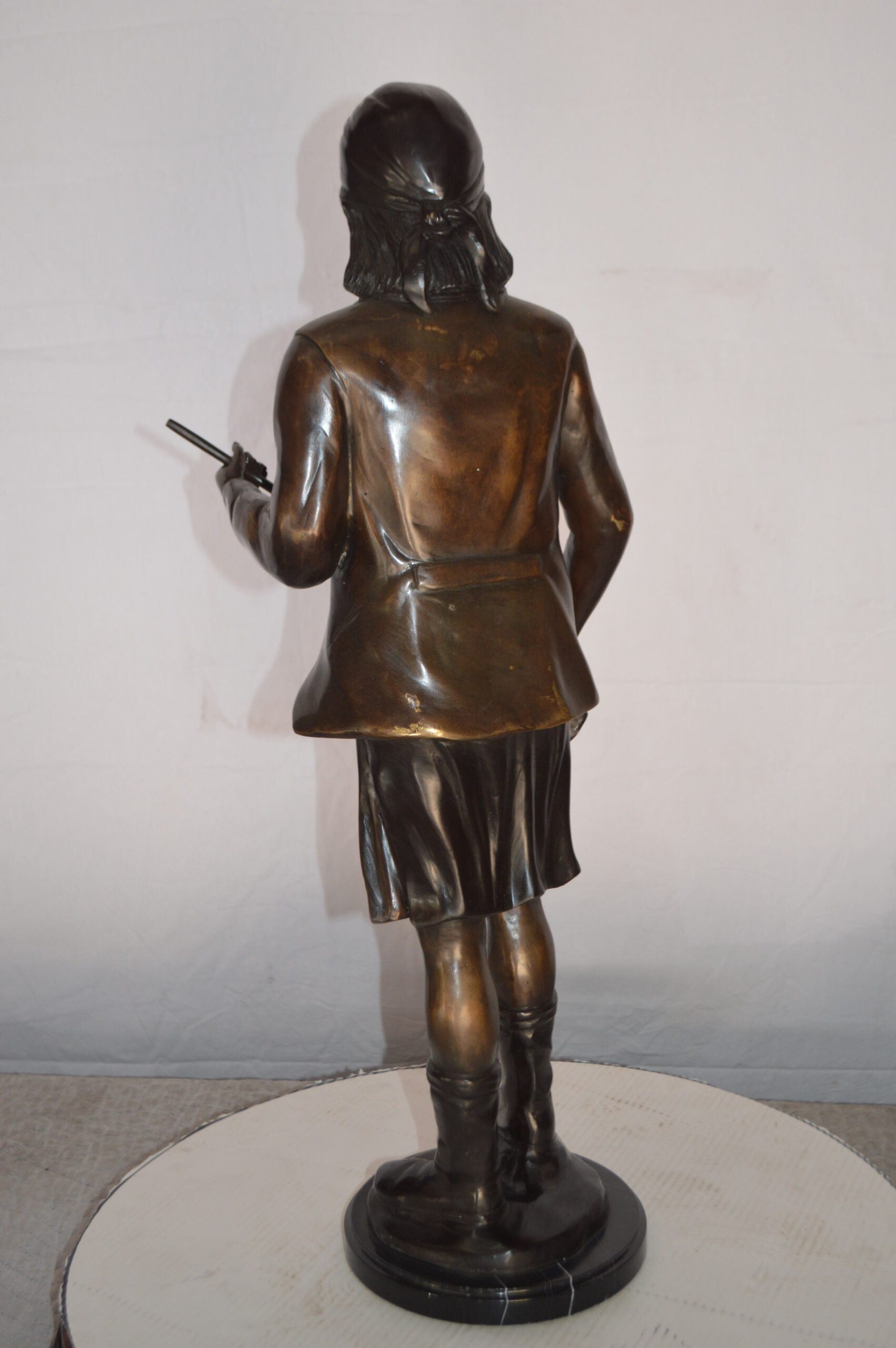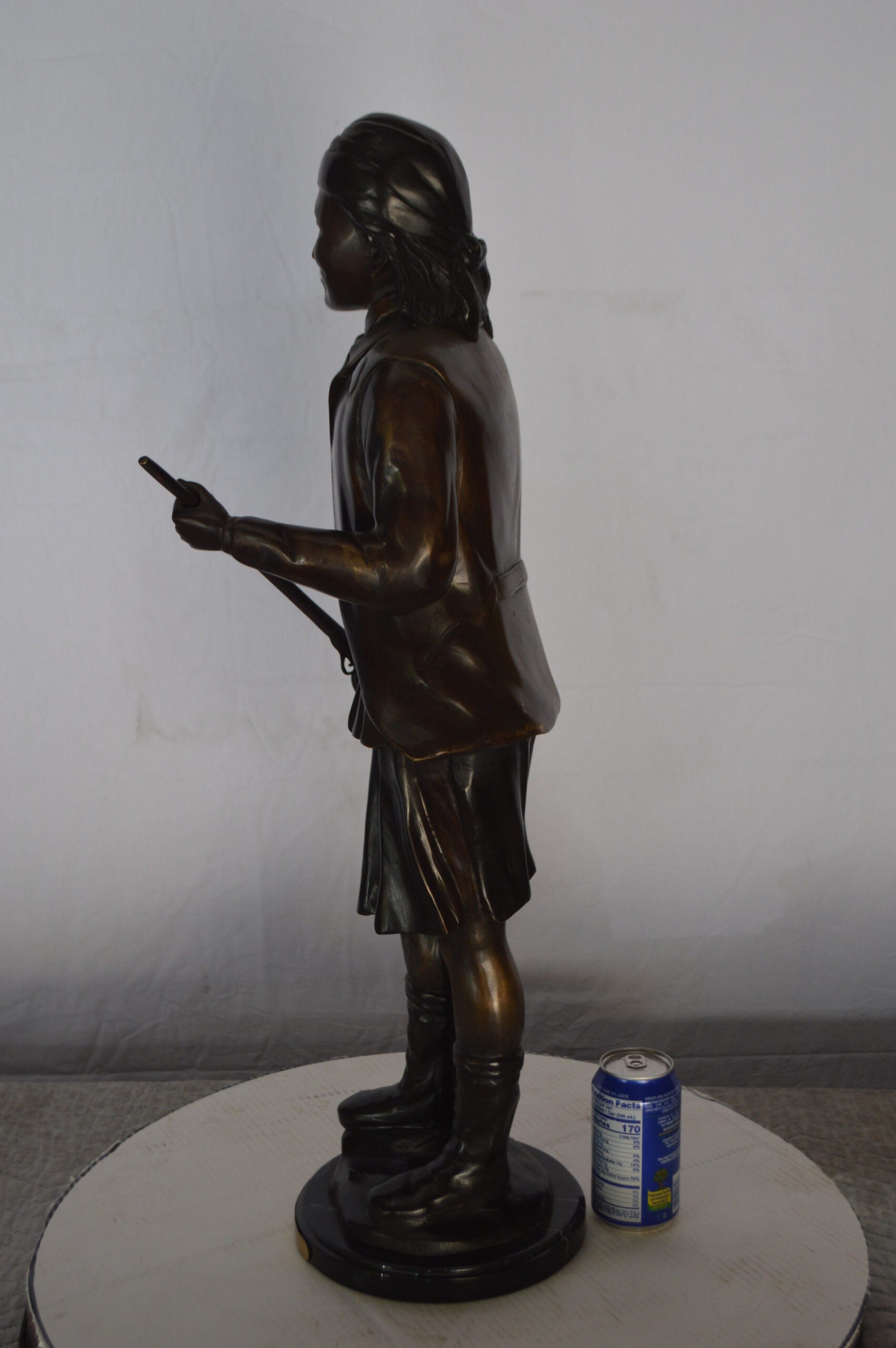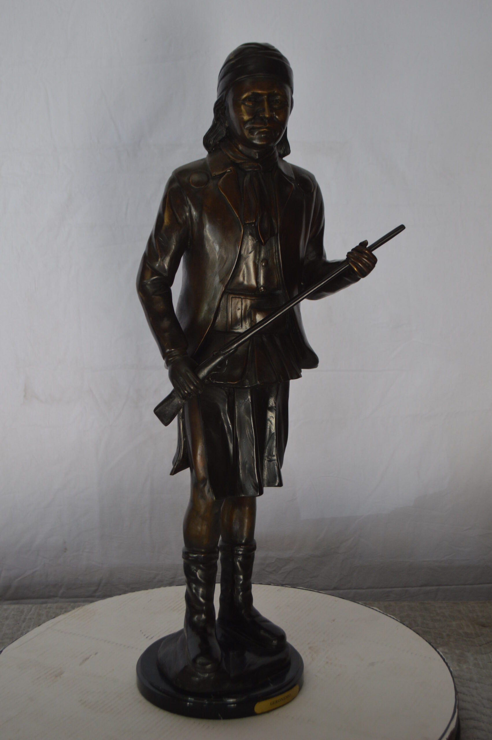 This statue depicts a multi-toned bronze statue mounted on a marble base of Geronimo. Geronimo was a prominent leader and medicine man from the Bedonkohe band of the Apache tribe. From 1850 to 1886 Geronimo joined with members of three other Chiricahua Apache bands — the Tchihende, the Tsokanende and the Nednhi — to carry out numerous raids, as well as resistance to U.S. and Mexican military campaigns in the northern Mexico states of Chihuahua and Sonora, and in the southwestern American territories of New Mexico and Arizona. Geronimo's raids and related combat actions were a part of the prolonged period of the Apache–United States conflict, which started with American settlement in Apache lands following the end of the war with Mexico in 1848. The statue’s detailed face and body is finished with the traditional, hand-rubbed bronze finish truly bring this beautiful bronze statue to life. This bronze statue is cast in the traditional lost-wax method, which highlights the exceptionally fine detail and guarantees lasting heirloom beauty. Size: 10"L x 8"W x 31"H. Weight is: 23Lb