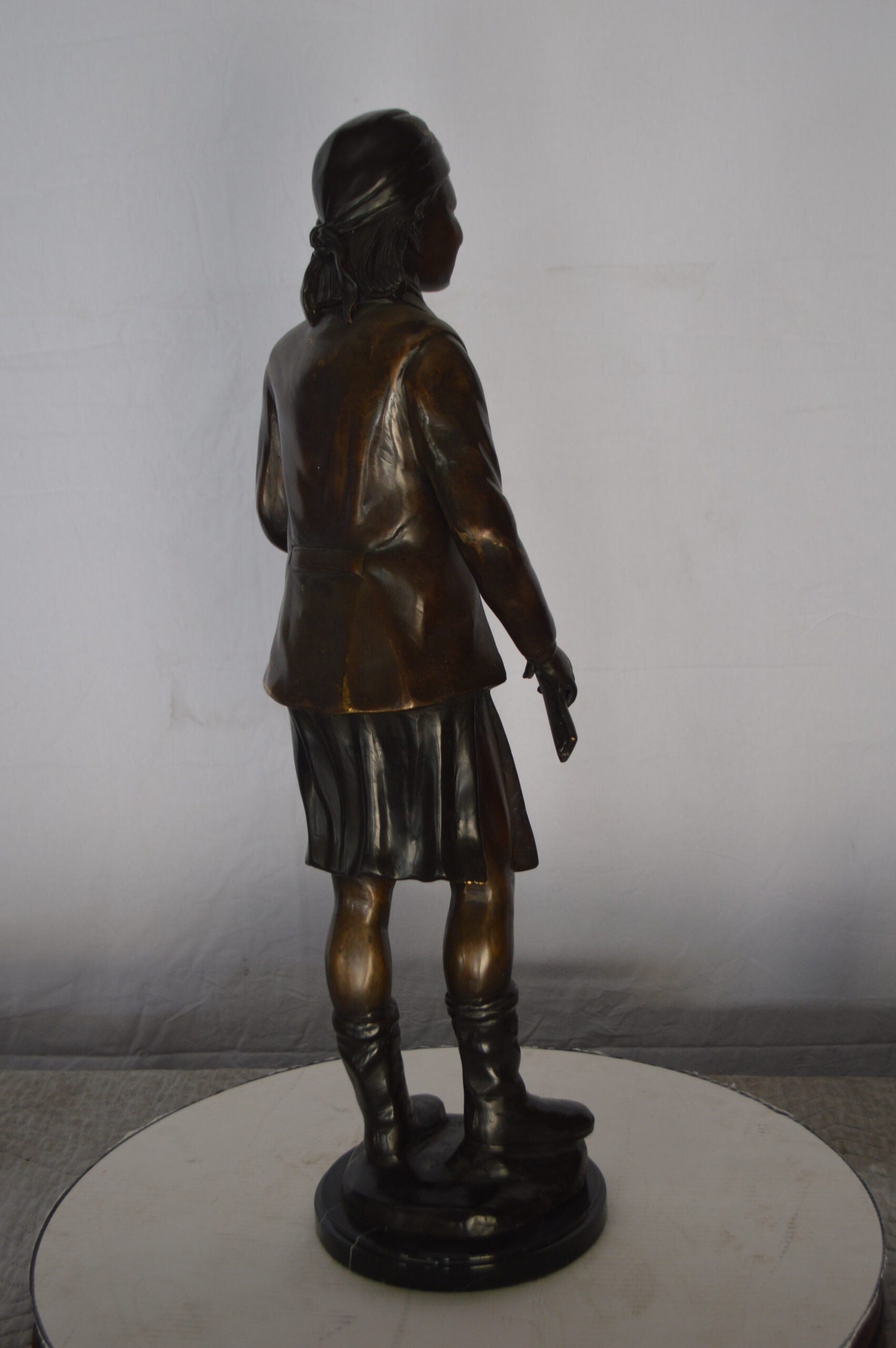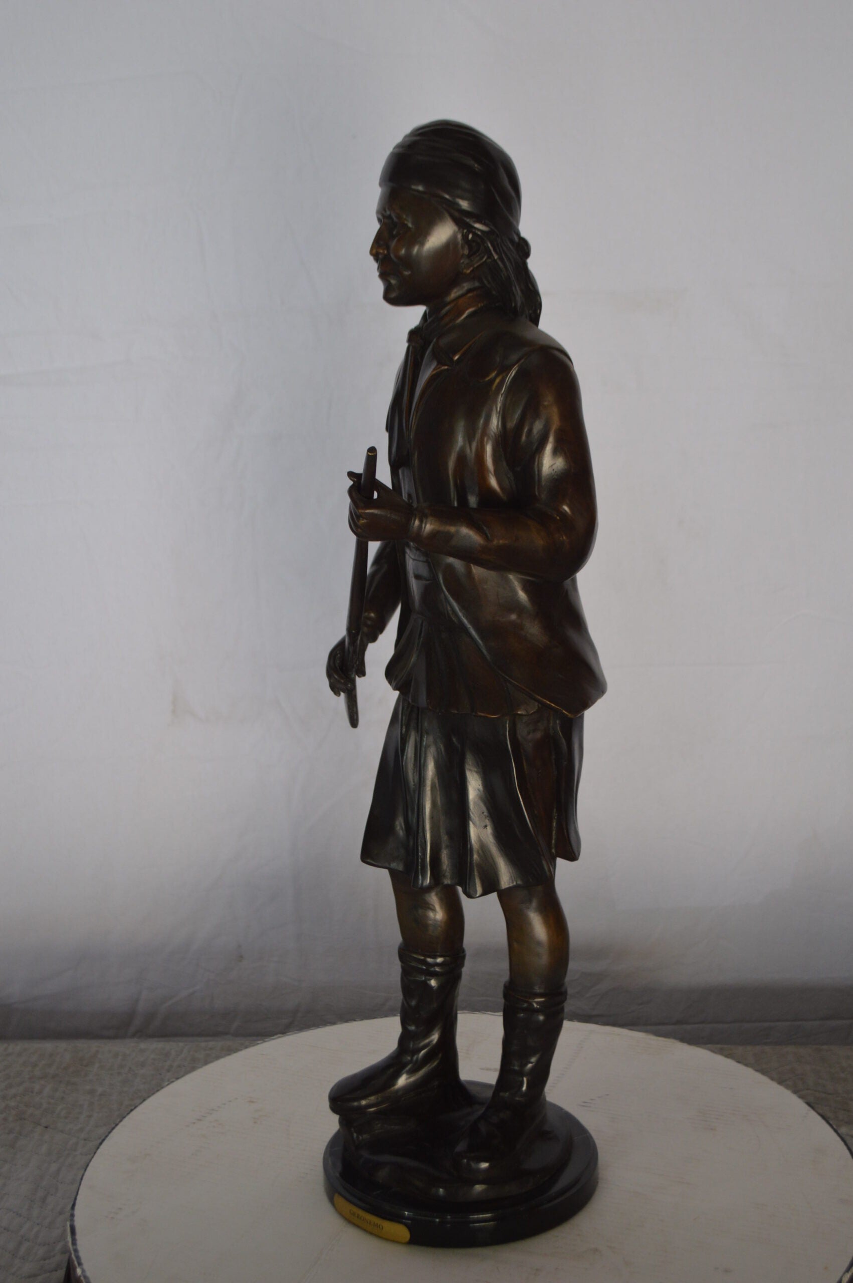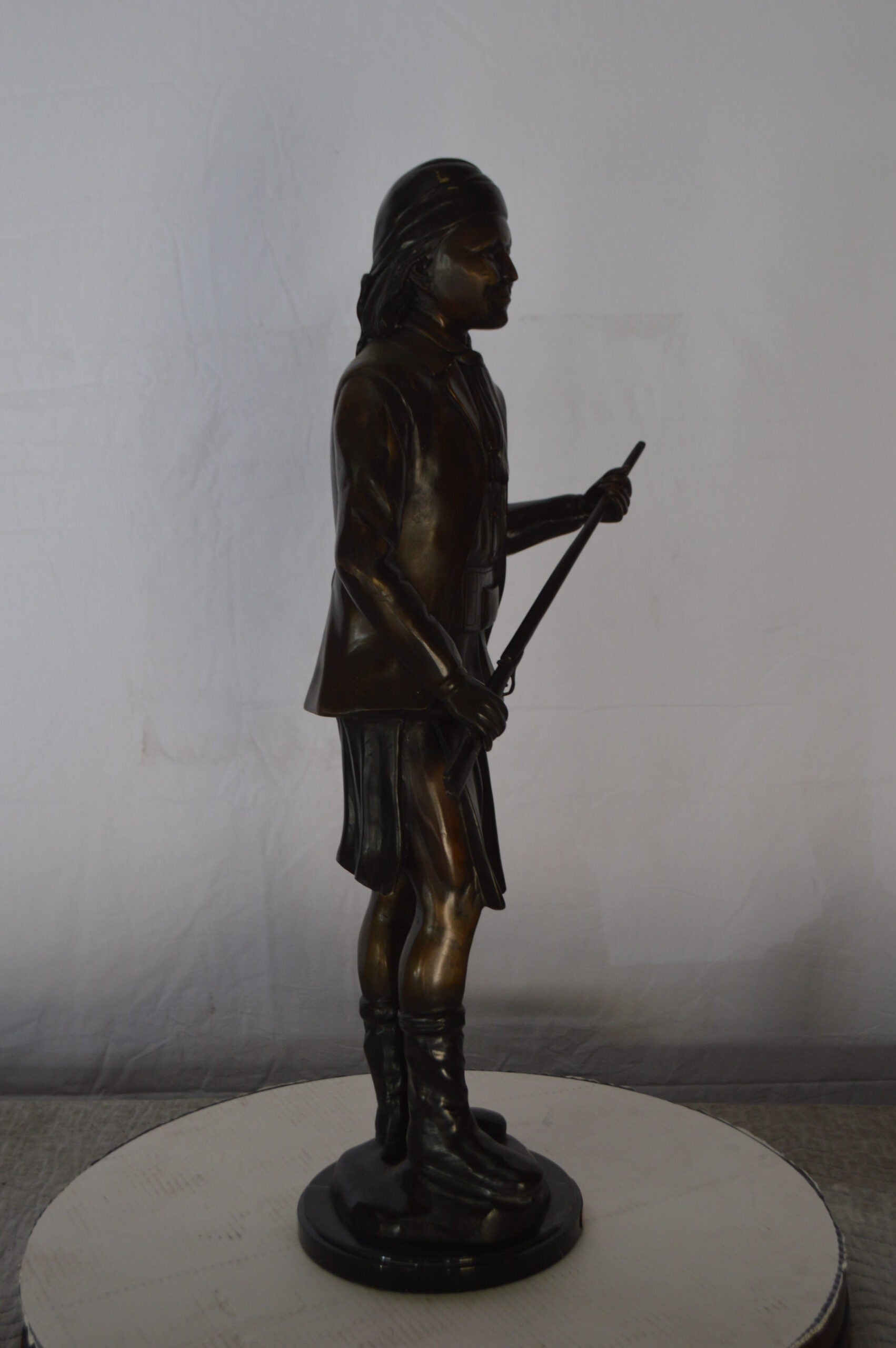 This statue depicts a multi-toned bronze statue mounted on a marble base of Geronimo. Geronimo was a prominent leader and medicine man from the Bedonkohe band of the Apache tribe. From 1850 to 1886 Geronimo joined with members of three other Chiricahua Apache bands — the Tchihende, the Tsokanende and the Nednhi — to carry out numerous raids, as well as resistance to U.S. and Mexican military campaigns in the northern Mexico states of Chihuahua and Sonora, and in the southwestern American territories of New Mexico and Arizona. Geronimo's raids and related combat actions were a part of the prolonged period of the Apache–United States conflict, which started with American settlement in Apache lands following the end of the war with Mexico in 1848. The statue’s detailed face and body is finished with the traditional, hand-rubbed bronze finish truly bring this beautiful bronze statue to life. This bronze statue is cast in the traditional lost-wax method, which highlights the exceptionally fine detail and guarantees lasting heirloom beauty. Size: 10"L x 8"W x 31"H. Weight is: 23Lb
