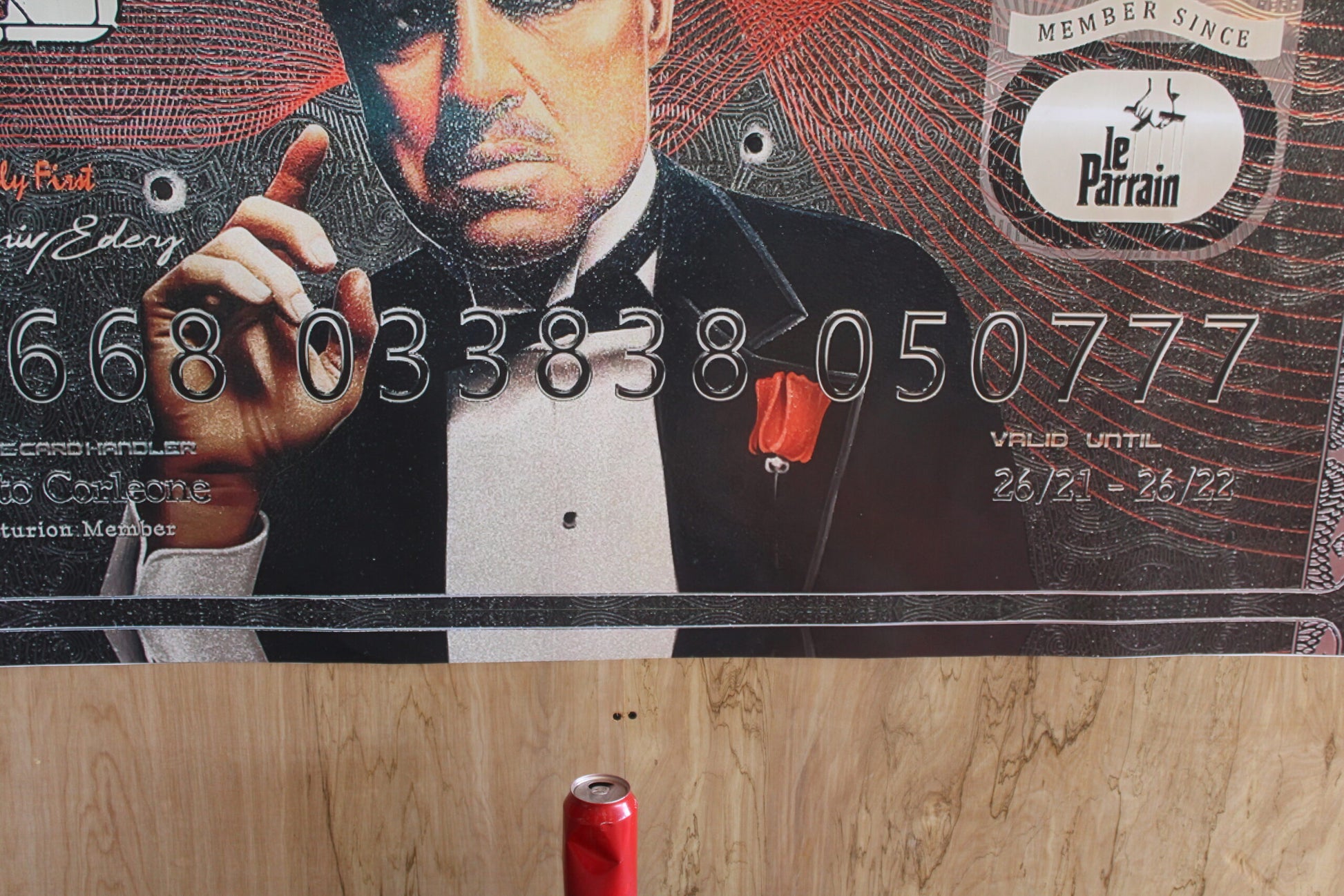 Shipped rolled, this canvas features the iconic Don Carleon from The Godfather, immortalized on an AMEX credit card. A masterful blend of cinematic legacy and modern art, it offers a unique commentary on power and wealth. This visually compelling piece transcends genres, making it an intriguing addition to any art aficionado's collection. Size: 43"L x 64"W x 1"H. Weight is: 5Lb