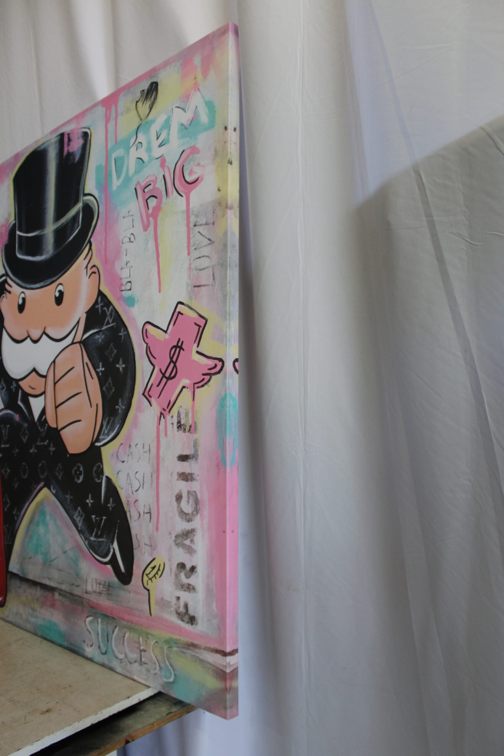 This giant canvas of Monopoly Man is a beautiful work of popular art in which detail, modern consideration, and color are combined elegantly. This work of art would look wonderful in any modern art lovers home or office space. It would also be a wonderful gift for a friend appreciative of art. The painting is stretched and ready to hang. Size: 56"L x 56"W x 1"H. Weight is: 15Lb