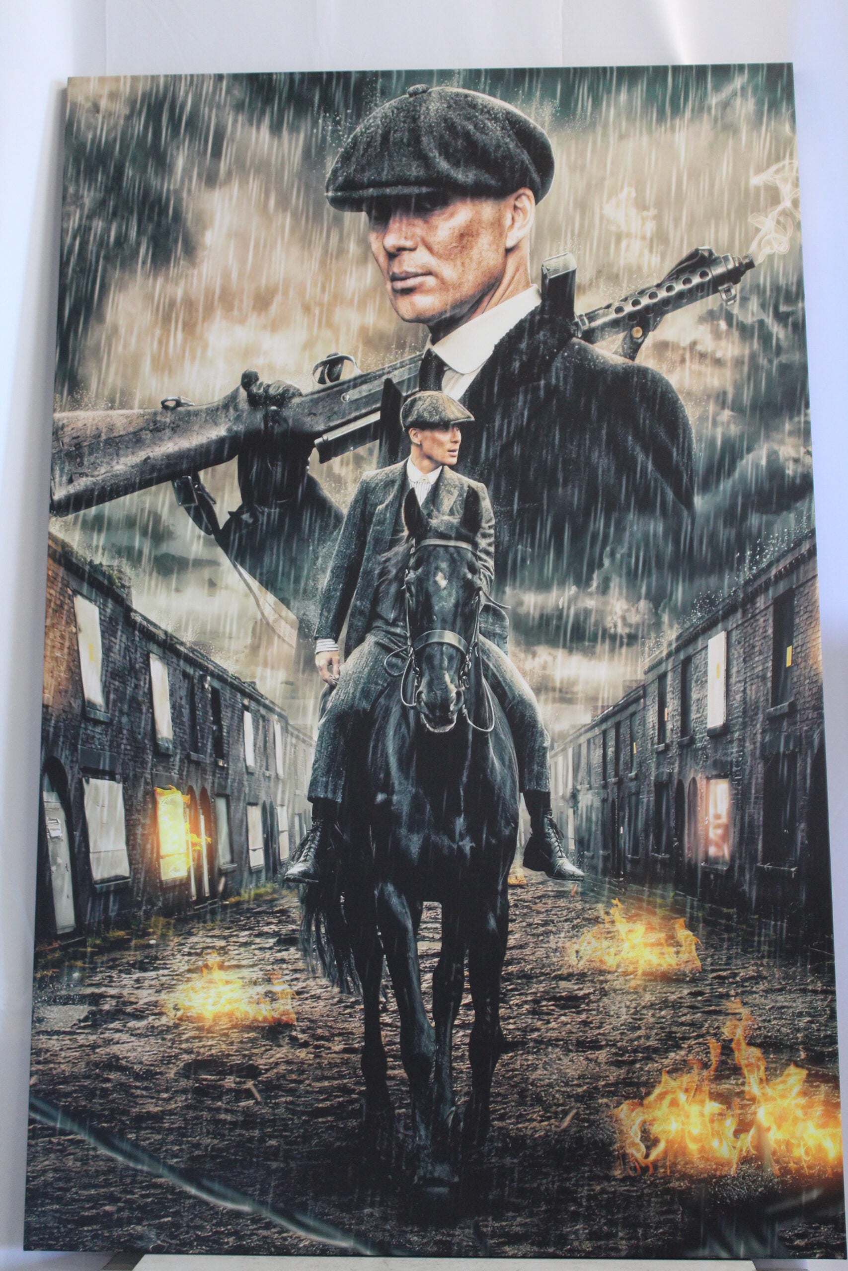 This detailed painting displays the character Tommy from the show Peaky Blinders, in which he's on his horse amidst burning rubble in the backdrop. This painting is framed and ready to hang, and is an ideal work of art for those who love the show Peaky Blinders. Size: 70"L x 45"W x 1"H. Weight is: 15Lb