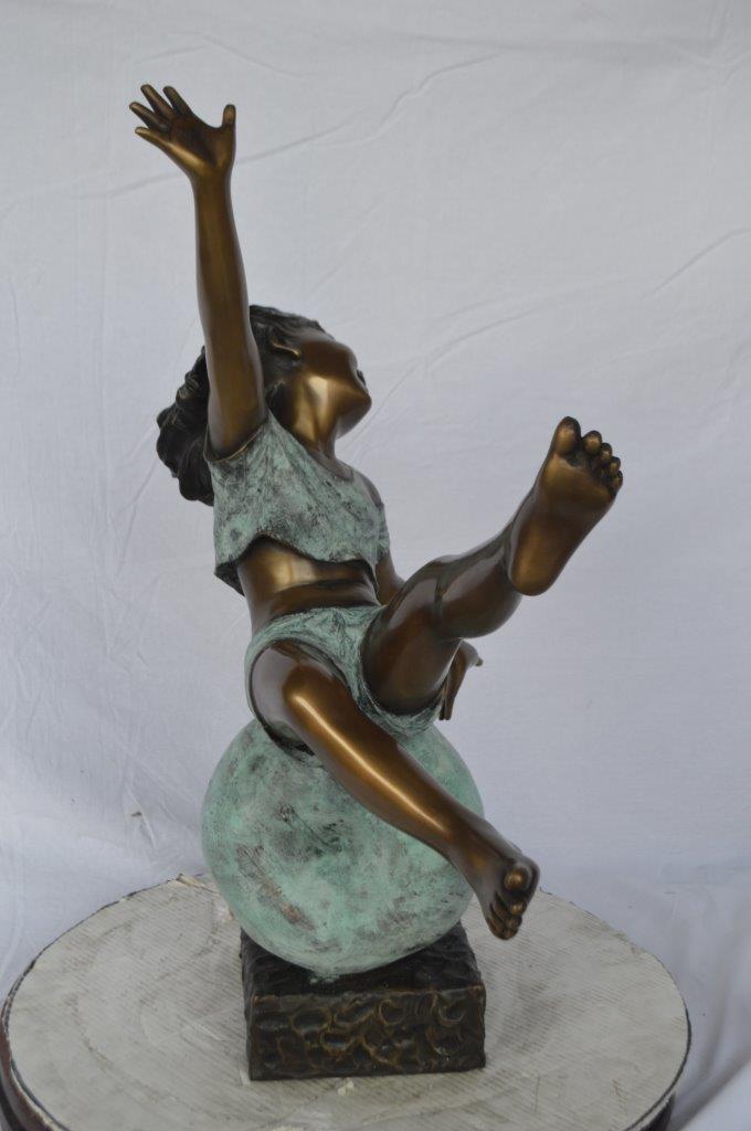 This girl is having a grand time. She is in a precious pose atop an apple, a metaphor for knowledge and the innocence of a child. The intricate details on her face show that she is very happy and enjoying herself. This statue is cast using the "Lost Wax" method with a patina finish. This is a great addition to any art enthusiast's home, patio, or garden. Size: 22"L x 9"W x 31"H. Weight is: 30Lb