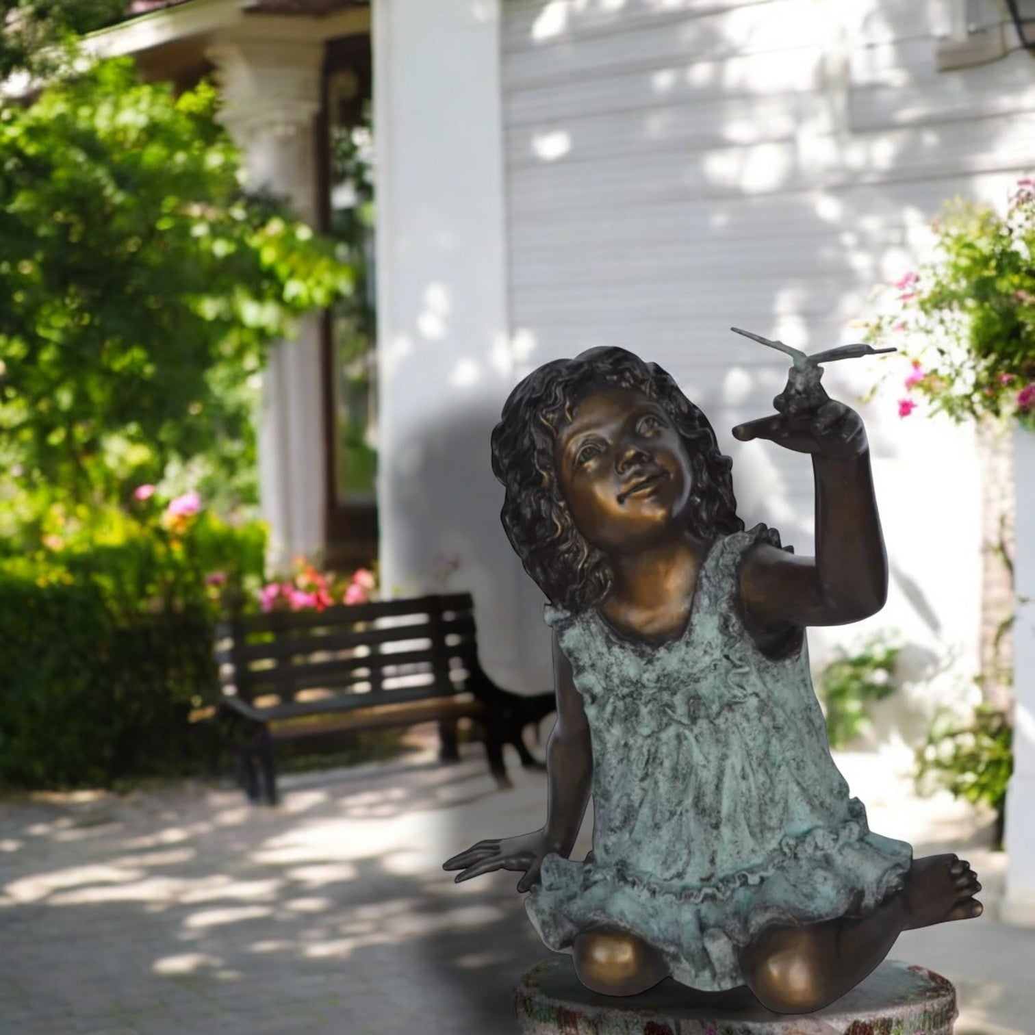 This charming life size statue of a girl playing outside with a butterfly, depicts childhood play and spend time like in the old days (when kids did not have smartphones). This is a beautiful bronze statue stained in green and brown patina with clear finish for preservation. This bronze statue is museum quality and hand-cast in high-quality pure bronze using the Lost Wax Process of bronze casting. Size: 21"L x 15"W x 19"H. Weight is: 31Lb