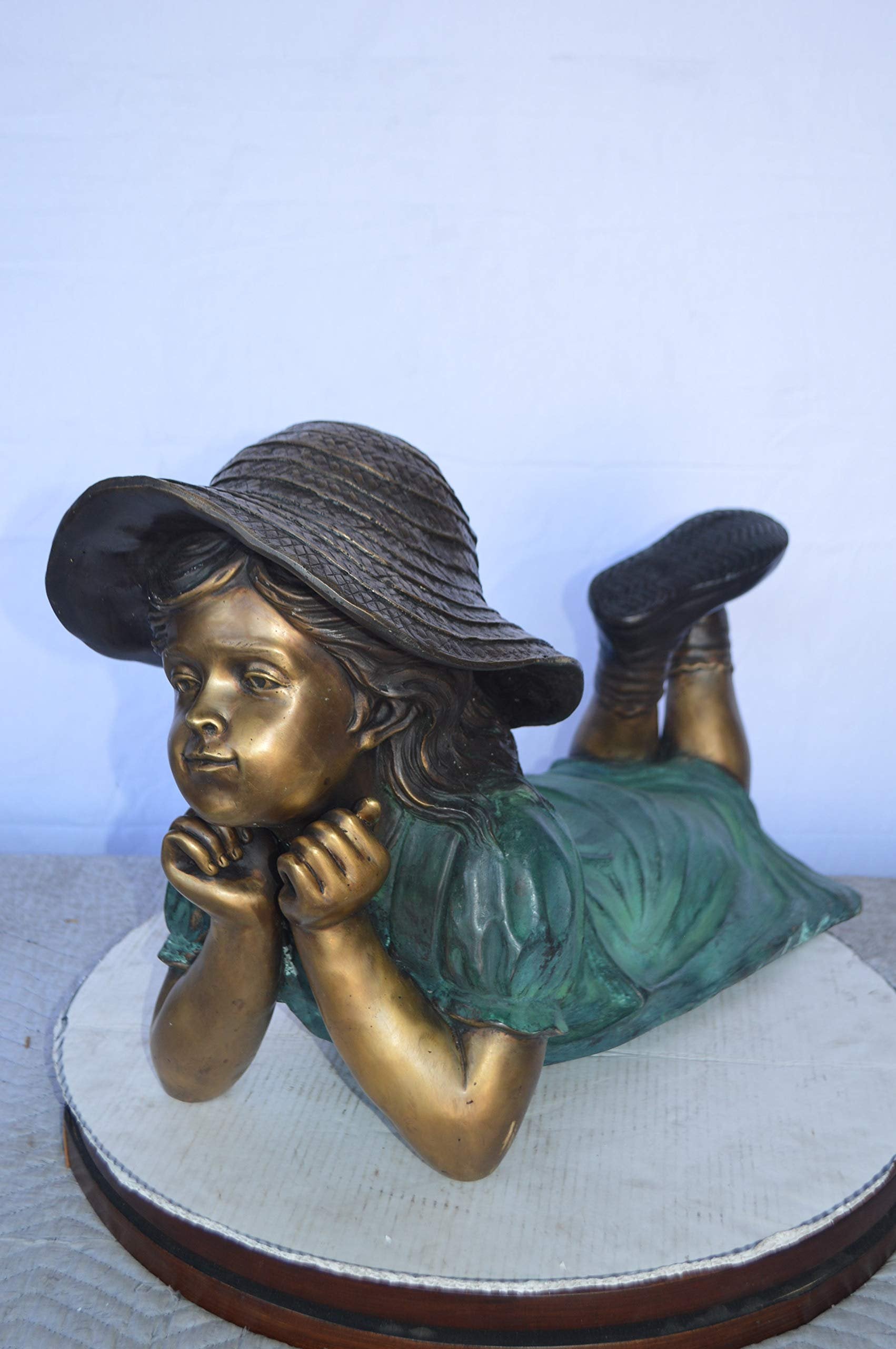 This charming large size bronze statue depicts a little girl wearing a hat lying on her Stomach. This very fine and unique abstract was casted using the ancient old Lost Wax Method. The patina chosen for this timeless Creation is stained in green and brown patina with a clear finish for preservation, handmade from pure bronze. This beautiful bronze-cast statue will be a valuable addition to any area of the home, office, patio, or garden. Size: 33"L x 17"W x 17"H. Weight is: 47Lb